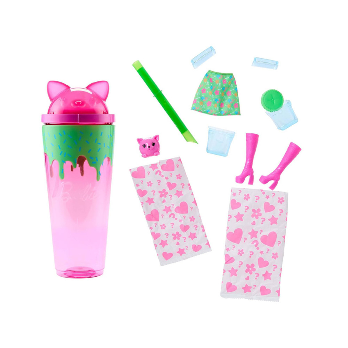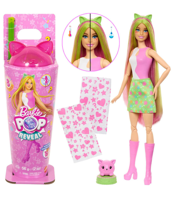 Viduje yra Barbie su ryškiai rožiniais ir žaliais plaukais, su subtiliu vaisių kokteilio kvapu, besišypsanti ir pasiruošusi žaidimui. Jai kompaniją palaiko minkštas katinas, kuris ne tik atrodo mielai, bet ir maloniai kvepia. Komplekte taip pat yra: patogi guolis augintiniui ir galvos apdangalas su katiniškomis ausimis, puikiai tinkantis Barbie stiliui.