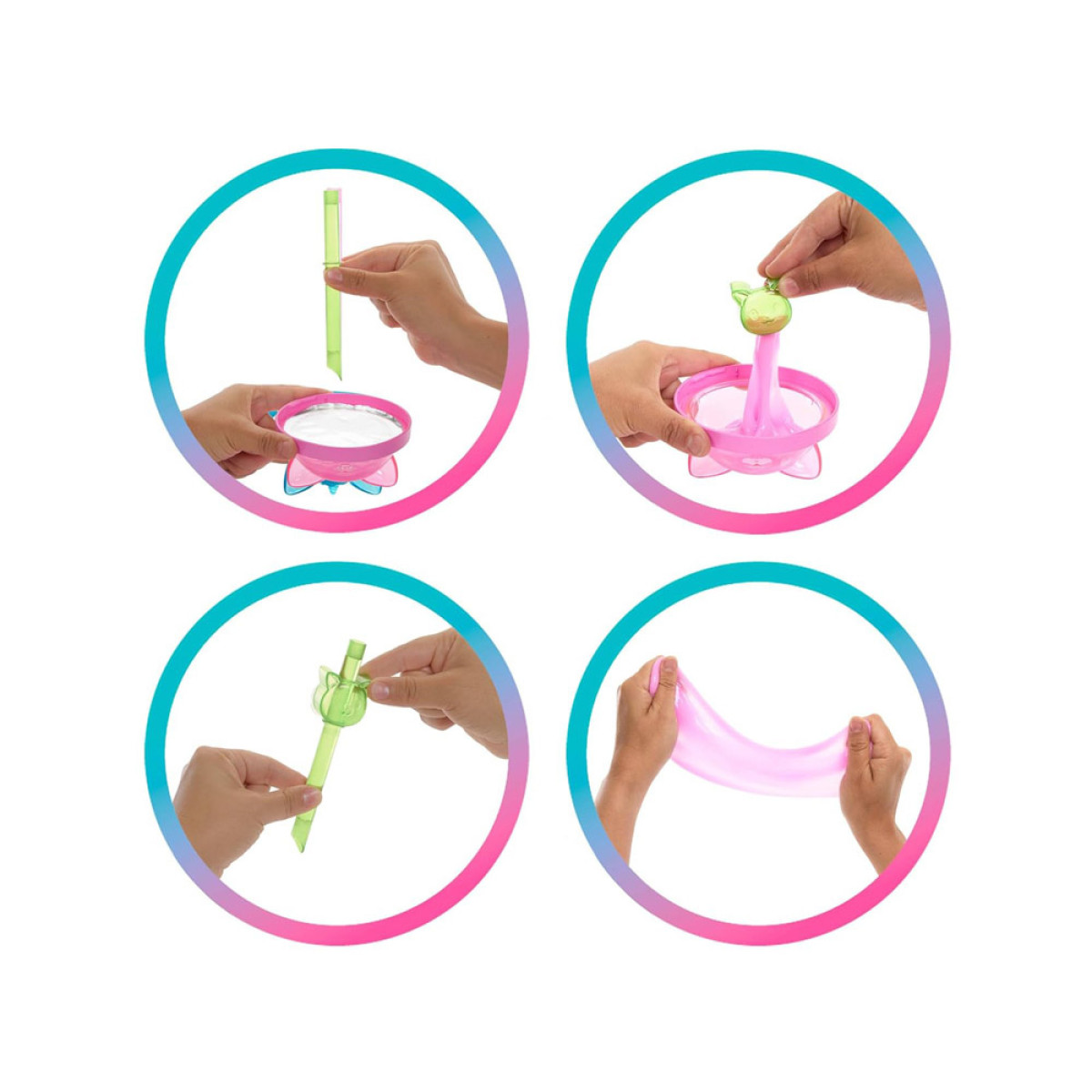 Rinkinys slepia net 8 elementus atradimui, kurie įtrauks vaiką į saldų kvapų, spalvų ir mielų detalių pasaulį. Pakuotė turi skaidrų dangtelį su katiniškomis ausimis – nuėmus jį, vaikai atras blizgančią gleivę, minkštą ir lankstą, teikiančią daugybę džiaugsmo žaidžiant.