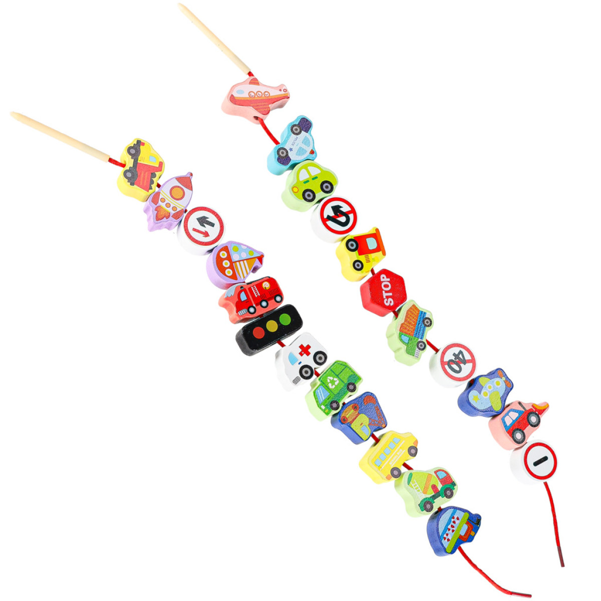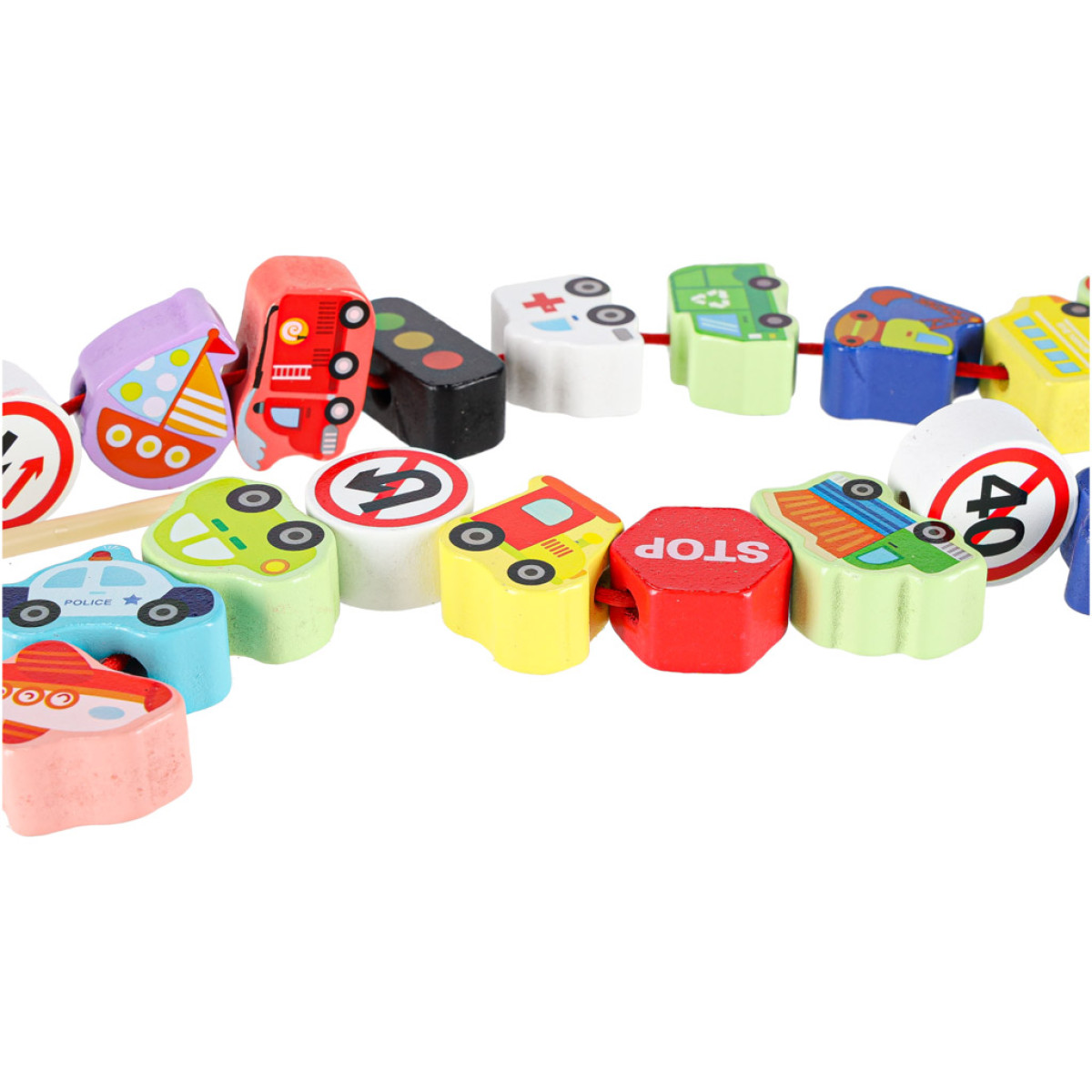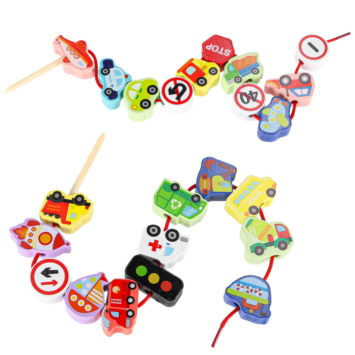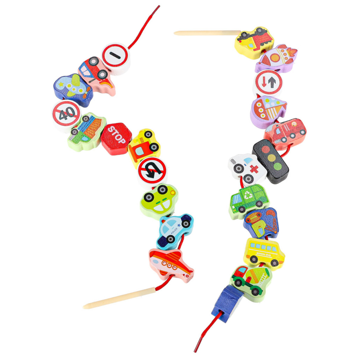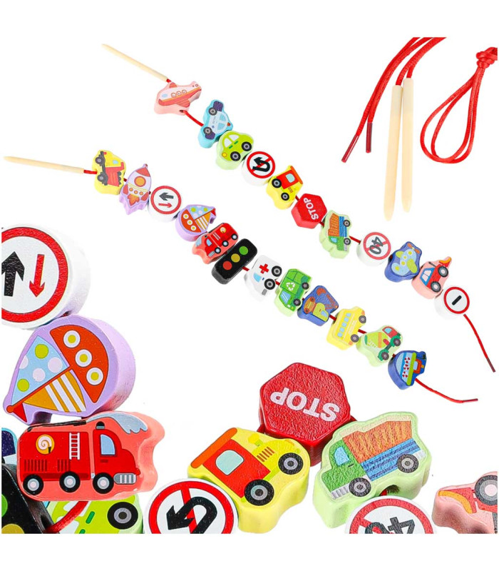 - Elementų skaičius: 23 medinės kaladėlės + 2 siūlai su vėrimais