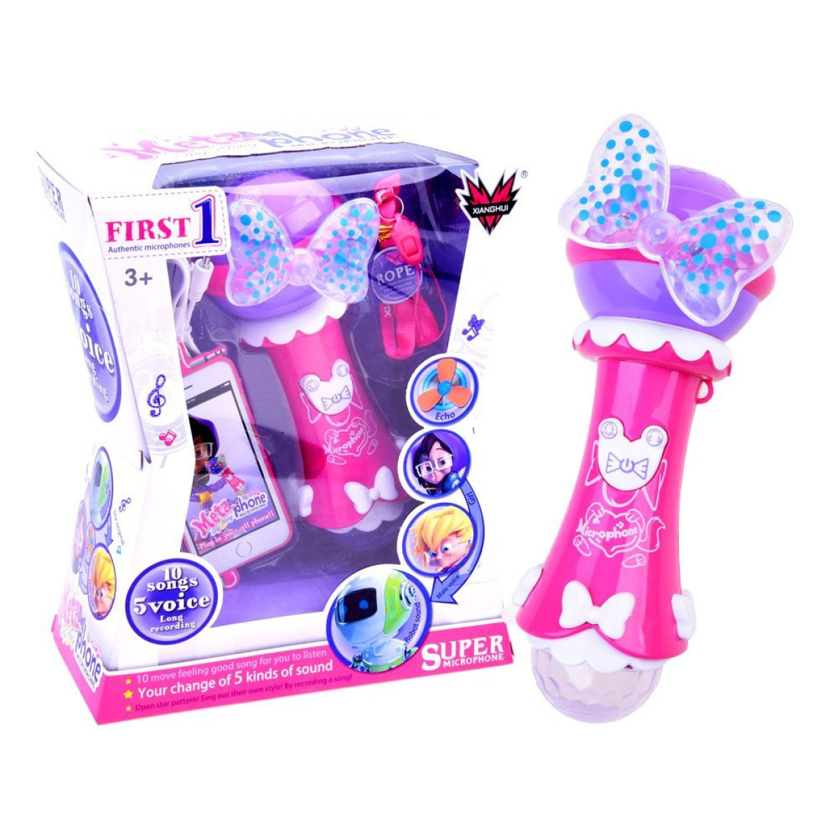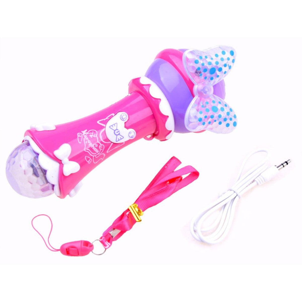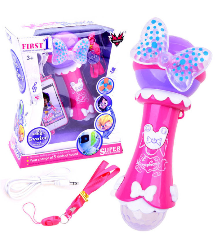Vaikiškas karaoke mikrofonas su įrašymo funkcija leidžia vaikams įgyvendinti svajonę tapti tikra žvaigžde. Kiekviena maža mergaitė galės dainuoti kaip mėgstama dainininkė. Dainavimas su karaoke mikrofonu yra puiki pramoga ir džiaugsmas kasdien, o galbūt net ir talento atradimas! Mikrofonas turi įrašymo ir atkūrimo funkcijas, taip pat MP3 įvestį, leidžiančią dainuoti mėgstamas dainas su originaliu fonu. Mikrofonas suteikia galimybę pakeisti vaiko balsą į penkis skirtingus stilius, kas gali paįvairinti kiekvieną žaidimą. Papildoma atrakcija yra šviesos efektai, mirksinti kaspinėlis ir kamuoliukas mikrofono apačioje. Vaikams, kurie dievina muziką, taip pat rekomenduojame tokį produktą kaip žaislinė elektrinė gitara.