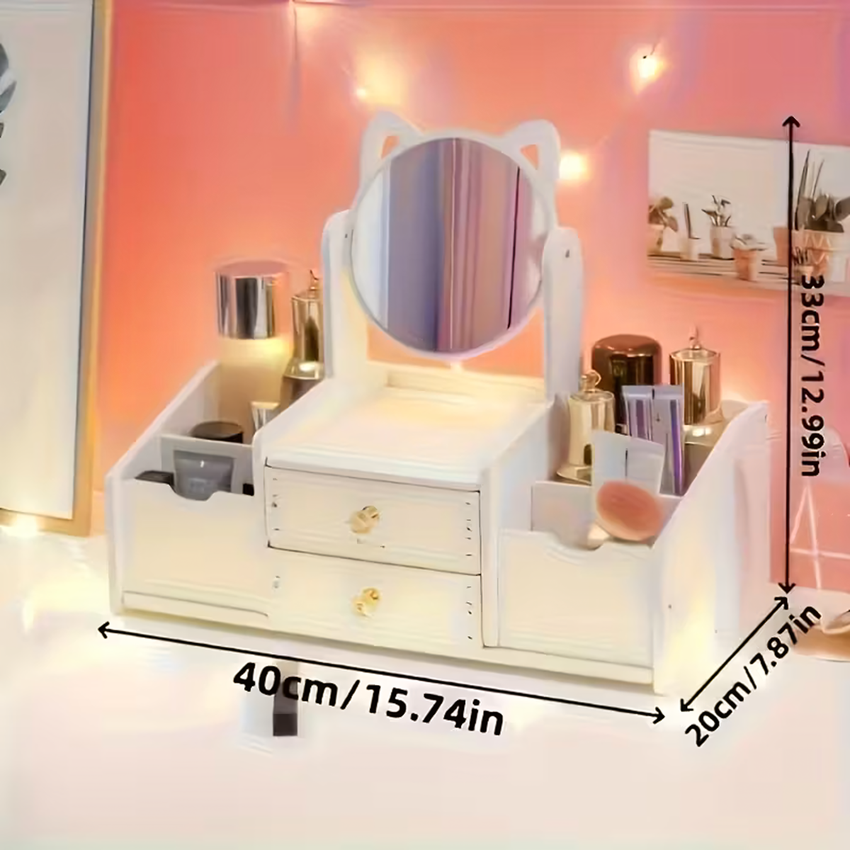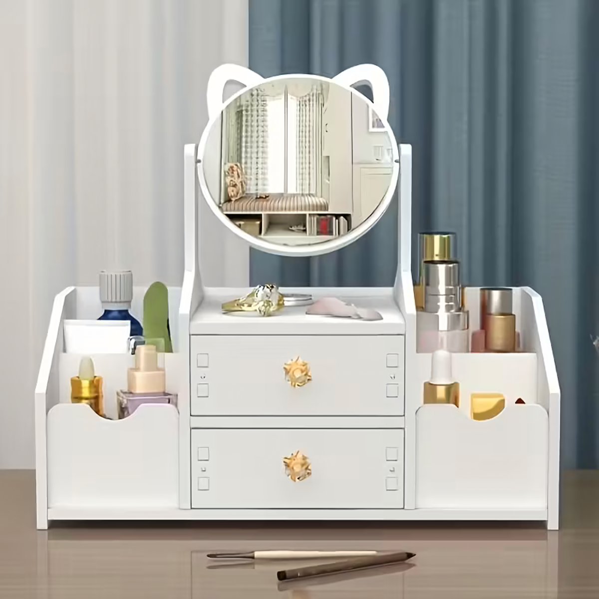 Mažas kosmetikos staliukas su veidrodžiu – kosmetikos ir papuošalų organizatorius