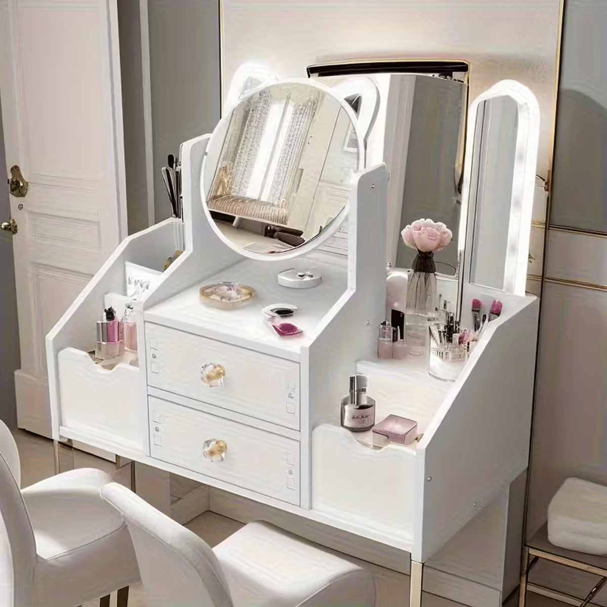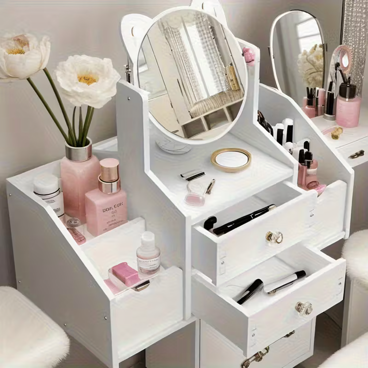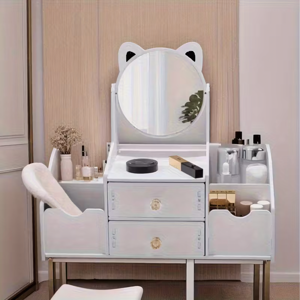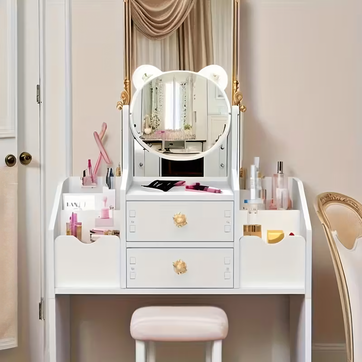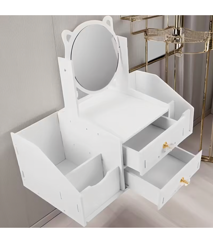 Sukurkite savo mažą grožio karalystę su elegantišku, kompaktišku staliuku su veidrodžiu! Puikiai tinka miegamajam, vonios kambariui arba drabužinei – padeda išlaikyti tvarką ir prideda jūsų interjerui žavesio bei stiliaus.