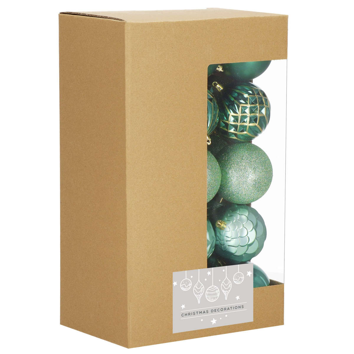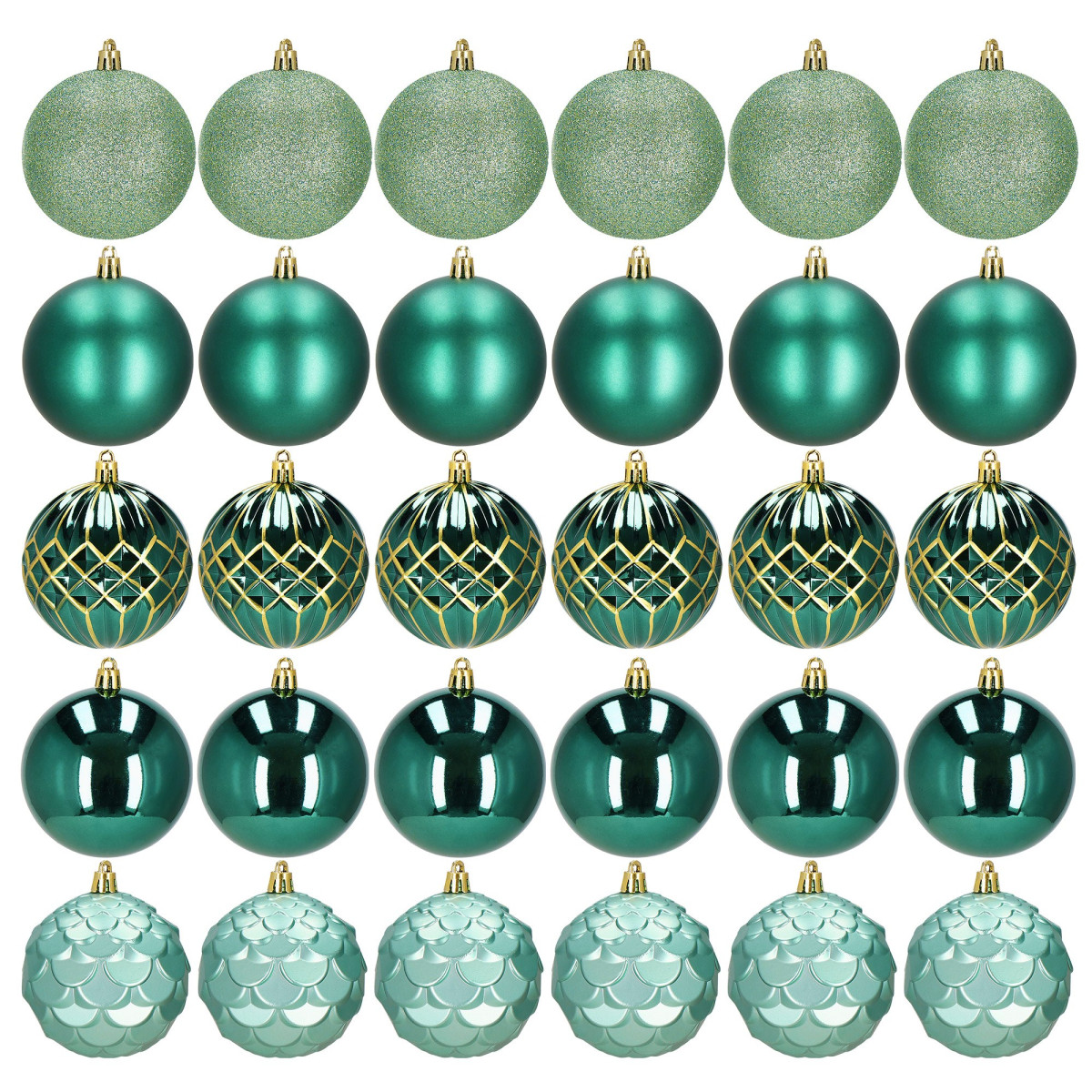 Pagrindinė informacija Prekės ženklas: Springos® Medžiaga: plastikas Spalva: žalios atspalviai, auksinė Vienetų skaičius rinkinyje: 30 Nesulūžtančios burbulai Pakabinimo virvelės komplekte Tipas: pusiau matiniai / blizgūs / spindintys Forma: apvali Rinkinyje yra: 6x pusiau matinis burbulas 6x blizgus burbulas 6x blizgantis burbulas 6x matiniai burbulas su įspaudu 6x blizgus burbulas su geometriniu aukso raštu Išmatavimai: Bendras aukštis: 8 cm Skersmuo be pakabinimo: 7 cm