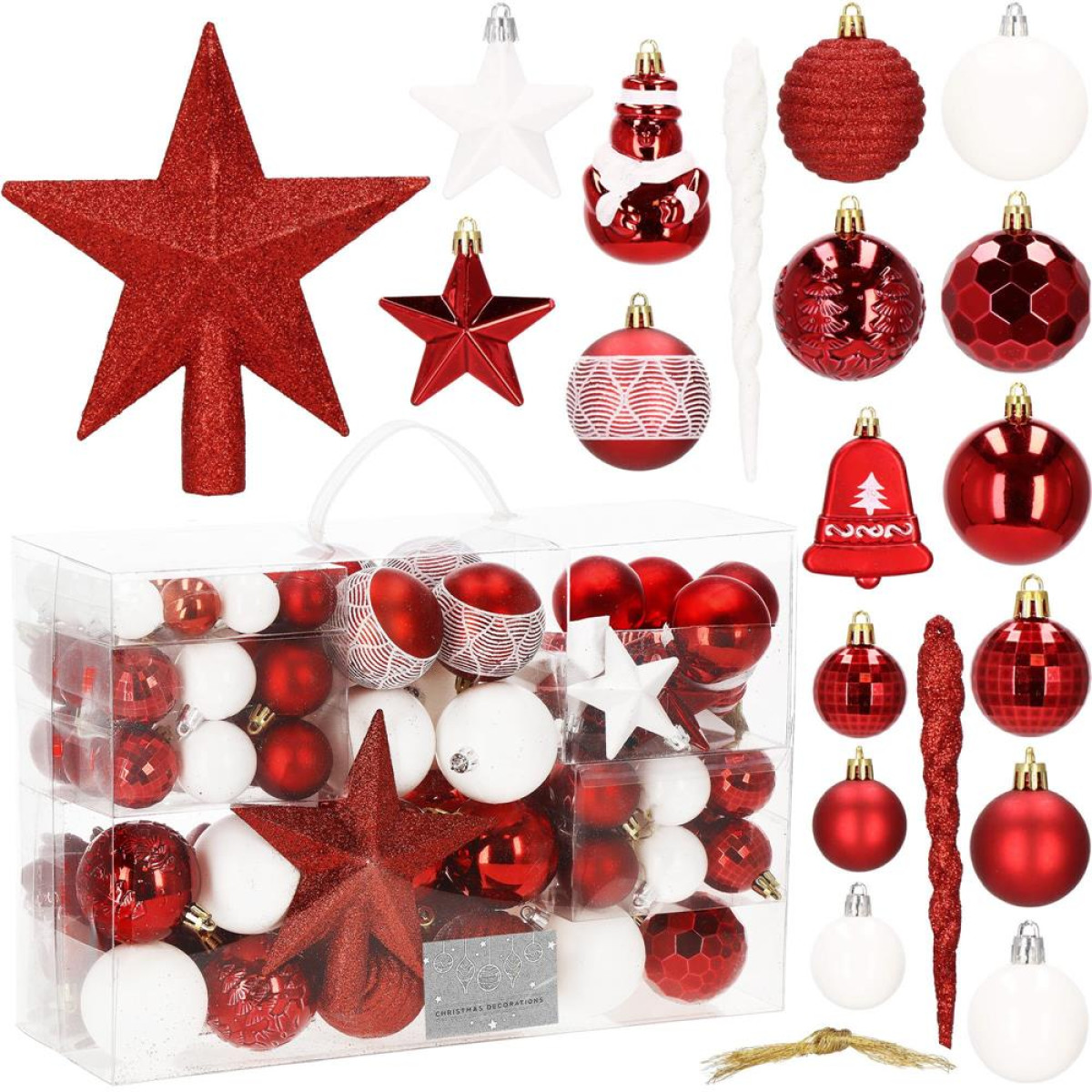 Pagrindinė informacija: Prekės ženklas: Springos® Spalva: raudona-balta Medžiaga: plastikas Kiekis: 104 burbulai + 1 žvaigždė ant eglutės viršūnės Raštai: matiniai, blizgantys, spindintys Nesudaužomi Pakabinimo virvelės dovanų Komplekte: 16× mini burbulai — 3 cm 24× maži matiniai burbulai — 4 cm 12× maži diskotekiniai burbulai — 4 cm 2× sniego seniai — 8 cm 4× raudonos blizgios žvaigždutės — 6 cm 4× baltos matinės žvaigždutės — 6 cm 4× varpeliai — 7 cm 8× raudonos blizgančios ledo varvekliai — 12 cm 4× baltos blizgančios ledo varvekliai — 12 cm 4× dideli blizgantys burbulai — 6 cm 8× dideli matiniai burbulai — 6 cm 4× dideli matiniai burbulai su raštu — 6 cm 4× dideli blizgantys burbulai — 6 cm 2× dideli blizgantys geometriniai burbulai — 6 cm 2× dideli blizgantys burbulai su reljefiniu raštu — 6 cm 1× blizganti žvaigždė viršūnei — 15 cm