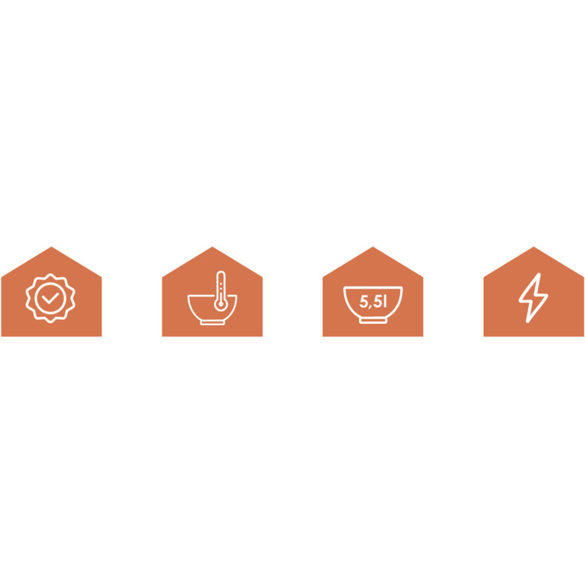Trys antgaliai (kabliukas, maišytuvas, plakiklis), gausus priedų rinkinys (mentelė, kiaušinių separatorius, konditeriniai maišeliai) ir 5,5 l dubuo užtikrina, kad būsite pasirengę bet kokiam kulinariniam iššūkiui – nuo biskvito iki šviežios pastos.