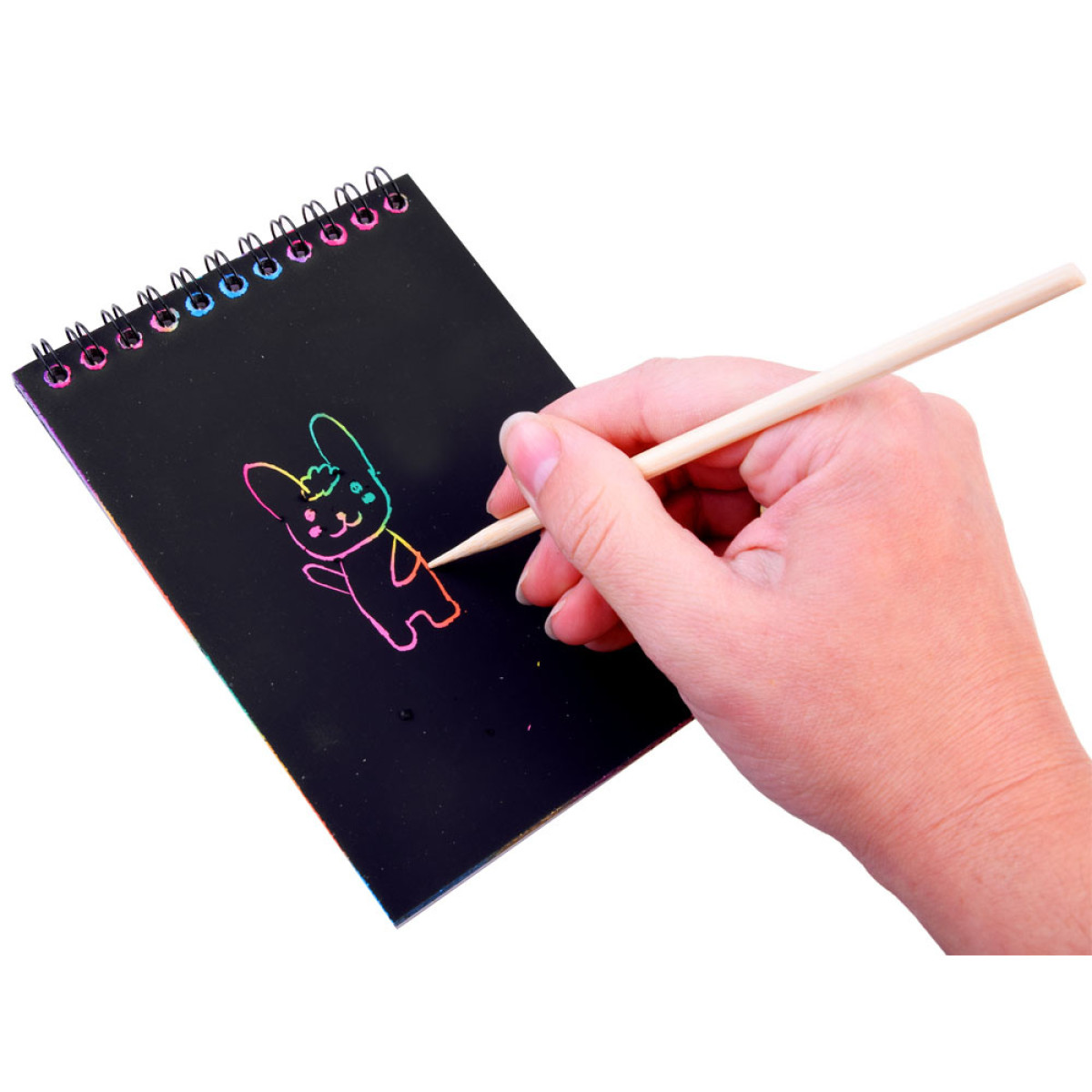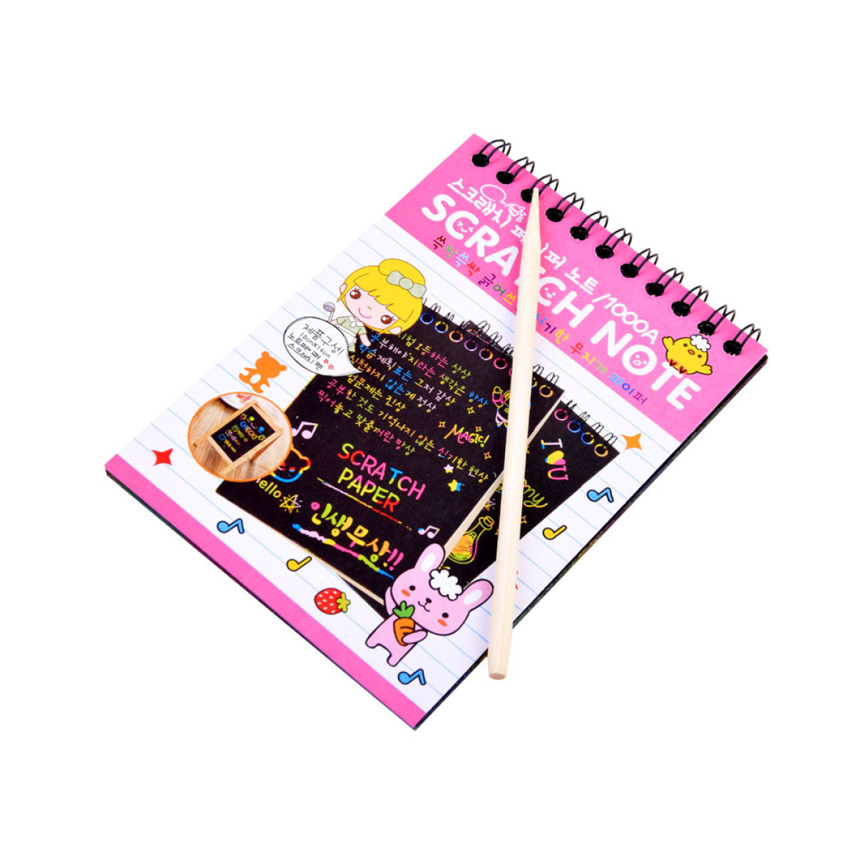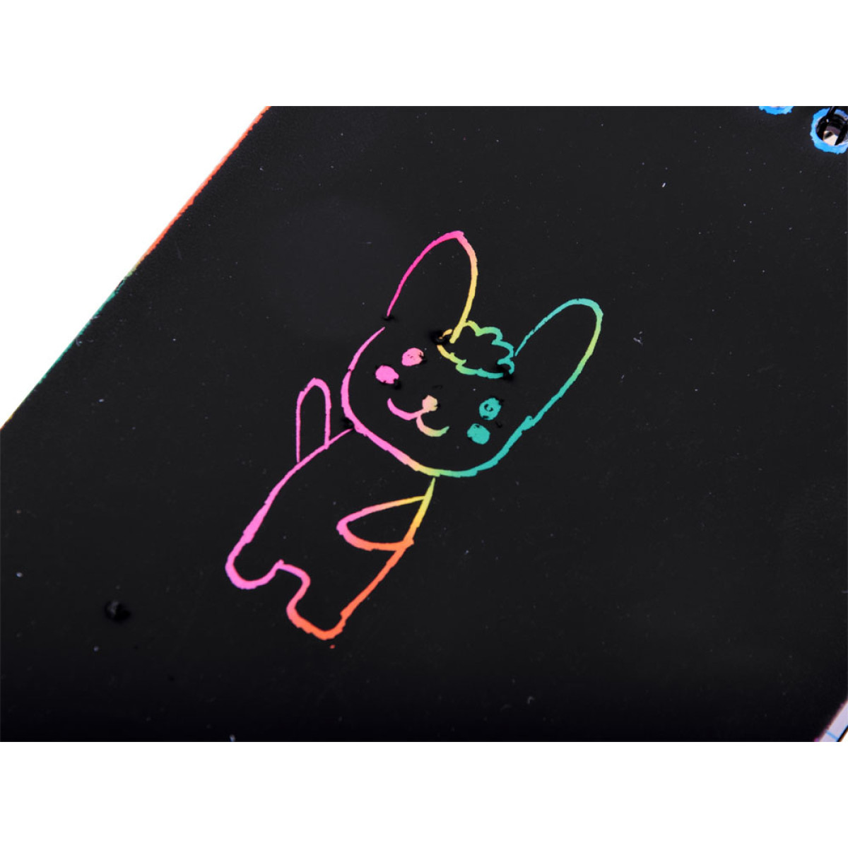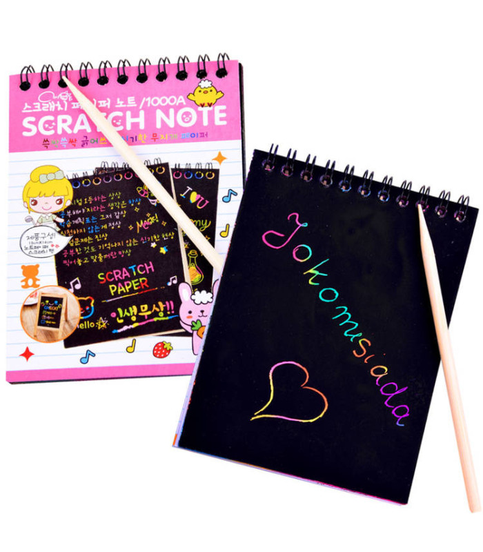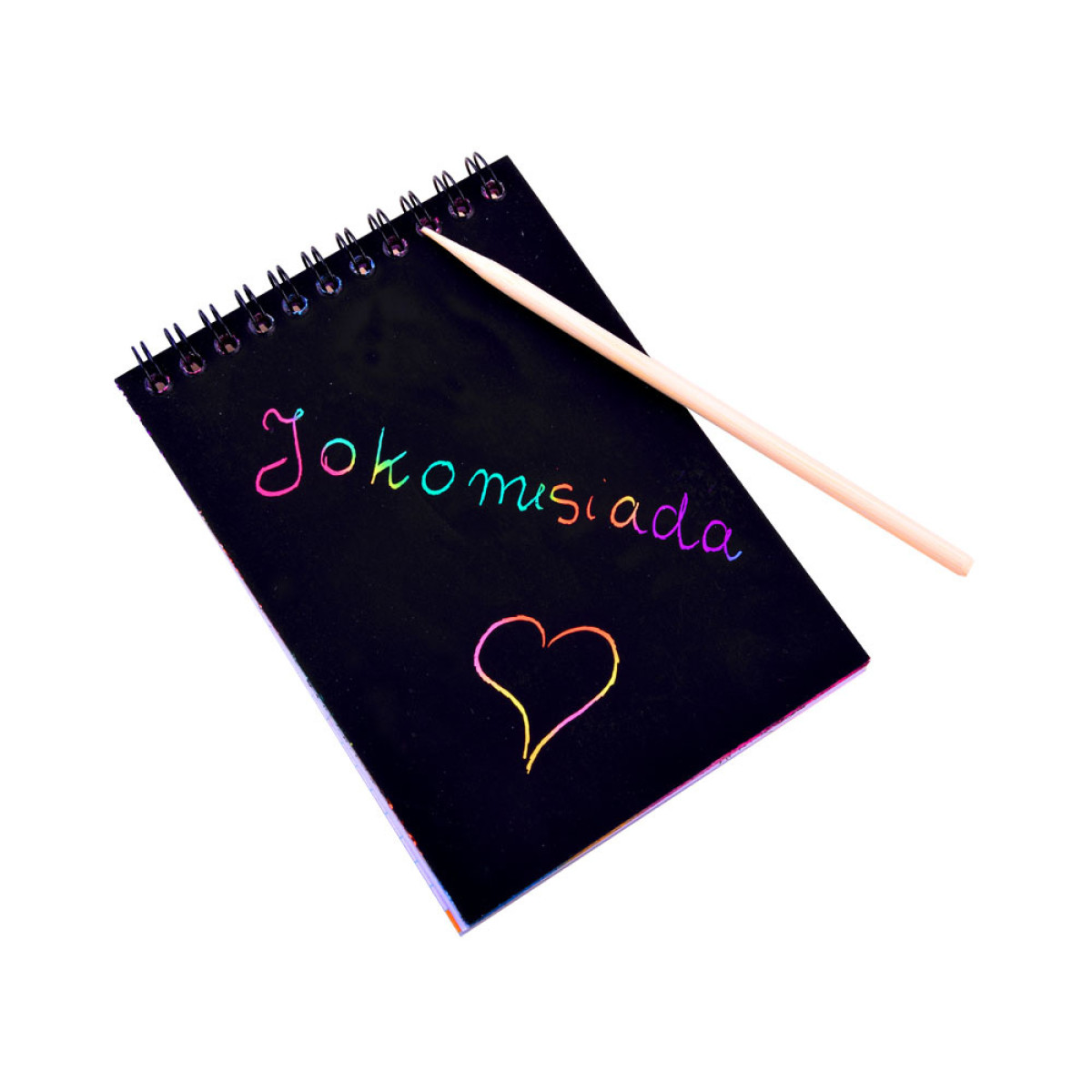 Spalvingas, vaivorykštinis bloknotas, patogioje A6 formoje su 10 lapų, suteiks vaikams kūrybišką laiką. Bloknotas su juodais lapais slepia magišką foną, kurį atskleisti galima naudojant medinį rysiką. Tiesiog nutrinkite norimą piešinį ar raštą ir pamatysite nuostabų vaizdą. Vaikų kūrybiškumas neturi ribų, tad žaidimas su šiuo magišku bloknotu tikrai bus sėkmingas!