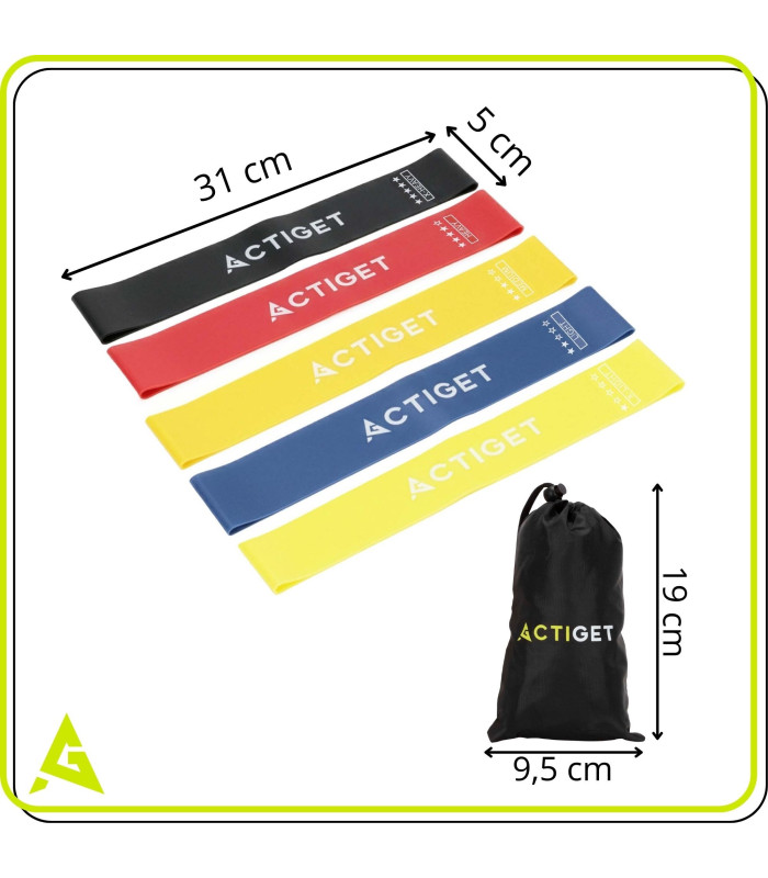 Prekės ženklas: Actiget® Medžiaga: poliesteris, lateksas Spalva: laimo, geltona, mėlyna, raudona, juoda Sertifikatas: CE Komplekte yra: 1 x pasipriešinimo guma (XS) 1 x pasipriešinimo guma (S) 1 x pasipriešinimo guma (M) 1 x pasipriešinimo guma (L) 1 x pasipriešinimo guma (XL) 1 x nešiojimo maišelis su užveržiamu raišteliu Matmenys: Laimo pasipriešinimo guma (XS) Ilgis neištemptas: 31 cm Apimtis: apie 62 cm Plotis: 5 cm Storis: 0,35 mm Pasipriešinimas: 1–3 kg Mėlyna pasipriešinimo guma (S) Ilgis neištemptas: 31 cm Apimtis: apie 62 cm Plotis: 5 cm Storis: 0,5 mm Pasipriešinimas: 3–5 kg Geltona pasipriešinimo guma (M) Ilgis neištemptas: 31 cm Apimtis: apie 62 cm Plotis: 5 cm Storis: 0,7 mm Pasipriešinimas: 5–10 kg Raudona pasipriešinimo guma (L) Ilgis neištemptas: 31 cm Apimtis: apie 62 cm Plotis: 5 cm Storis: 0,9 mm Pasipriešinimas: 10–15 kg Juoda pasipriešinimo guma (XL) Ilgis neištemptas: 31 cm Apimtis: apie 62 cm Plotis: 5 cm Storis: 1,1 mm Pasipriešinimas: 15–20 kg Nešiojimo maišelis su užveržiamu raišteliu Ilgis: 19 cm Plotis: 9,5 cm Storis: 6 cm Papildoma informacija: Produktas pažymėtas Actiget® logotipu