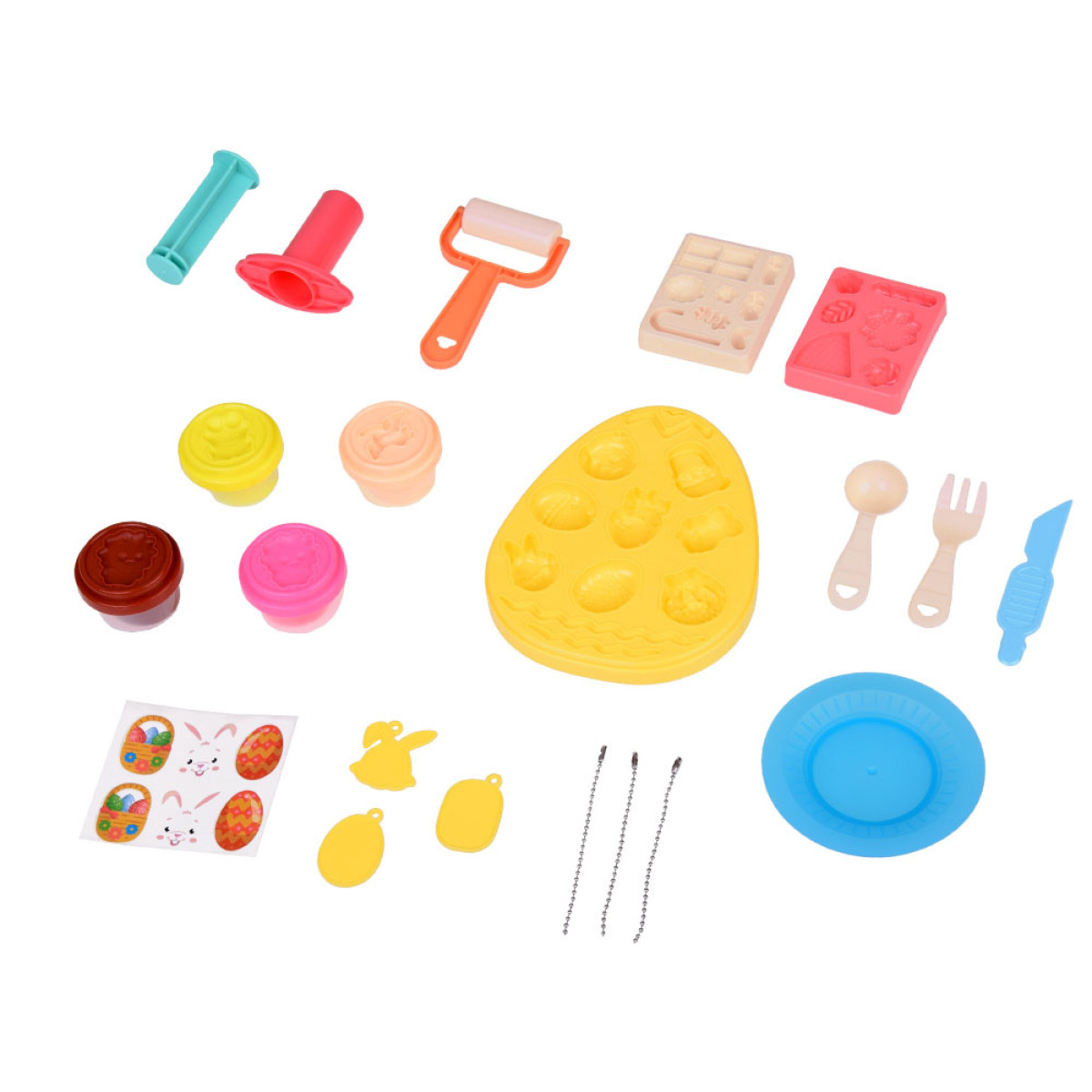 Rinkinyje yra 4 spalvotos plastilino masės, iš kurių vaikas gali sukurti mielas figūrėles ir originalias puošmenas sau, tėvams ar draugams. Plastilino indelių dangteliai taip pat naudojami kaip gyvūnėlių formelės. Didelė velykinio kiaušinio formelė leidžia išspausti įvairius raštus, pavyzdžiui, kiškutį, morką, margutį, viščiuką ar krepšelį. Komplekte taip pat yra 2 mažesnės formelės, skirtos lapelių, gėlyčių, debesėlių, saldainių ir kitų formų kūrimui.