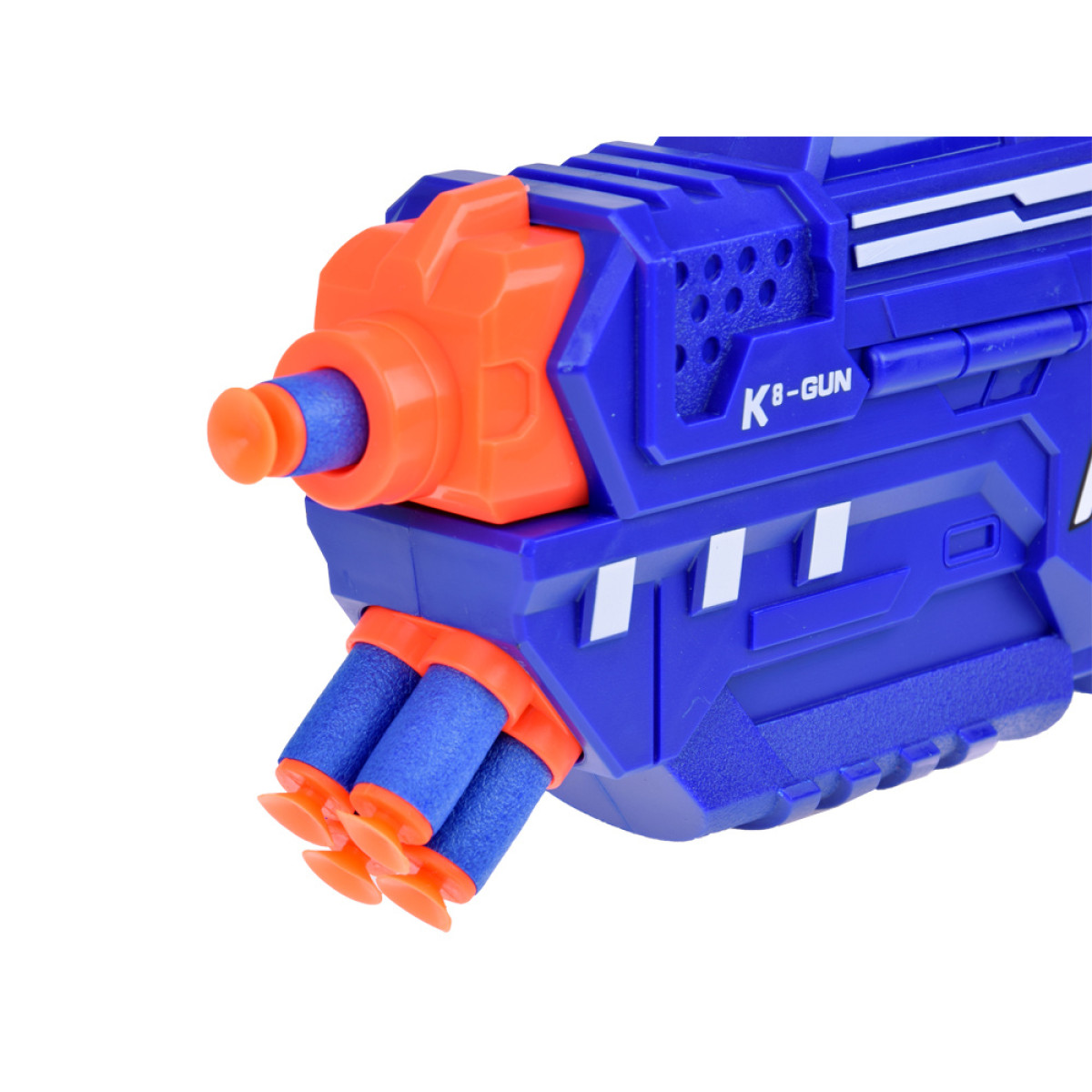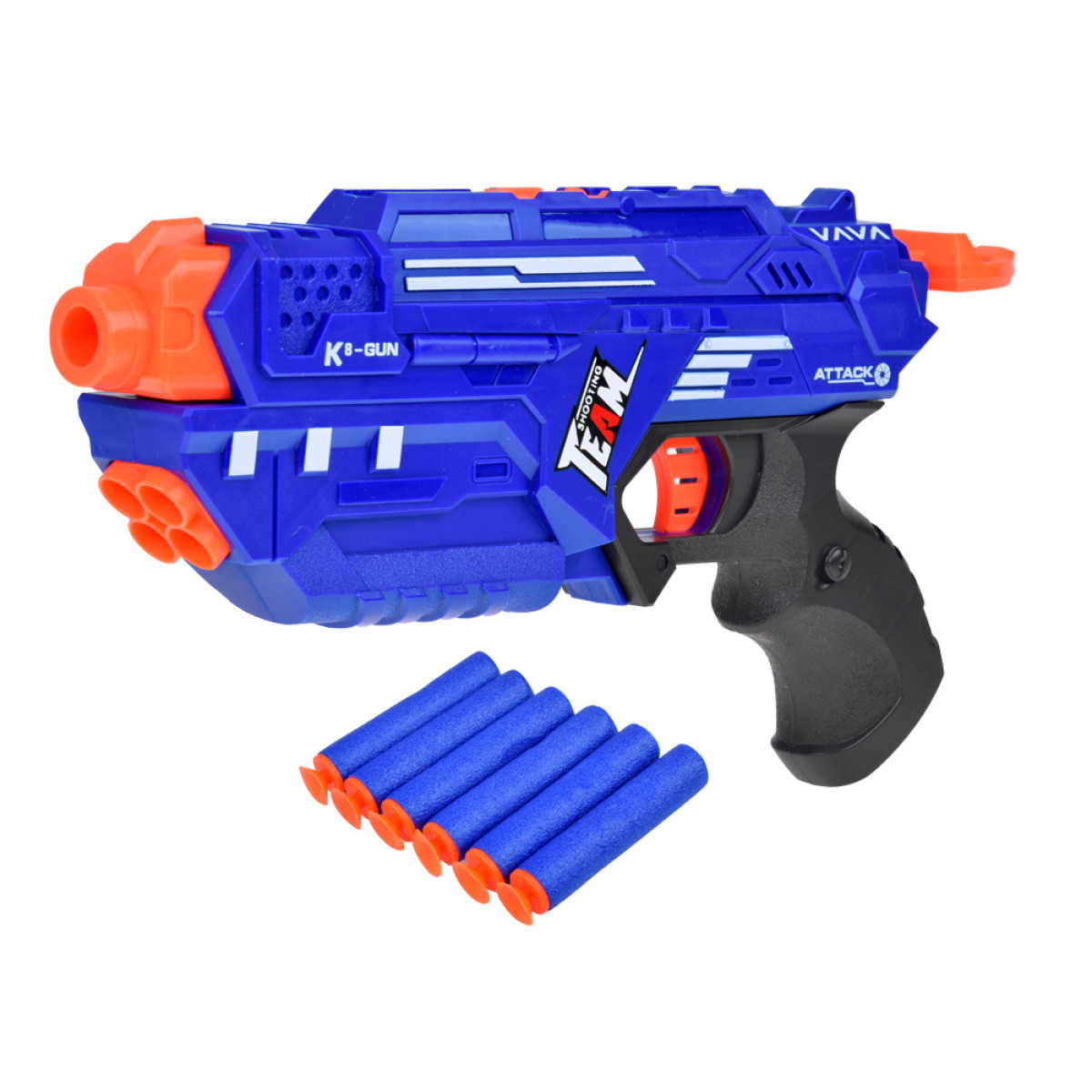 Kaip veikia šis pistoletas? Tiesiog įdėkite piankinį šovinį tiesiai į vamzdį, užtempkite viršutinę pistoleto dalį, paspauskite gaiduką ir... pasiruošta! Šovinys gali nuskriauti net iki 12–15 metrų! Želatinius šovinius reikia įpilti per viršutinę angą - jie puikiai tinka tolimo taikinio žaidimams!