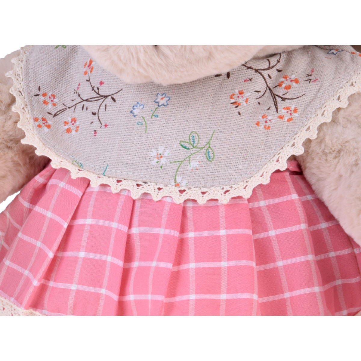 • Suknelė yra rožinė su baltais kvadratėliais, apačioje dekoruota nėriniais, o viršuje turi gėlių apykaklę su tais pačiais nėriniais. Didelis privalumas, kad suknelę galima nuimti, todėl lengva ją valyti ir lyginti.