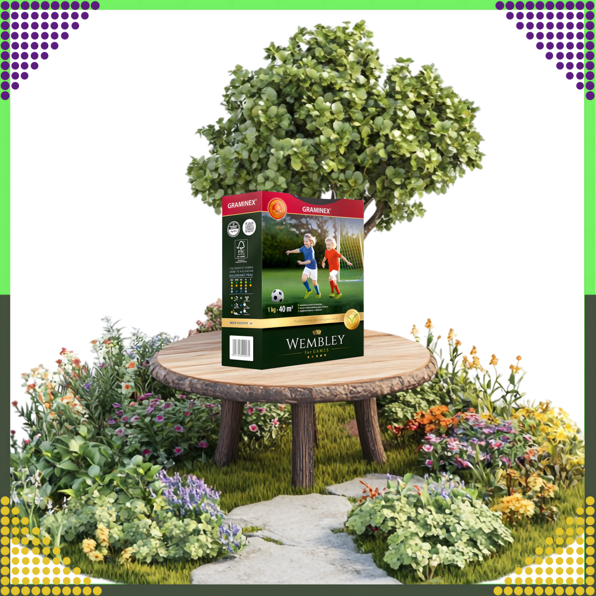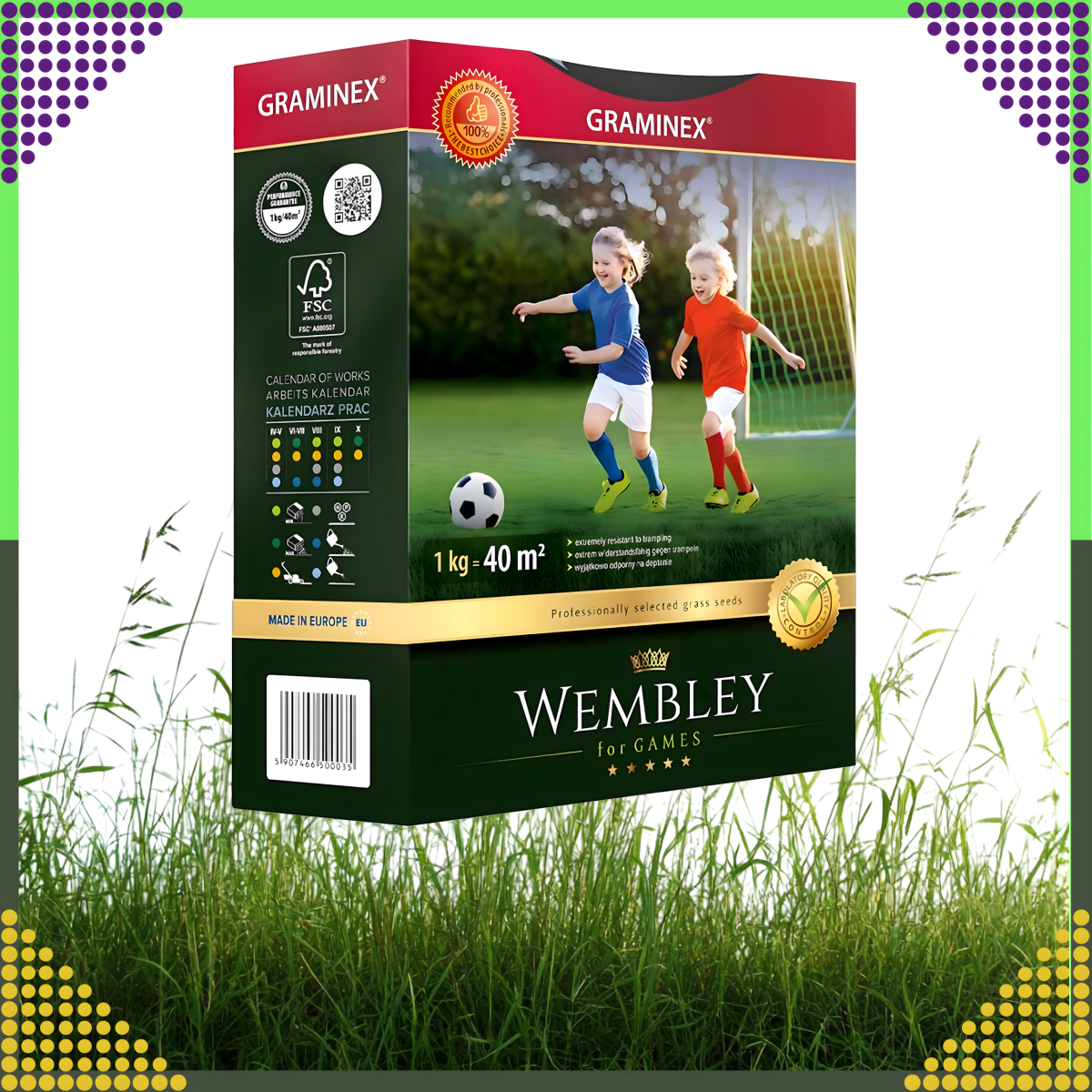 Premium sportinė vejo sėkla WEMBLEY yra skirta sportinėms aikštelėms. Supakuota: 1 vnt, Paletė: 300 vnt. SVARBU! Norint prekiauti sėklomis, reikia atlikti