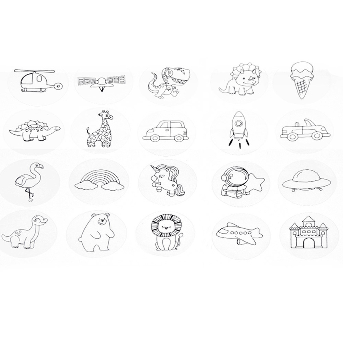 - 20 diskų su vaizdais: gyvūnai, dinozaurai, transporto priemonės, astronomija, įvairiaspalviai