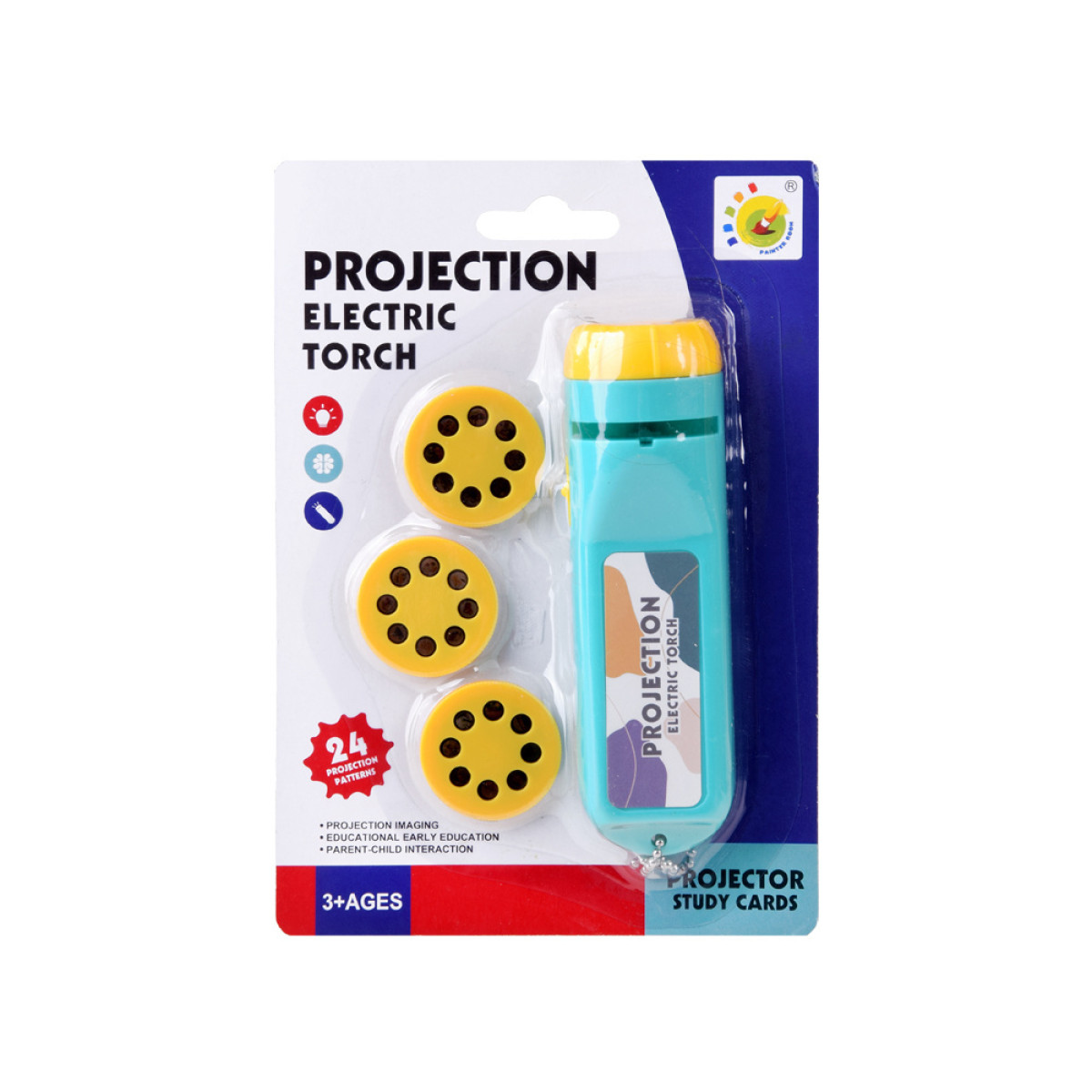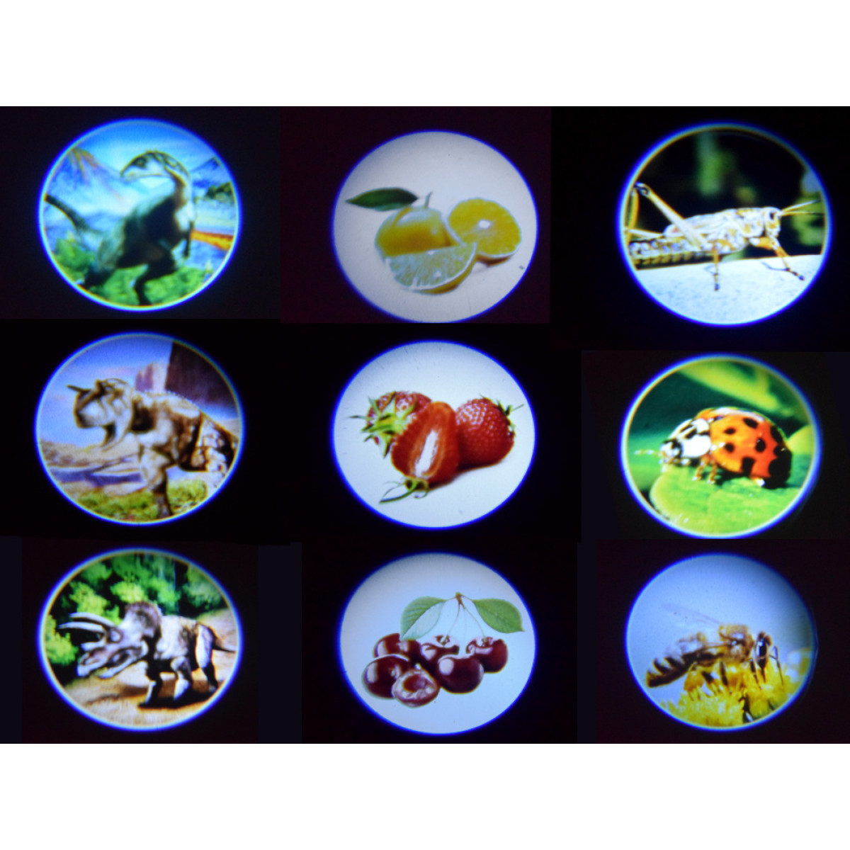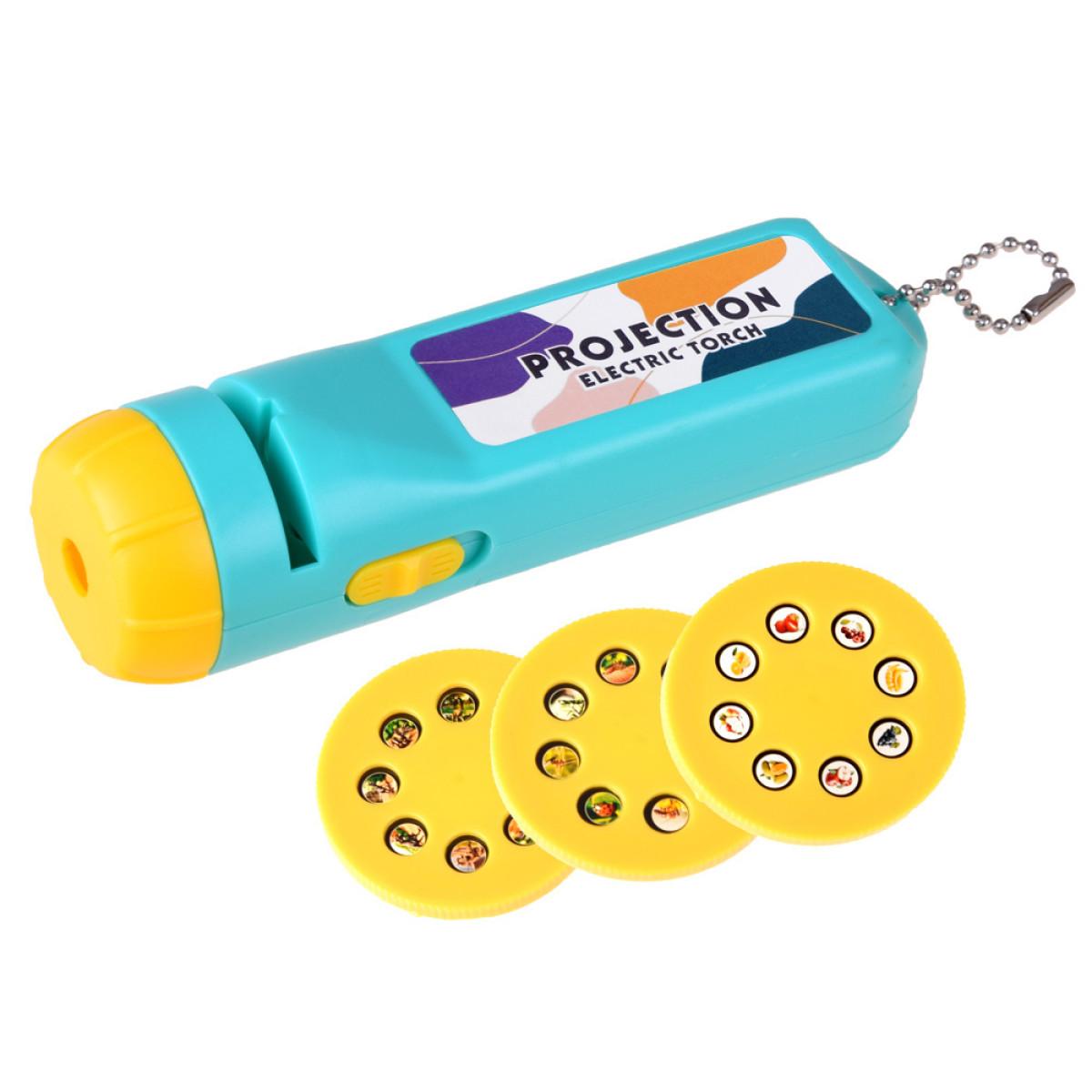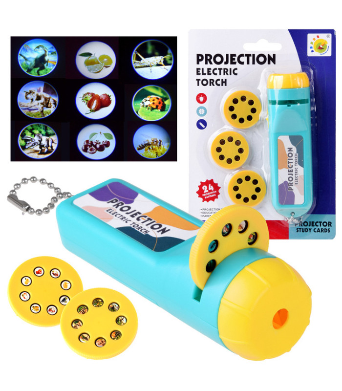 Projektorius vaikams su spalvotais paveikslėliais, skirtas rodyti tamsoje. Dėl nedidelio dydžio, jis yra patogus ir lengvai nešiojamas, todėl galite jį pasiimti visur. Jis puikiai tiks kambaryje, kai reikia užmigti naktį, palapinėje atostogų metu, ar apsilankius pas senelius savaitgaliui. Rankinis projektorius bus naudingas vakaro žaidimams, pasakojimams, savo istorijų kūrimui. 3 skaidrių diskai užtikrins, kad žaislas greitai nepabos. Kiekvienas diskas turi 8 paveikslėlius su skirtingomis temomis: pirmame diske – įvairūs dinozaurai, antrame – vabzdžiai, trečiame – vaisiai. Be skaidrių, projektorius gali veikti kaip žibintuvėlis, apšviečiantis tamsias kambario kerteles vakare.