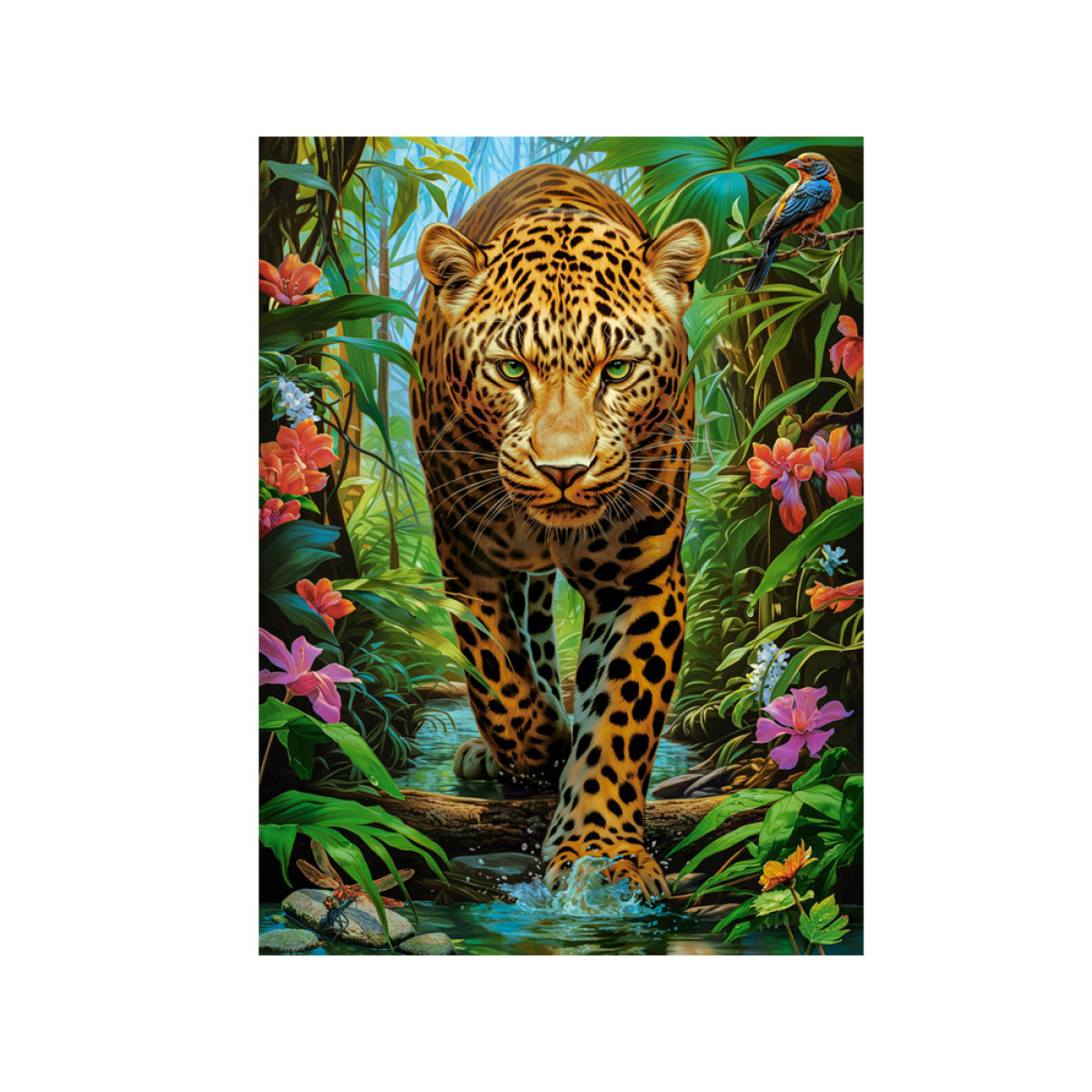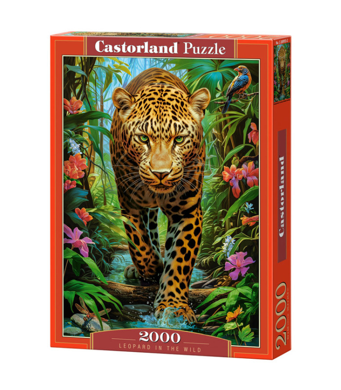 Puzzle „Leopardas laukinėje gamtoje“ nukels jus į džiunglių širdį, kur didingas leopardas slypi tarp vešlios augmenijos. Detali iliustracija perteikia tiek gamtos grožį, tiek laukinę prigimtį, rodant leopardą dinamiškoje pozoje žaliuojančių tropikų medžių fone.