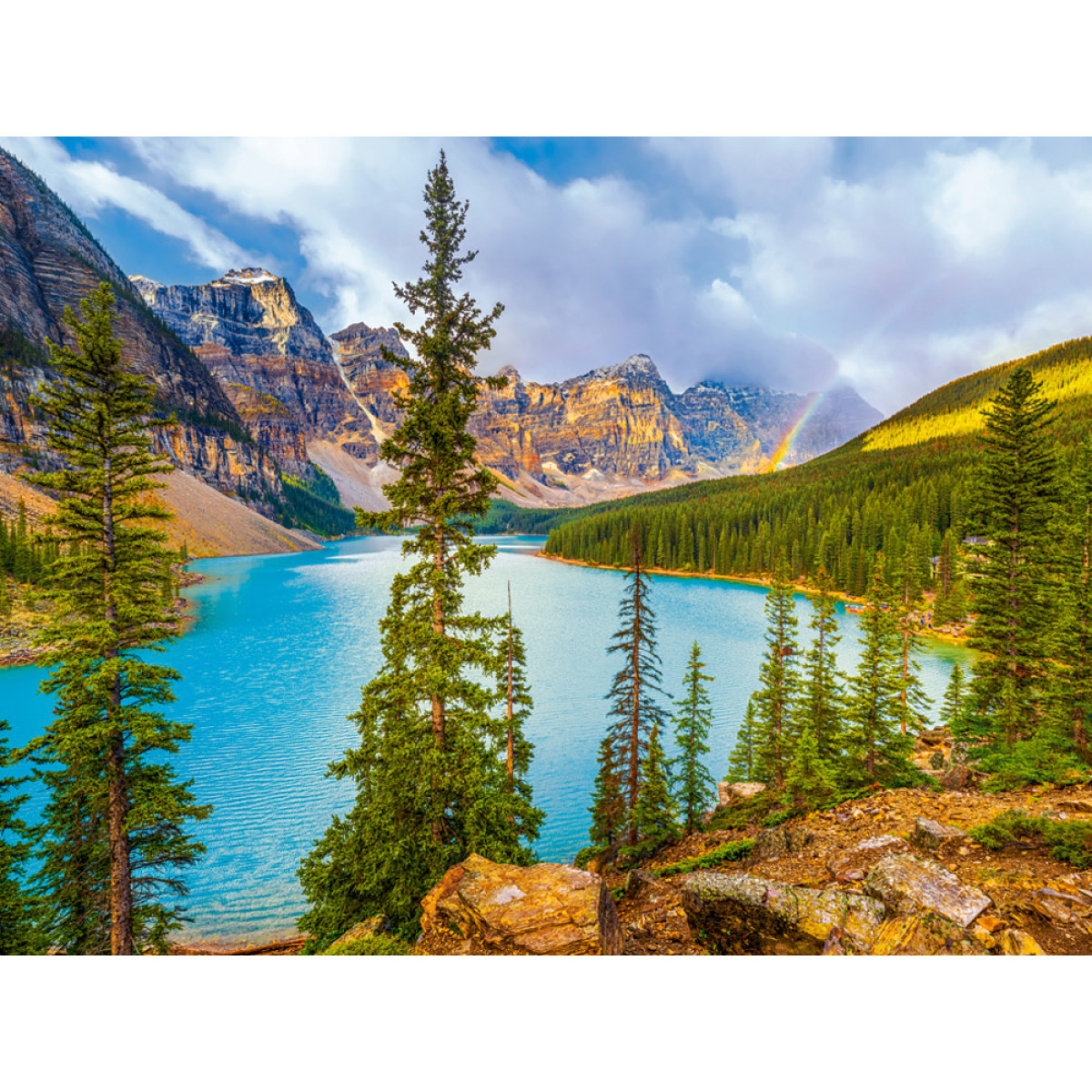 Dėlionė „Moraine Lake, Banff Nacionalinis Parkas, Kanada“ yra unikali pasiūla gamtos mylėtojams, kalnų kraštovaizdžių gerbėjams ir dėlionių entuziastams, ieškantiems iššūkių. Vaizdas atspindi vieną iš gražiausių Kanados vietų – turkio spalvos Moraine ežero vandenis, apsuptus didingų Uolinių kalnų viršūnių ir tankių spygliuočių miškų.