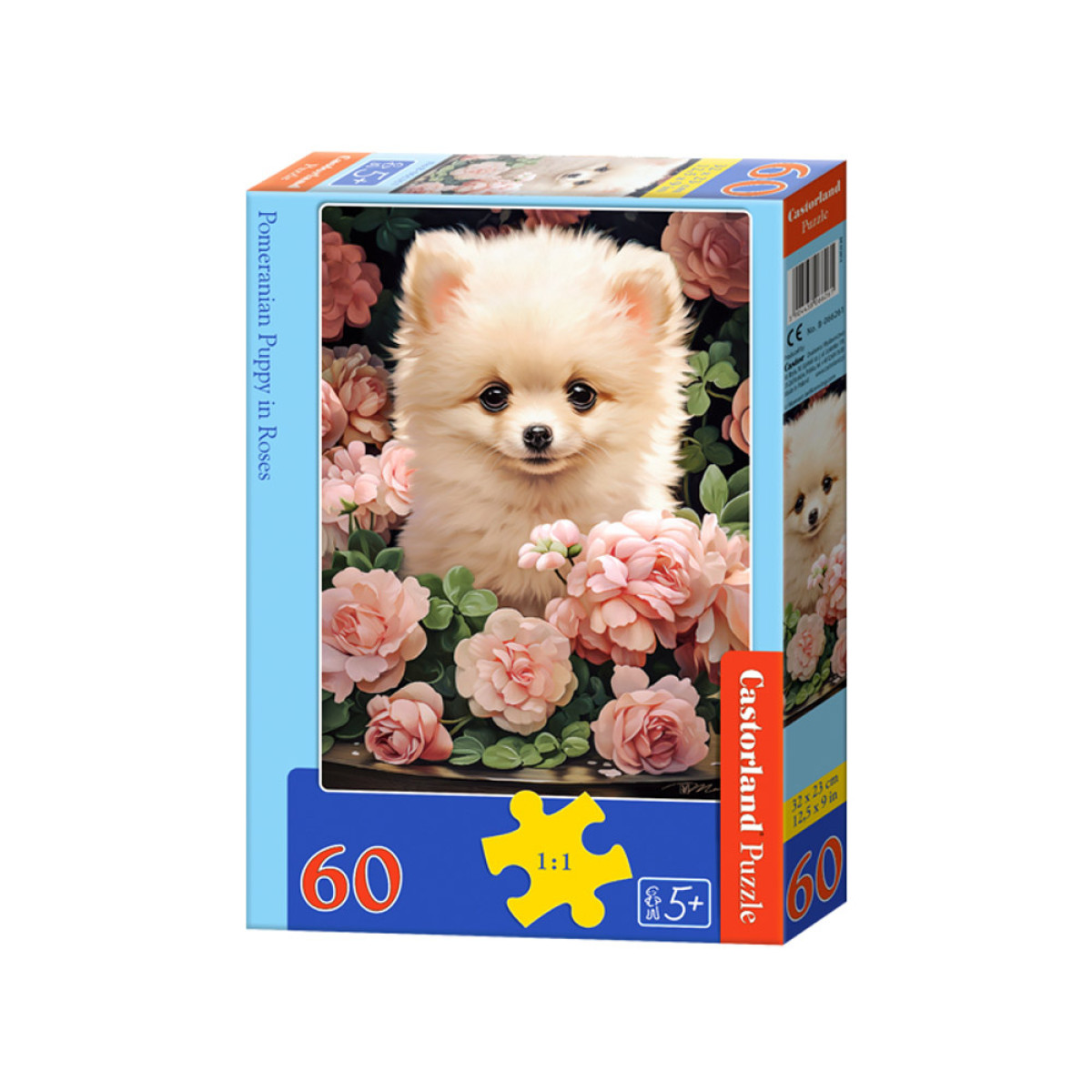 Puzzle 60 dalių Pomeranijos šuniukas rožių fone B-066261 yra ypatingai spalvingos dėlionės vaikams. Jos susideda iš 60 dalių, o surinkus susidaro paveikslas, kurio matmenys yra 32 x 23 cm. Aukšta kokybė ir estetiškos spalvos skatina kiekvieną vaiką sudėlioti dėlionę. Vidutinis kiekvienos dalies dydis yra 3,8 x 3,2 cm.