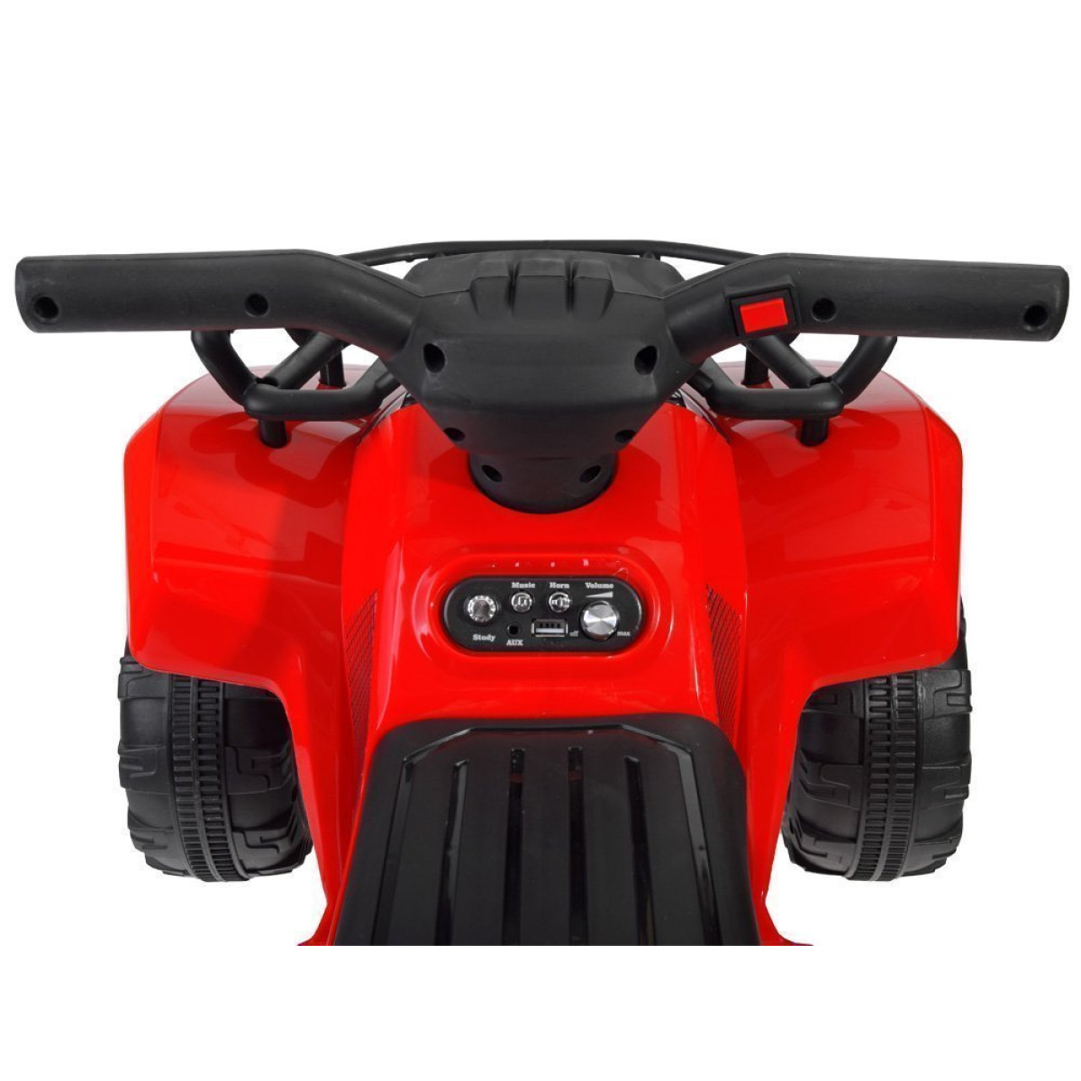 Šis sportinis keturratis puikiai tinka kaip gimtadienio arba kitos progos dovana. Keturratis pradeda važiuoti paspaudus raudoną mygtuką rankenoje. Skydelyje yra garso, signalo ir kitų funkcijų centras. Transporto priemonės dydis puikiai tinka mažiems vaikams, todėl vaikas gali lengvai važinėti po namus.