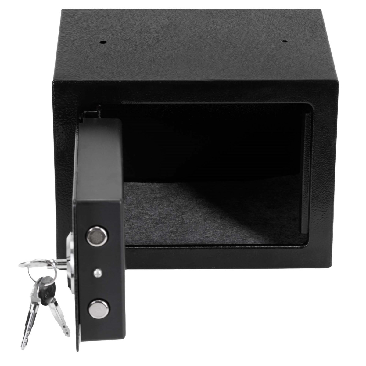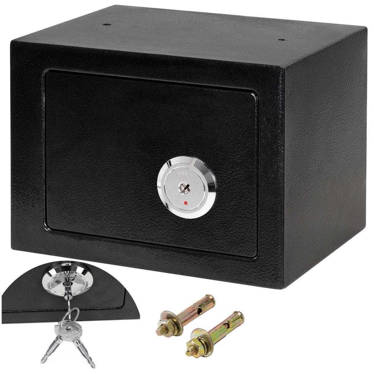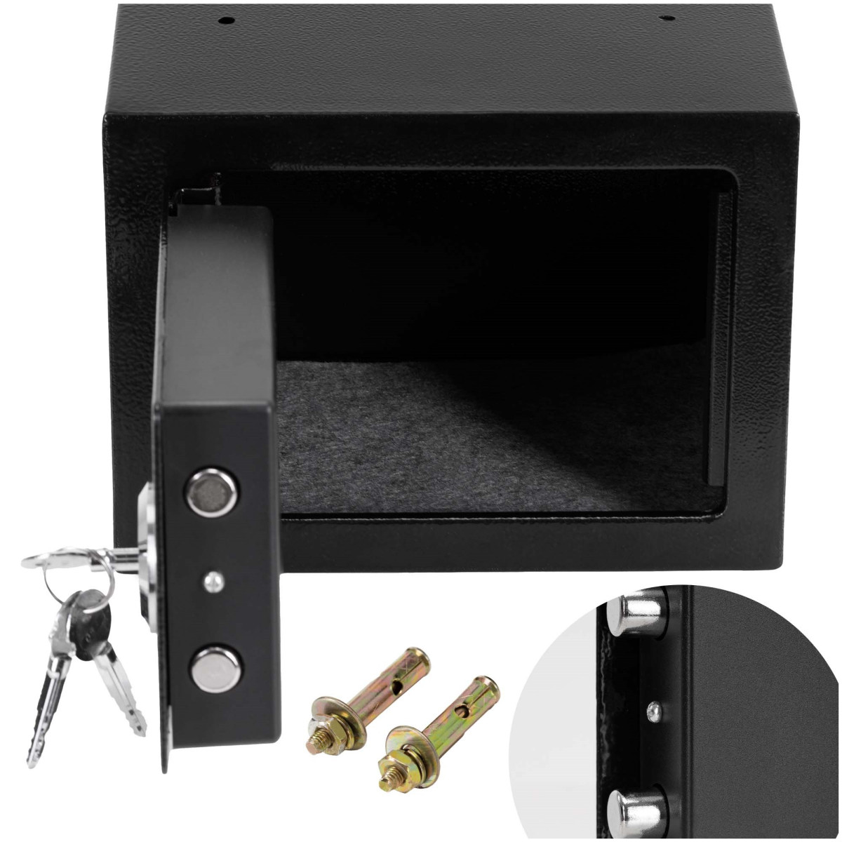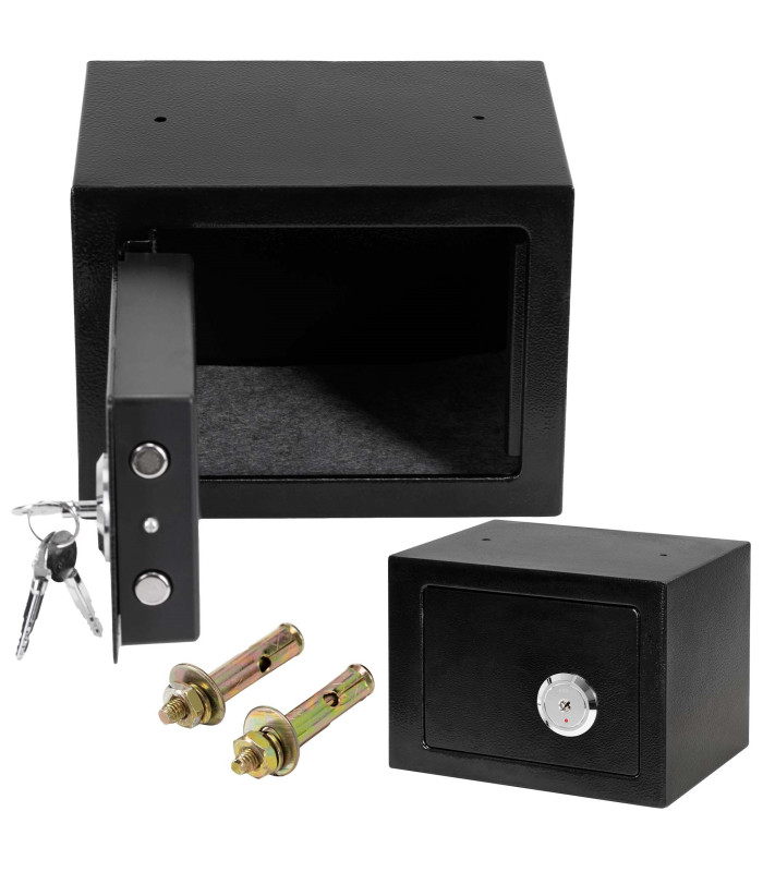 Prekės ženklas: Springos® Spalva: juoda Veltinio kilimėlio spalva: pilka Vidinės spynos spalva: juoda Medžiaga: milteliniu būdu dažytas metalas Tipas: raktų seifas Raktų skaičius: 3 Matmenys: Bendras aukštis: 17 cm Bendras plotis: 23 cm Bendras gylis: 17 cm Vidinis aukštis: 22.5 cm Vidinis plotis: 16.5 cm Vidinis gylis: 16.5 cm Durys Plotis: 17.5 cm Aukštis: 12.5 cm Metalo storis: 0.4 cm Spynos matmenys viduje: 15 x 11.5 x 3.5 cm Tvirtinimo angų skersmuo: 1 cm Atstumas tarp tvirtinimo angų: 14.5 cm Kaiščių dydis: M8, ilgis 44 mm Papildoma informacija: Angos ir kaiščiai (2) tvirtinimui prie sienos arba grindų – 2 seifo gale ir 2 apačioje Galimybė tvirtinti prie sienų ir grindų (kaiščiai įtraukti), veltinio kilimėlis slopina seifo vidų Raudonas indikatorius prie spynos yra tik nudažytas ir tarnauja kaip vizualus uždarymo indikatorius – jis nekeičia spalvos pasukus raktą SVARBU! Seifas skirtas naudoti namuose. Saugoti nuo drėgmės šaltinių. Valyti sausa šluoste, nenaudojant ploviklių.