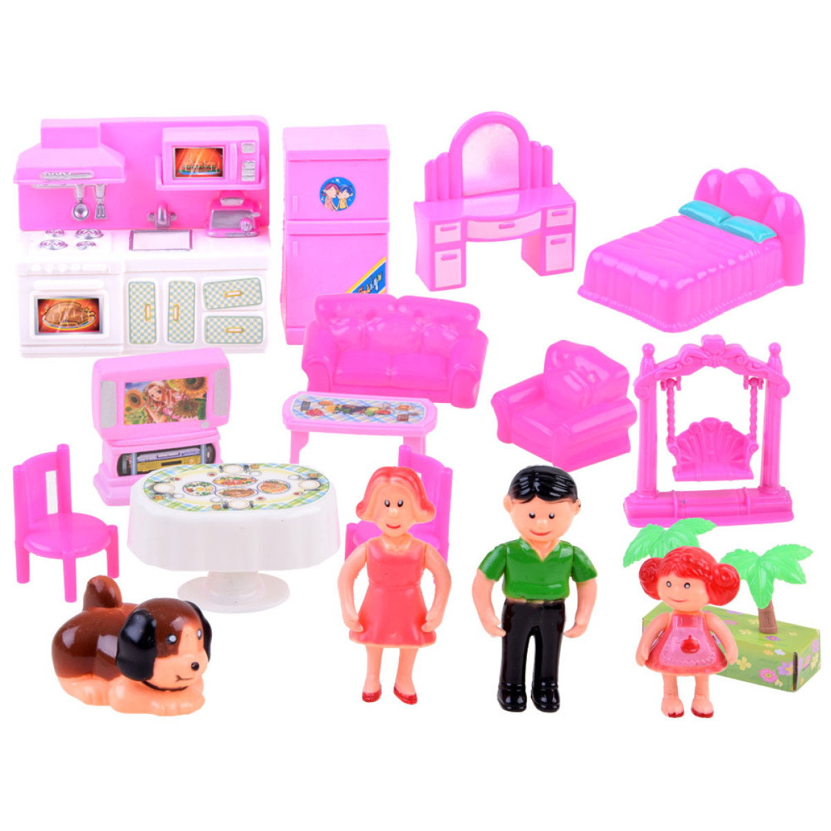 - Lėlių figūrėlės: mama, tėtis, dukra, šuniukas