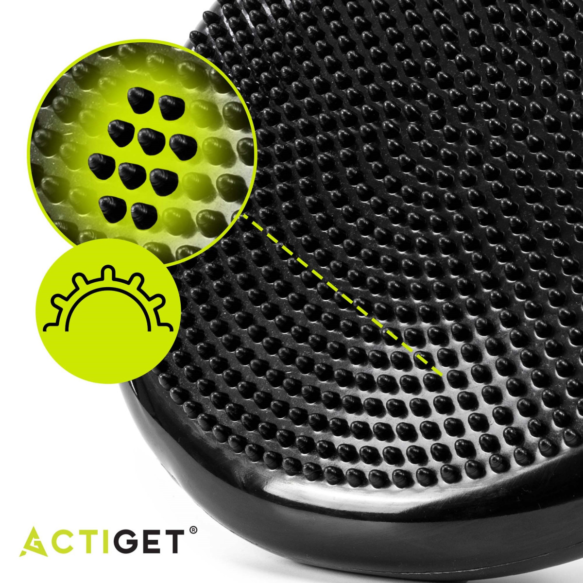 Produktas pažymėtas Actiget® logotipu. Pagalvė turi 2 tipų paviršius: viena lygi su mažais iškilimais, kita – masažuojanti ir stimuliuojanti su ilgais išsikišimais.