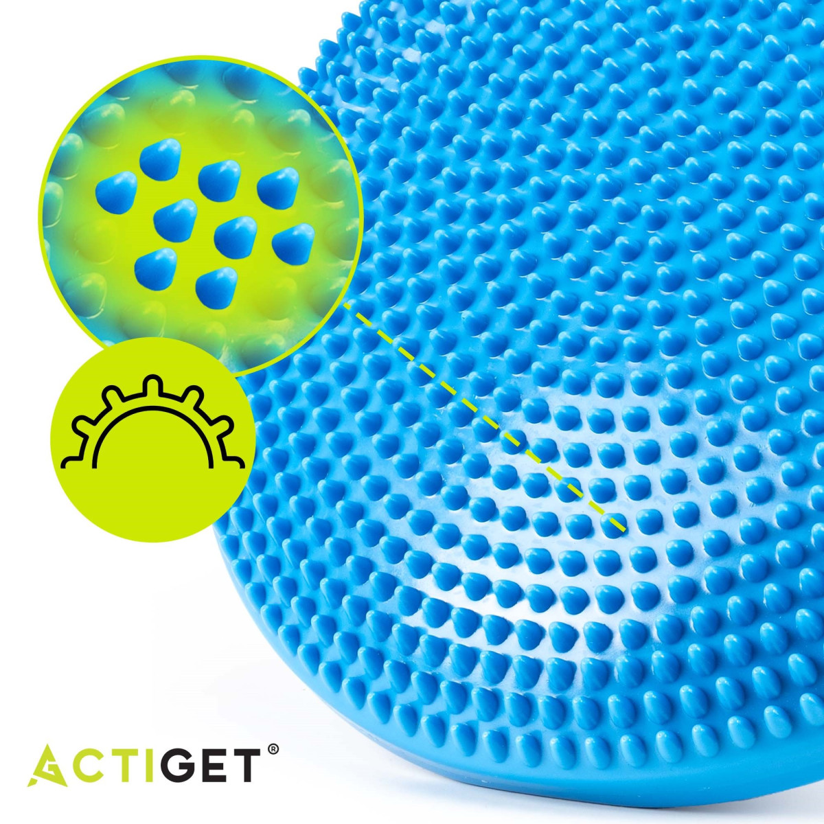 Pagalvė turi masuojančią ir stimuliuojančią paviršių su ilgais iškilimais, kurie padeda gerinti kraujotaką ir raumenų tonusą. Produktas pažymėtas Actiget® logotipu, garantuojančiu kokybę.