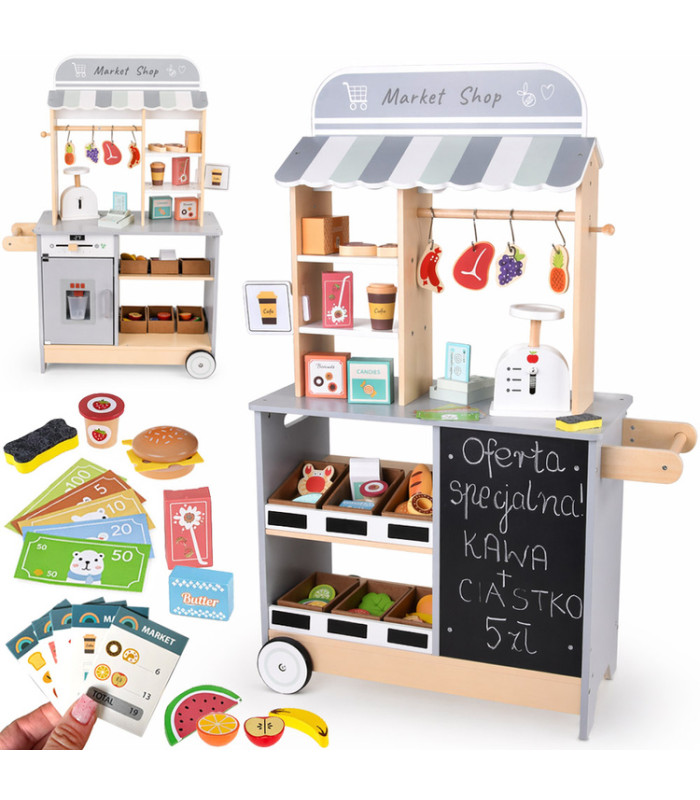 medinė vaikų parduotuvė vaikams – tai kūrybiškas ir įtraukiantis žaidimų rinkinys, leidžiantis vaikui kasdienes situacijas perkelti į žaidimų pasaulį. Žaisdamas parduotuvę vaikas gali skenuoti prekes, jas parduoti, aptarnauti klientus, sverti vaisius ir daržoves, priimti mokėjimus bei atiduoti grąžą. Toks žaidimas ne tik suteikia daug džiaugsmo, bet ir padeda mokytis per smagią veiklą.