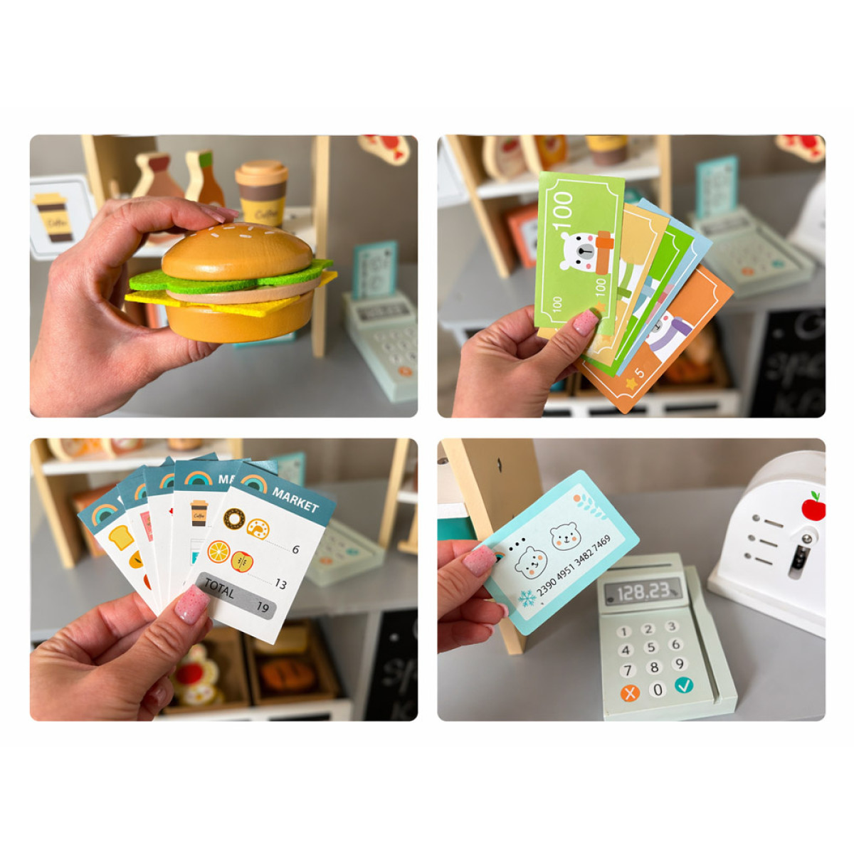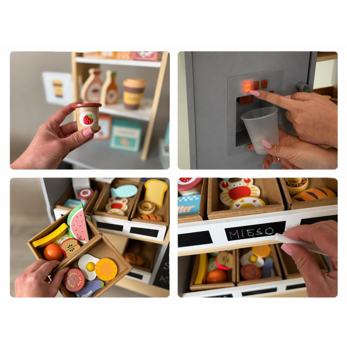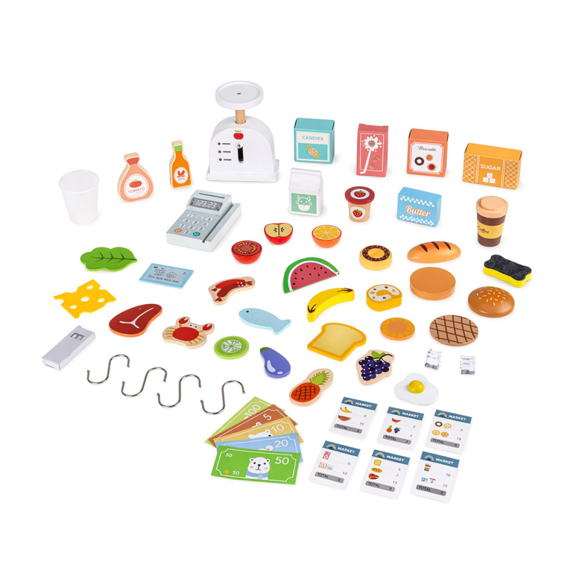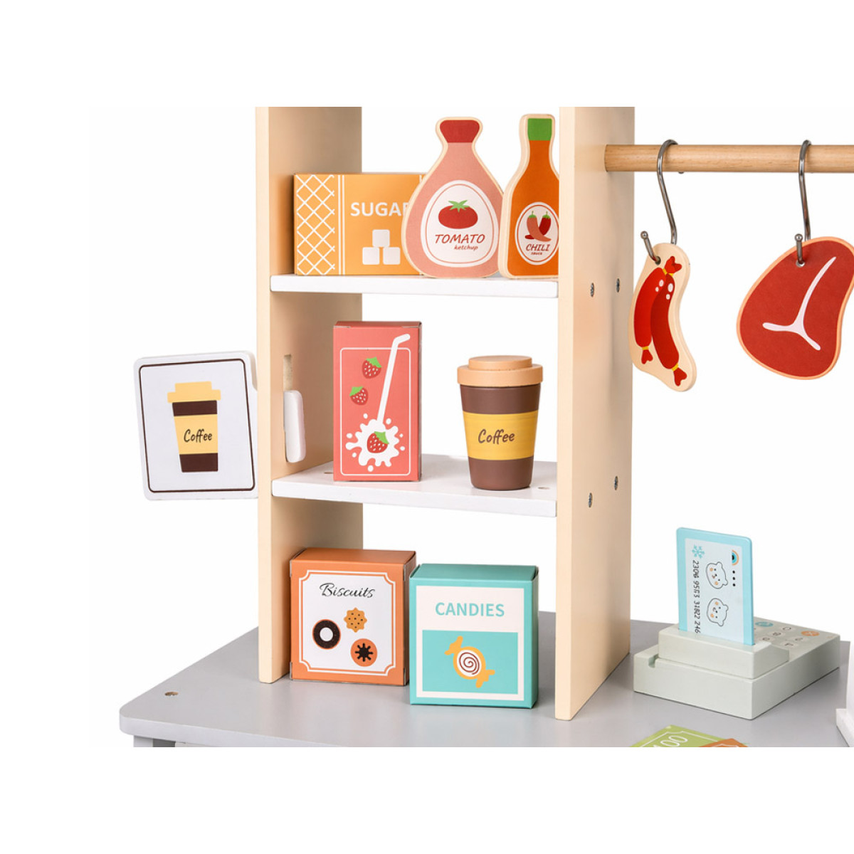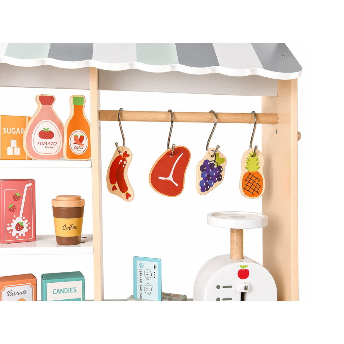 rinkinyje yra daug medinių ir minkštų žaidimo elementų, todėl žaidimas tampa dar įdomesnis. Vaikas gali dėlioti produktus ant lentynų, kabinti juos ant kabliukų, laikyti dėžutėse ir kurti įvairius parduotuvės ar kavinės scenarijus.