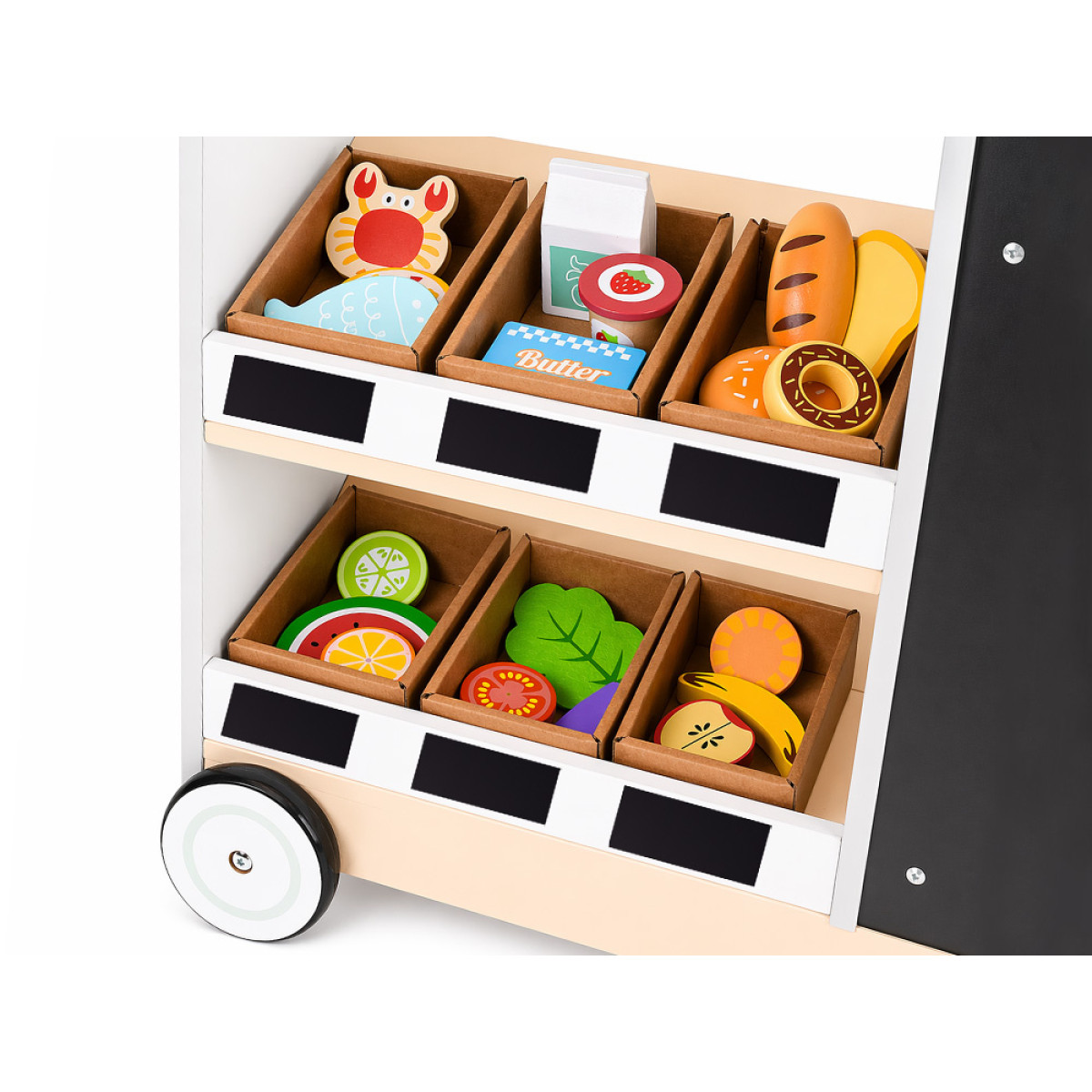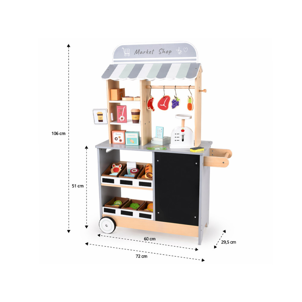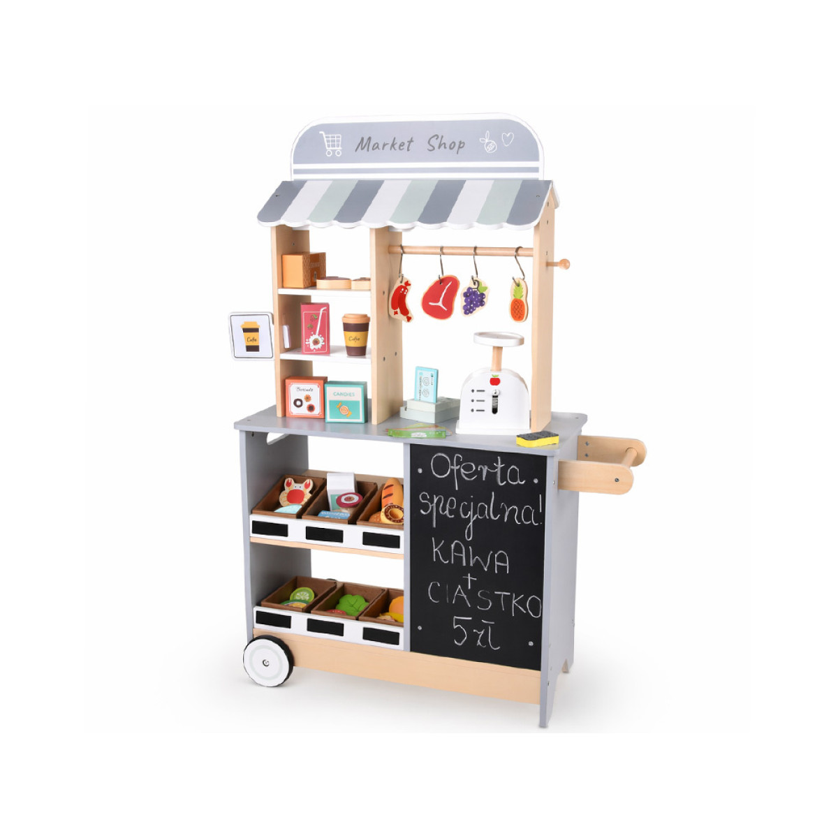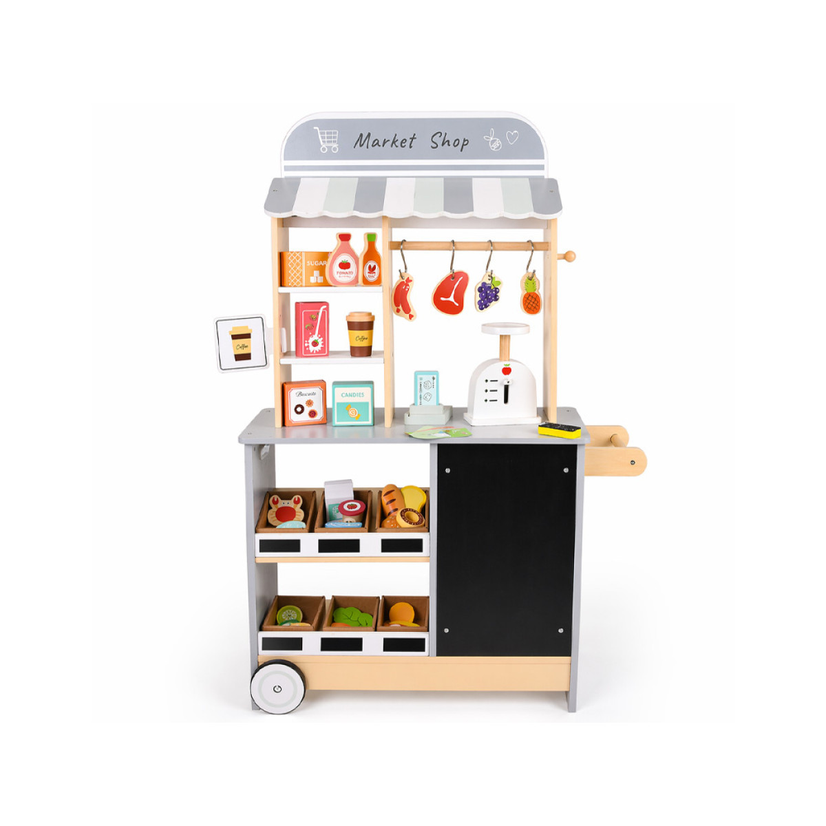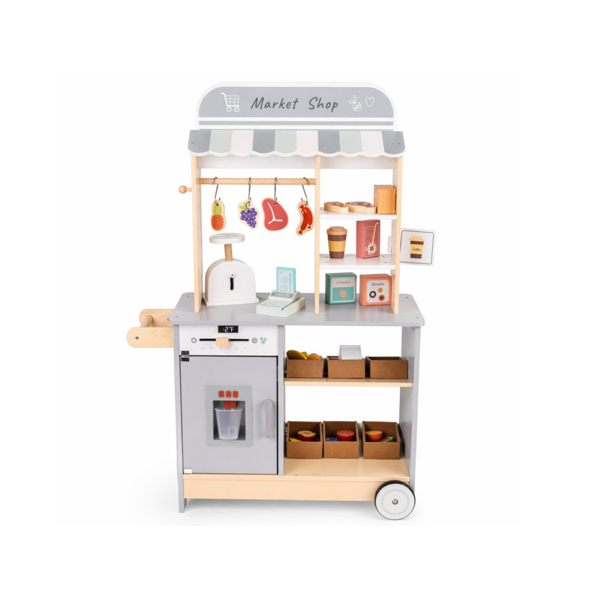 parduotuvė pagaminta iš kokybiškos šviesios medienos su pilkomis detalėmis, kurios suteikia modernią ir tvarkingą išvaizdą. Dėl dviejų ratukų ir šoninės rankenos ją lengva perstumti į kitą vietą, todėl vaikas gali pats keisti savo žaidimų erdvę. Platus stalviršis ir lentynos leidžia patogiai sudėti produktus, ruošti sumuštinius, mėsainius ar kavą išsinešti.