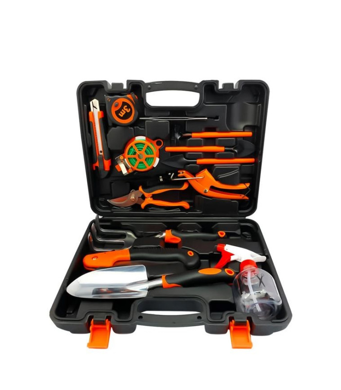 Visas sodo įrankių rinkinys – visa tai viename sodo įrankių rinkinyje yra daug dalykų, kurių reikia norint atlikti pagrindinius sodo darbus, įskaitant kastuvą, trimito kastuvą, rankinį grėblį, genėjimo žirkles, purškimo buteliuką, nešiojimo dėklą ir kt. Su šiuo sodo įrankių rinkiniu galite kasti, ravėti, purenti dirvą, genėti, laistyti ir pan., todėl sodo darbai bus lengvesni ir greitesni.