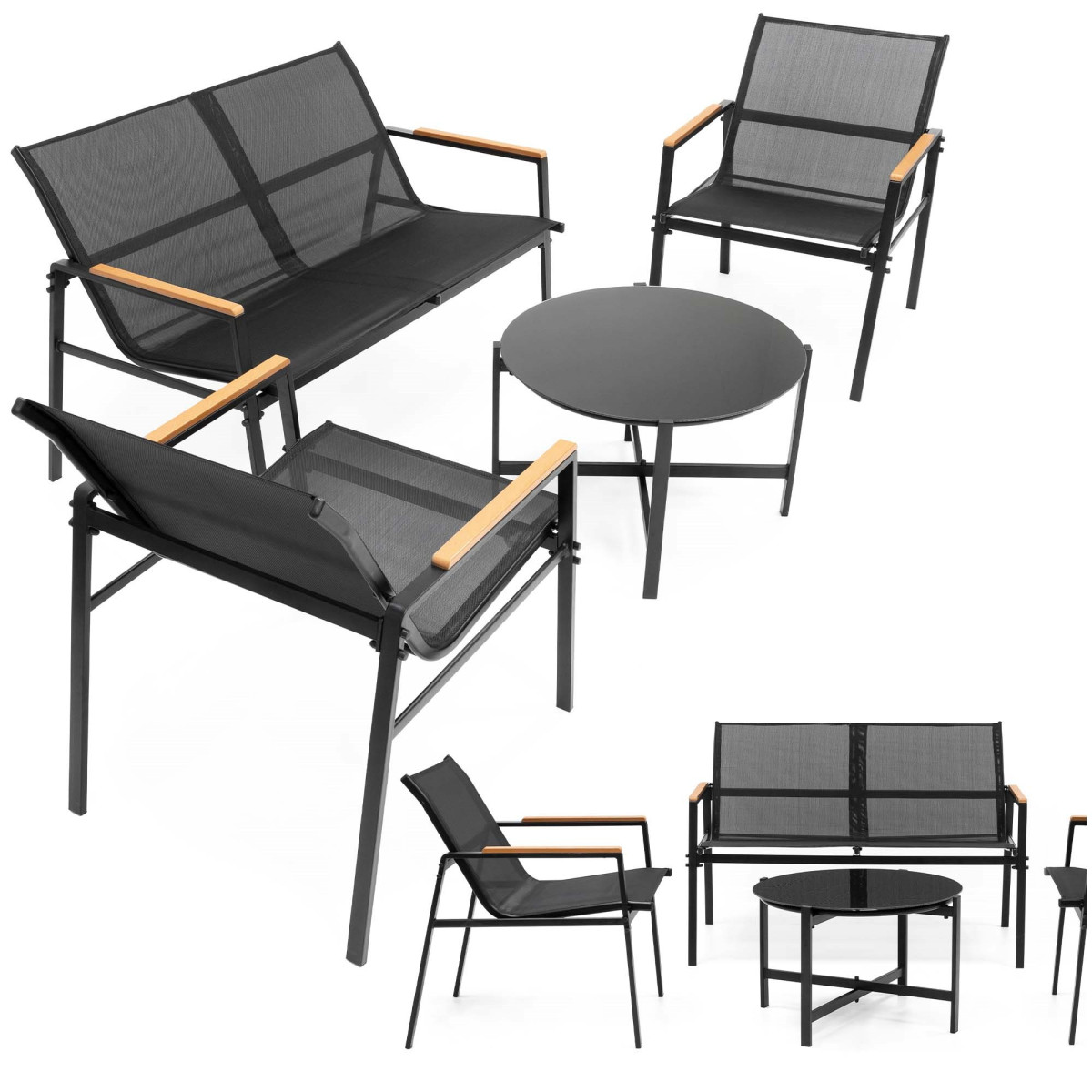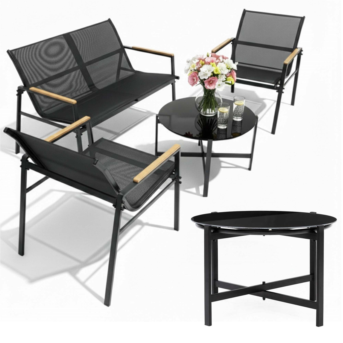 Sodo baldų komplektas GF0120 – tai stilingas ir praktiškas pasirinkimas terasai, balkonui, sodui ar kiemui. Komplektą sudaro 4 dalys: kavos staliukas su juodu grūdintu stiklu, 2 kėdės ir dvivietė sofa. Juodos spalvos baldai lengvai dera prie įvairios lauko aplinkos ir suteikia erdvei modernumo.