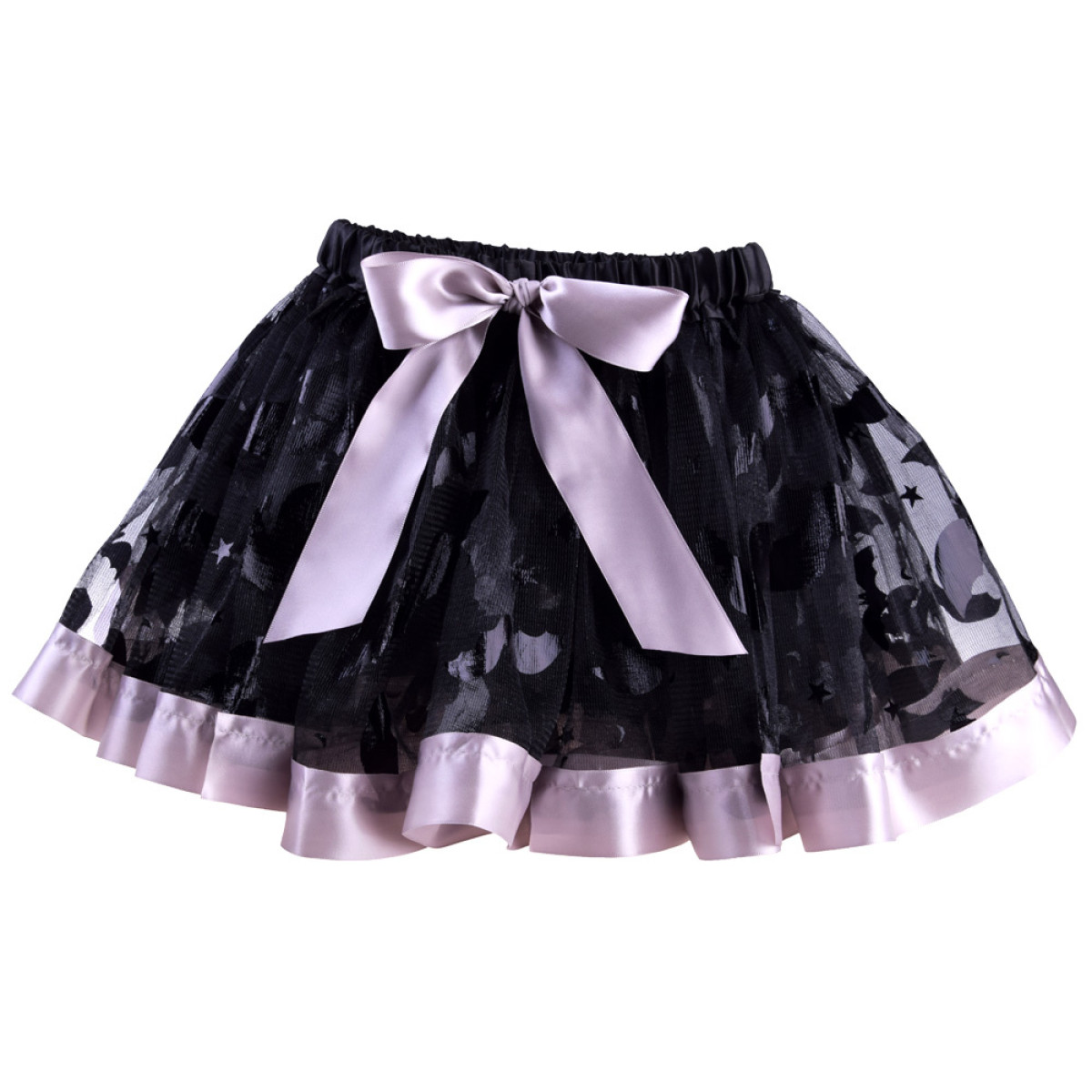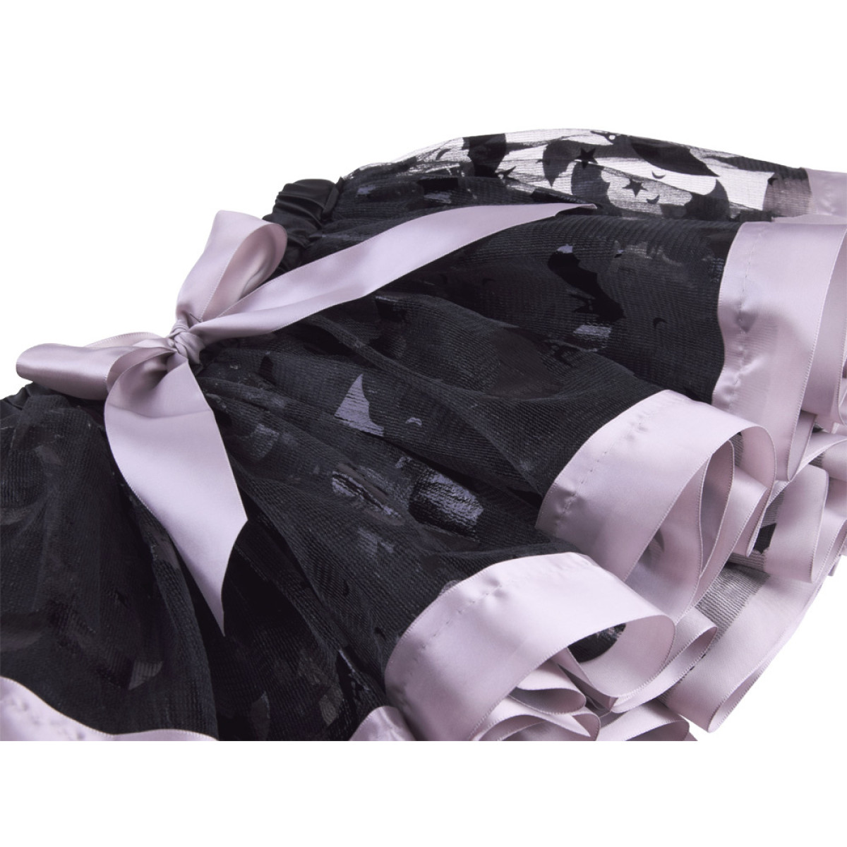 - juodas sijonėlis su sidabriniais satino kraštais ir šikšnosparnių bei žvaigždžių raštais,