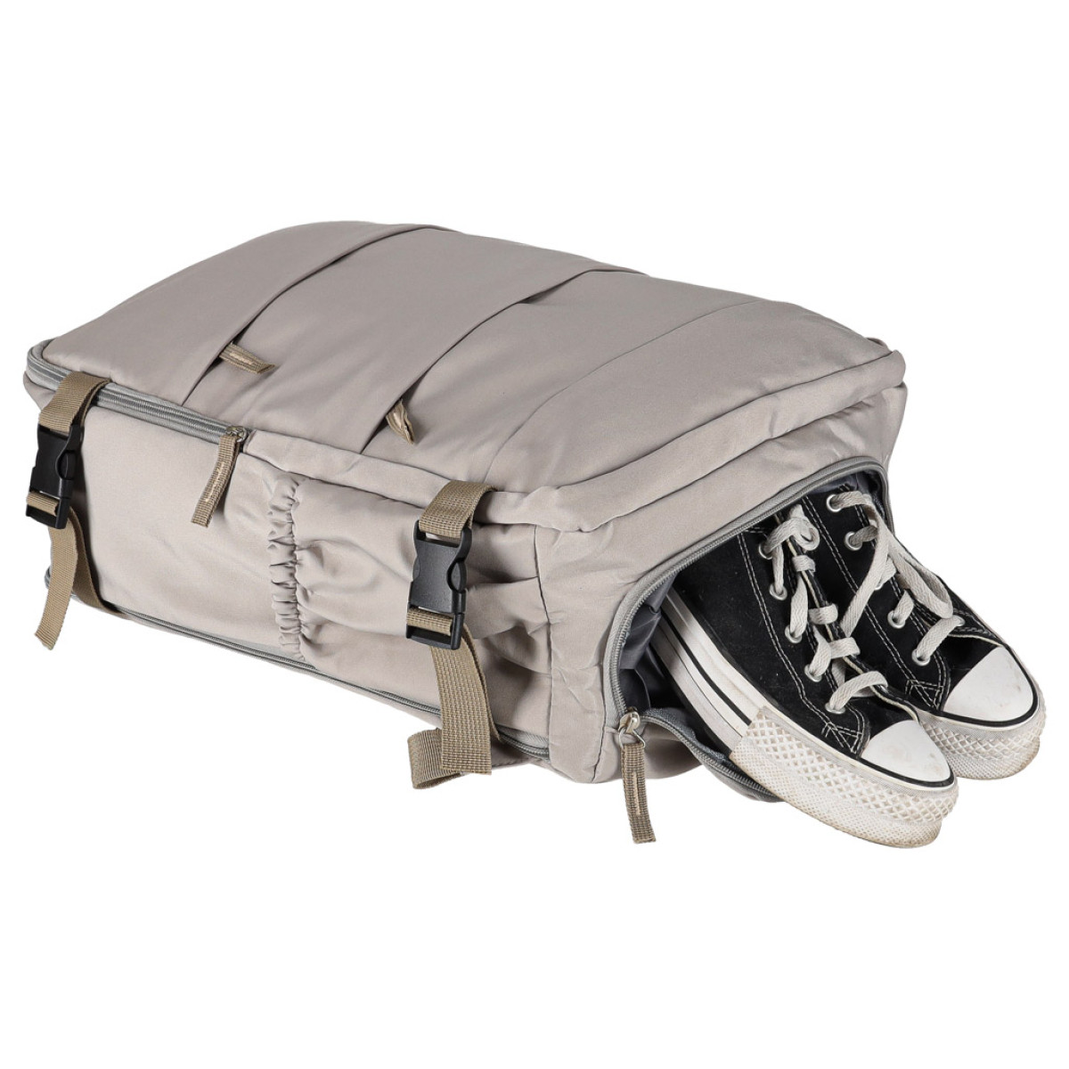• Galima suspausti, kad tilptų į bagažą – kuprinis turi užsegamus suspaudimo diržus, kurie leidžia pritaikyti bagažo dydį prie transporto priemonės.