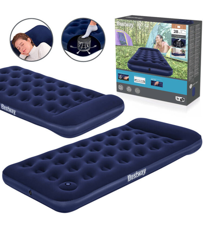 Bestway Air Mattress Twin yra puikus pasirinkimas tiems, kurie vertina komfortą ir patogumą. Čiužinys pagamintas iš patvarios medžiagos, todėl yra atsparus pažeidimams. Jo patogus paviršius miegui, tvirta konstrukcija ir integruota pagalvė užtikrina komfortišką poilsį. Stabilumas garantuojamas vidine coil-beam konstrukcija, kuri jungia apatinę ir viršutinę čiužinio dalis horizontaliosiomis vamzdeliais. Didžiulis privalumas yra integruota pėdinė pompa, leidžianti greitai pripūsti čiužinį bet kurioje vietoje. Čiužinys puikiai tinka naudoti namuose, taip pat poilsiaujant prie jūros, stovyklaujant ar miegant lauke po palapine. Viršutinė čiužinio dalis padengta minkštu viniliniu audiniu.