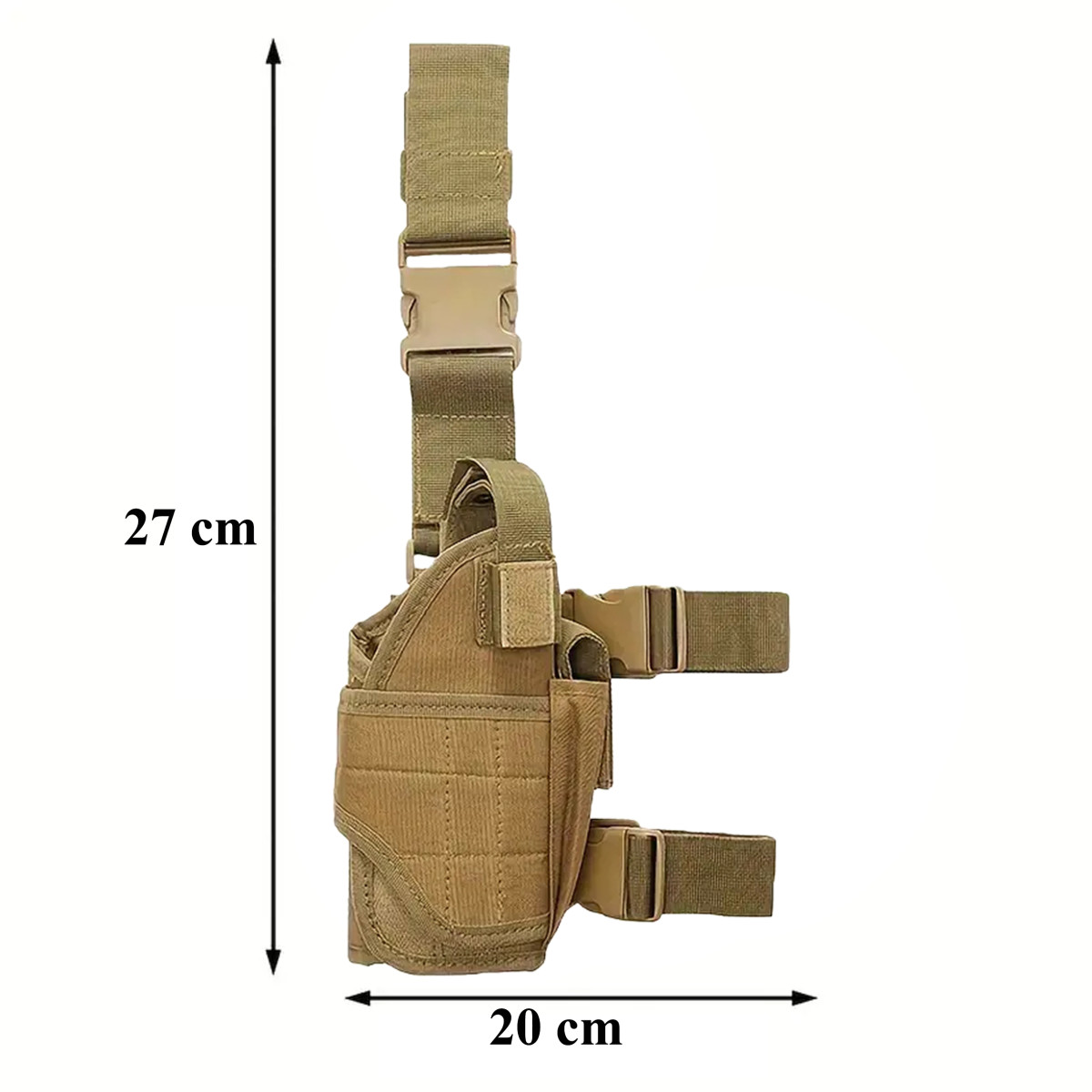 Universalus šlaunų dėklas pistoletui, pagamintas iš patvaraus poliesterio. Jis tvirtinamas prie šlaunies dviem elastingomis ir reguliuojamomis juostomis.