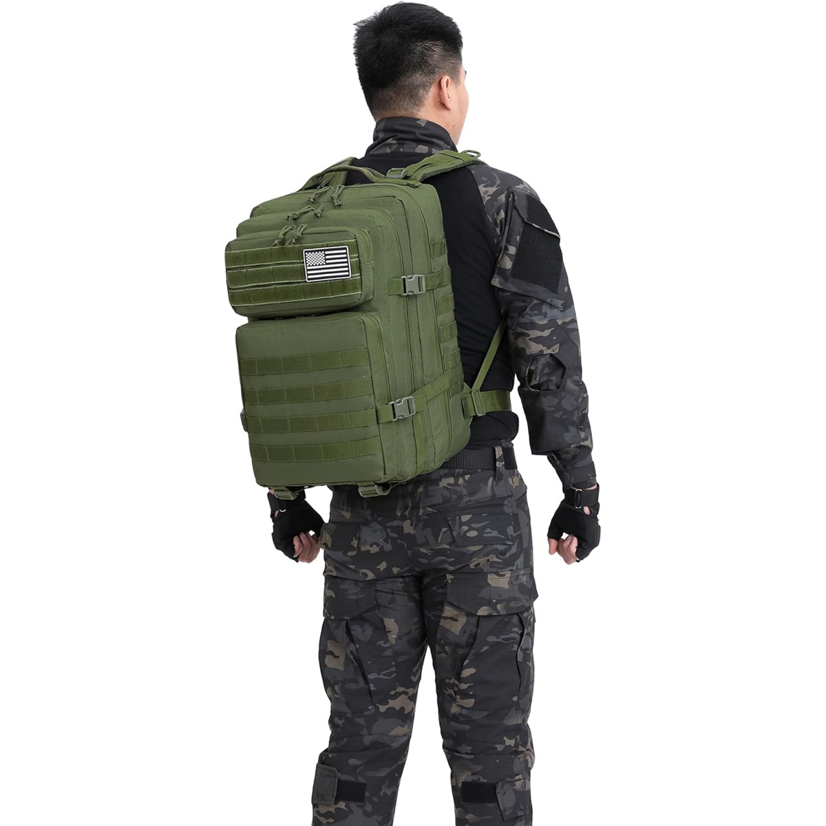 Didelė 45 litrų talpos taktinis turistinis kuprinė idealiai tinka įvairioms veikloms: miesto pasivaikščiojimams, išlikimui, kariniams pratimams ir turizmui. Pagaminta iš tvirto 800D poliesterio, atsparaus trinčiai ir plyšimui. Viduje yra PVC vandeniui atspari medžiaga, kuri padidina apsaugą nuo lietaus. Polipropileno siūlai užtikrina ilgaamžiškumą.