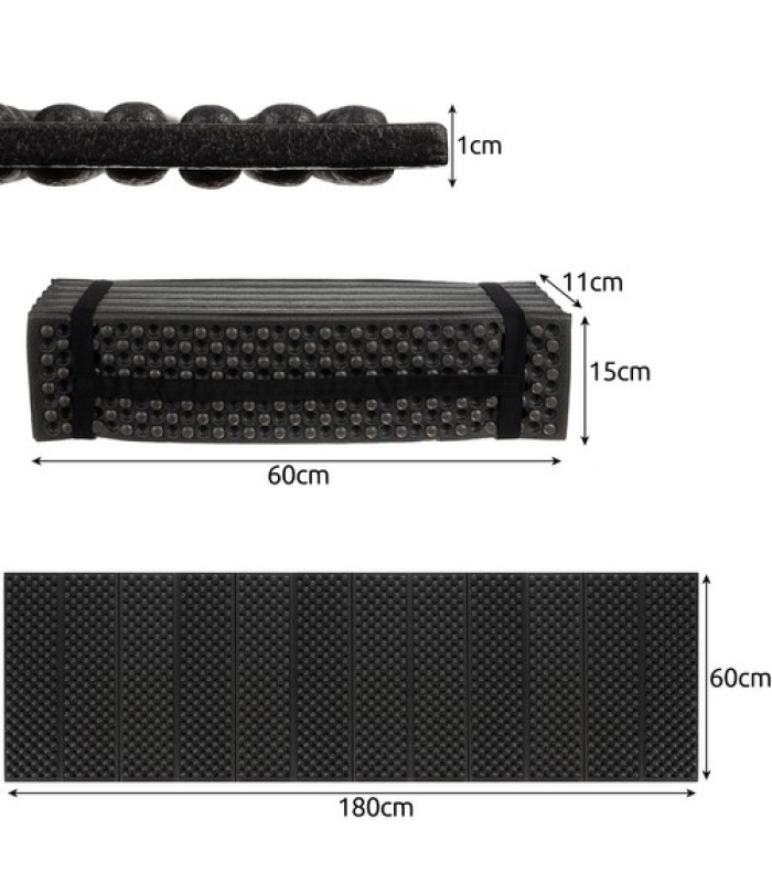 - SPECIFIKACIJA – medžiaga: XPE; lengvas sulankstymas: taip; atsparus vandeniui; išmatavimai: 180 x 60 x 1 cm;išmatavimai sulankus: 15 x 60 x 11 cm; svoris: 0,324 kg; svoris pakuotėje: 0,355 kg.