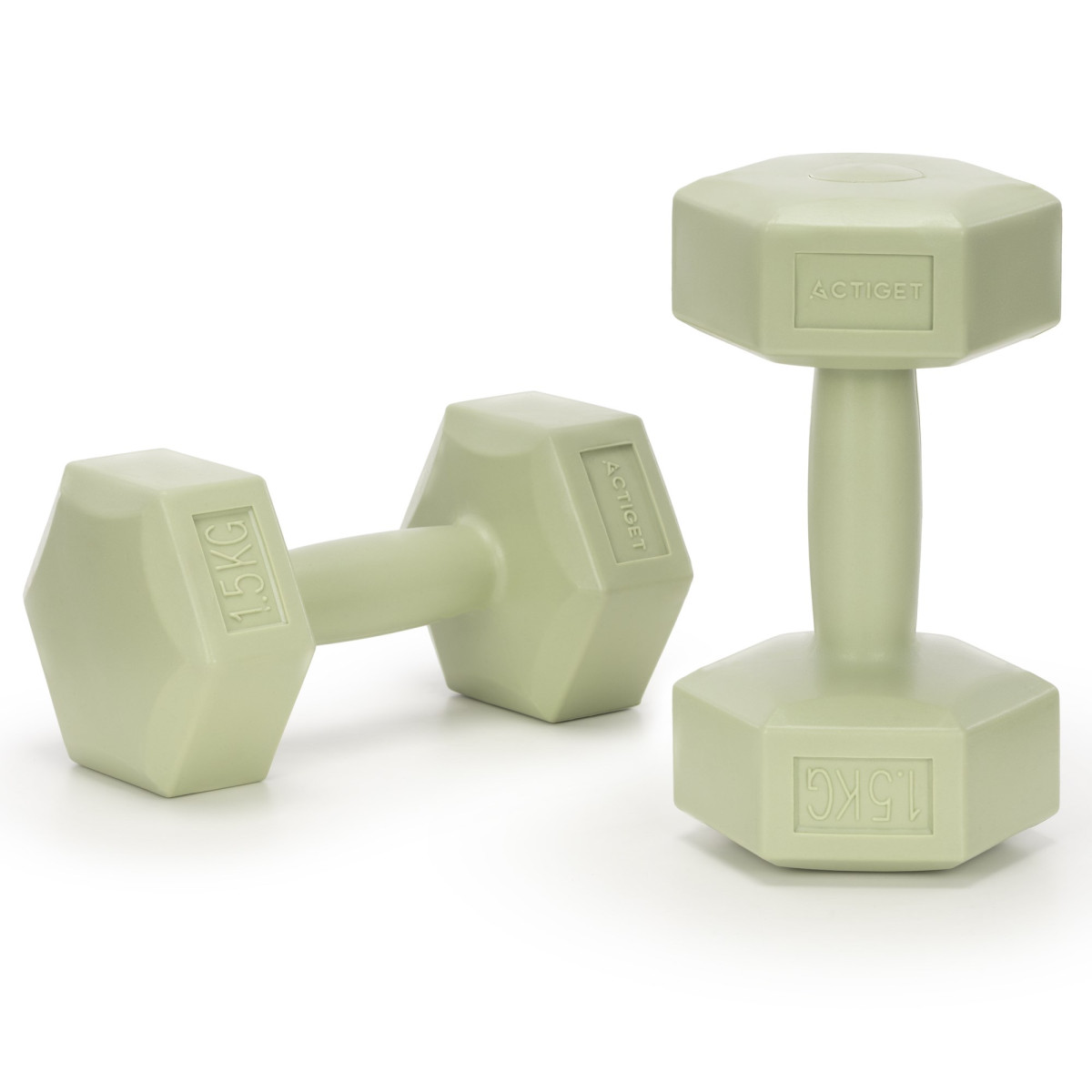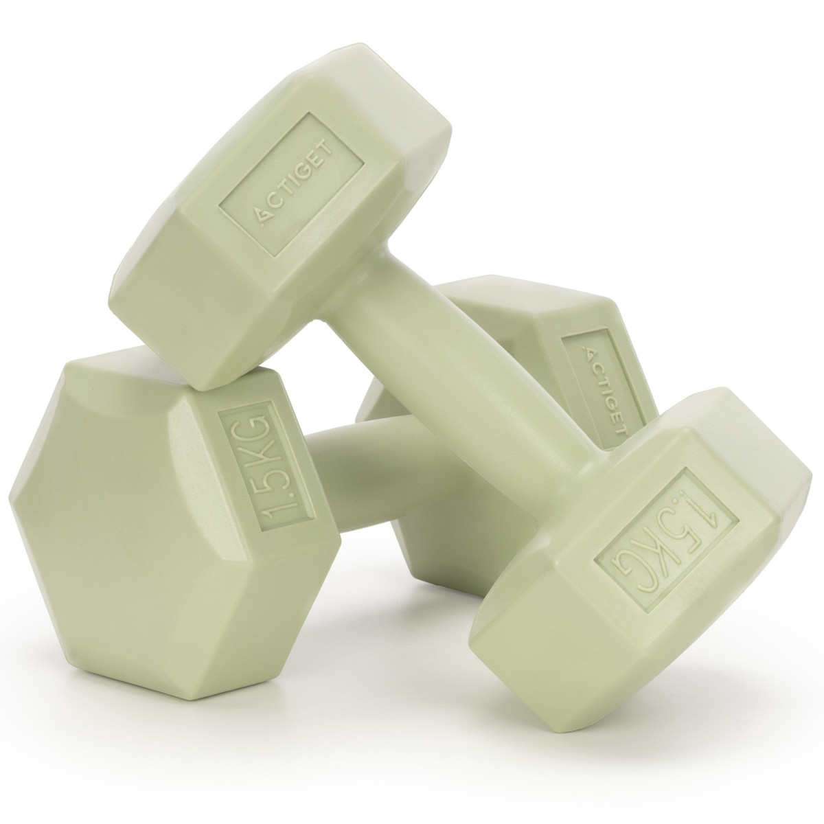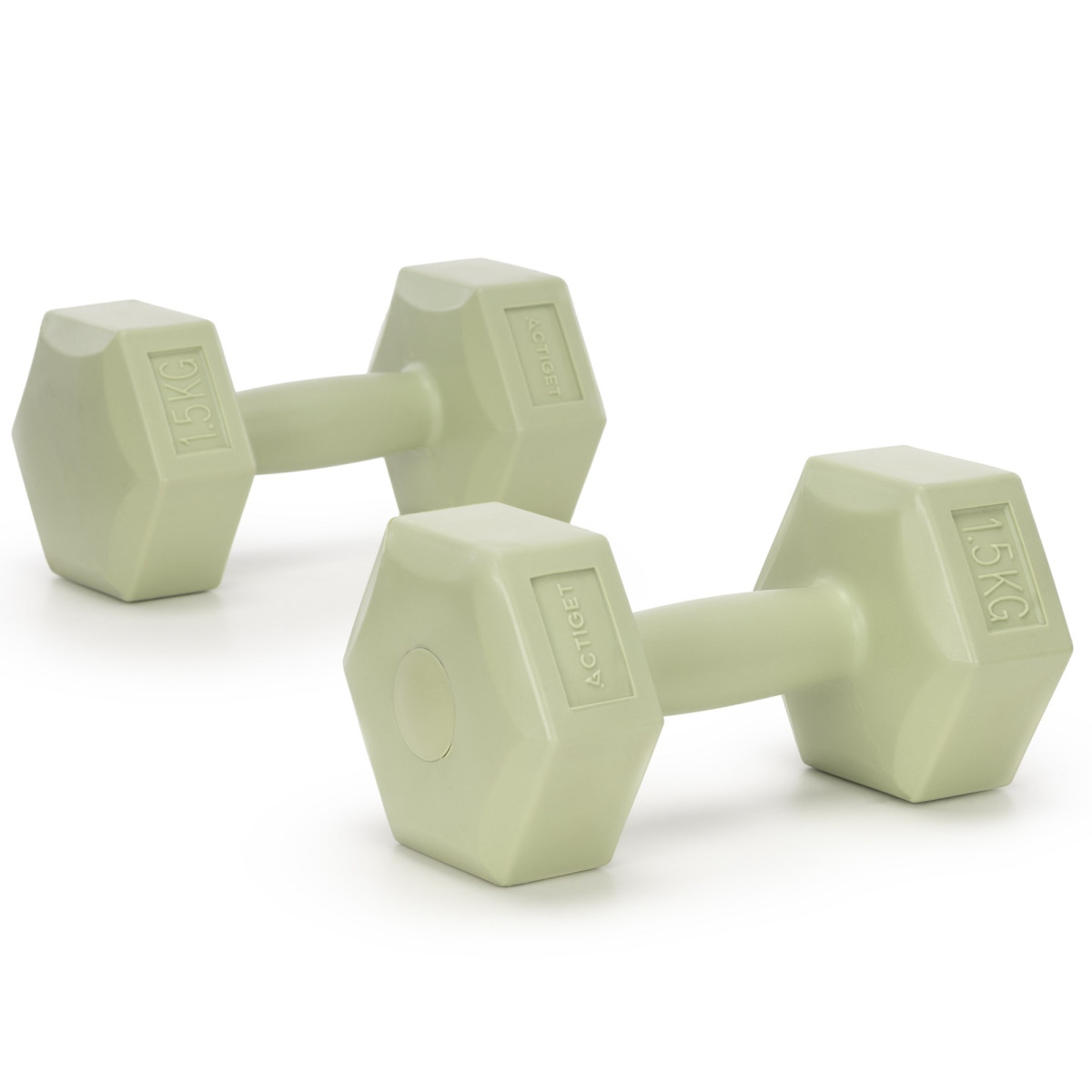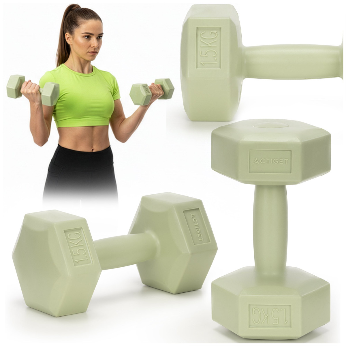 2 x 1,5 kg šešiakampės hantelės treniruotėms, 2 žalios svorių komplektas