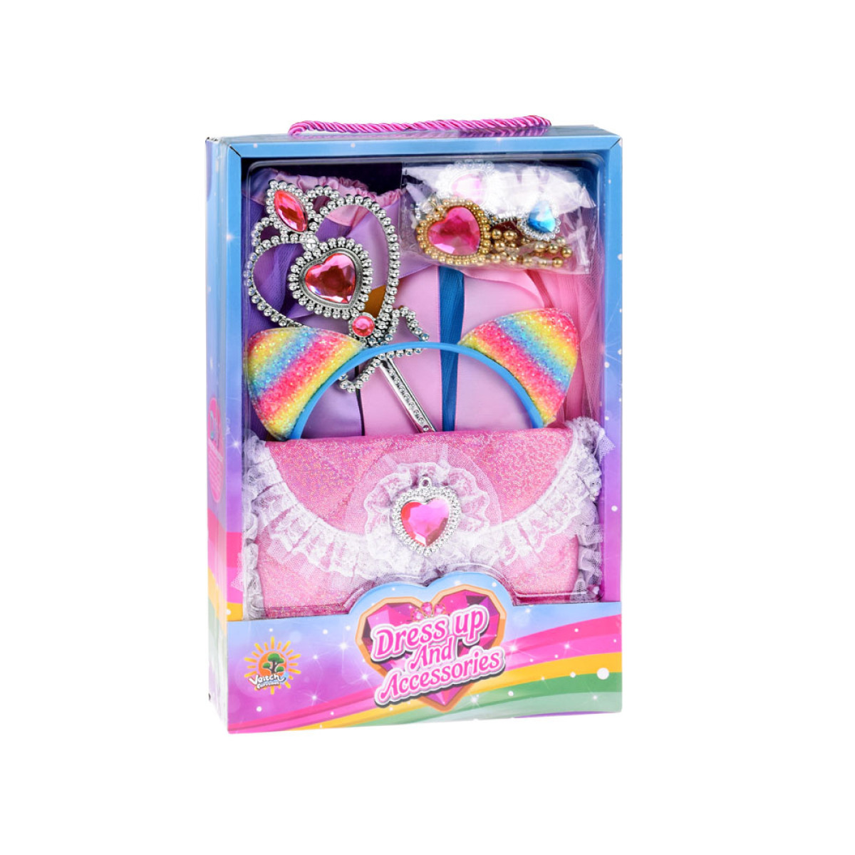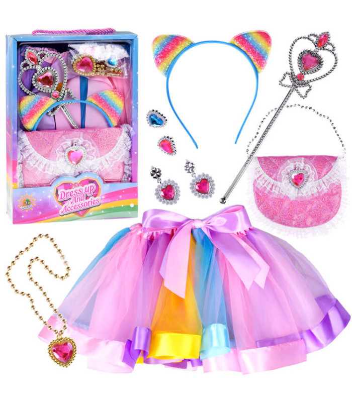 Spalvingas papuošalų rinkinys su raukiniais sužavės kiekvieną mažą mergaitę. Rinkinys, kuriame yra tiulinė, raukiniuota sijonėlė su gumos juosta, rankinė, lazdelė ir papuošalų komplektas, puikiai tiks kiekvienai darželio šventei, gimtadieniui ar pasirodymui.