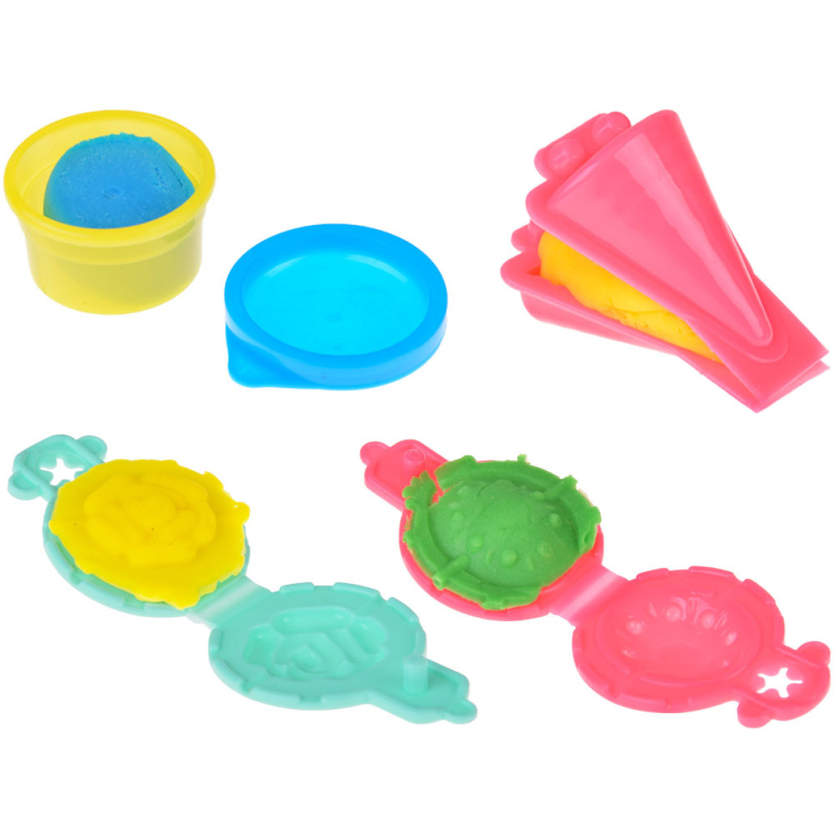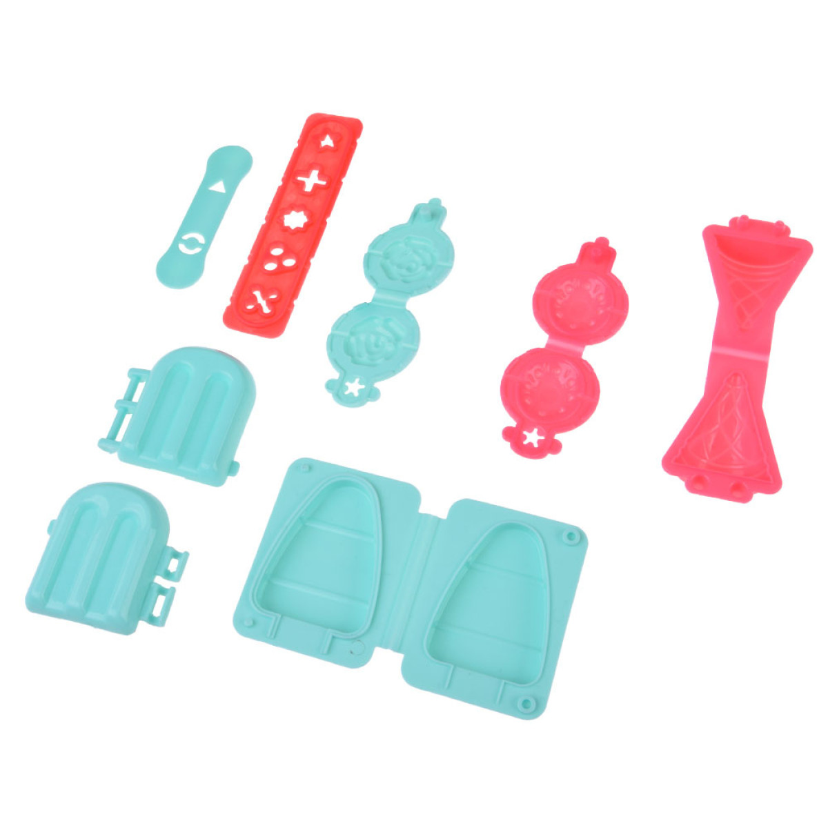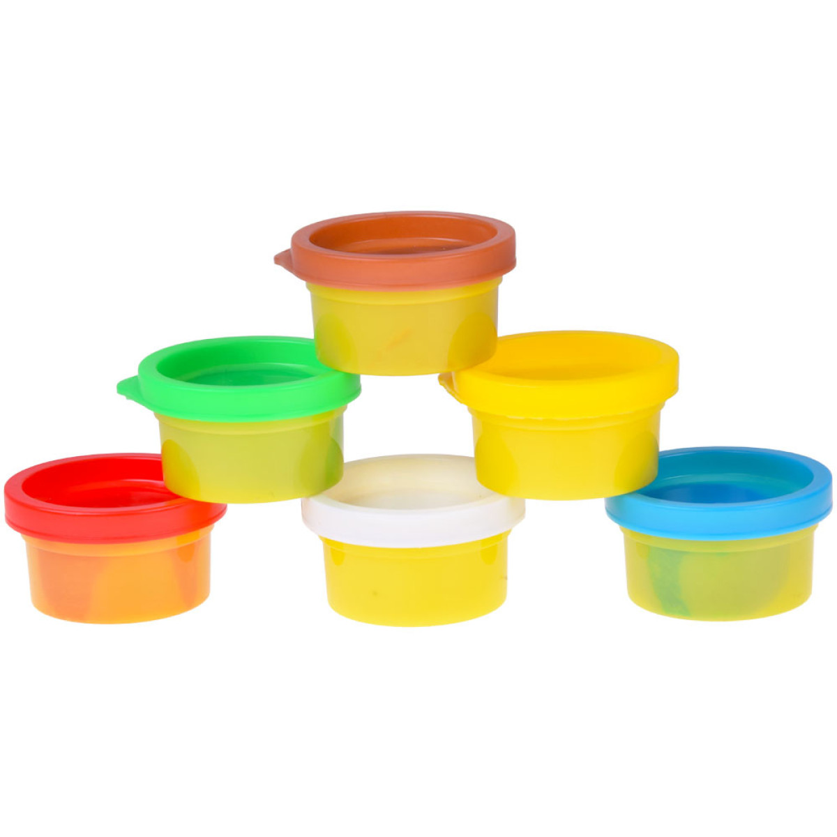 - Šeši skirtingi plastilino spalvų masės, leidžiantys kurti įvairias formas ir desertus.