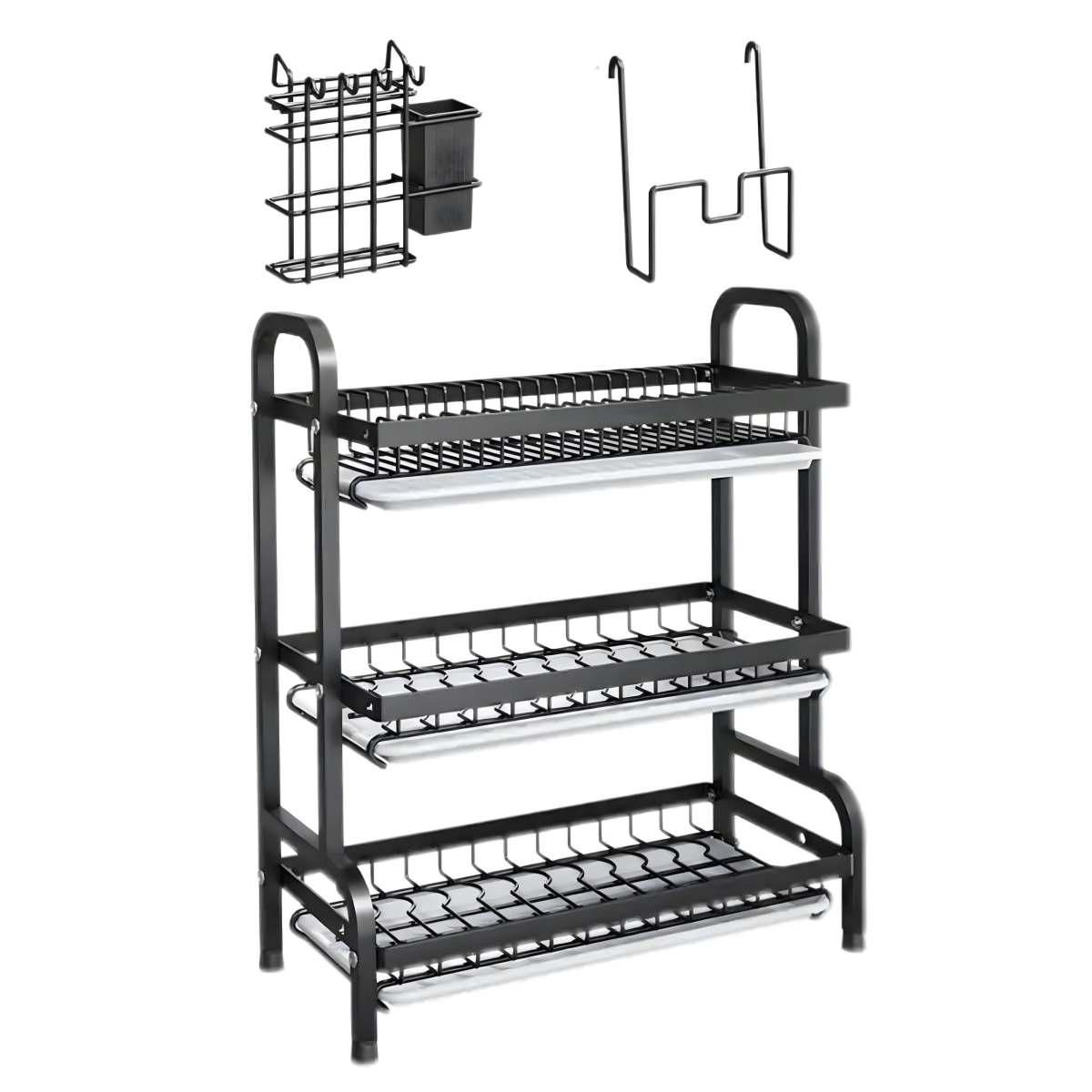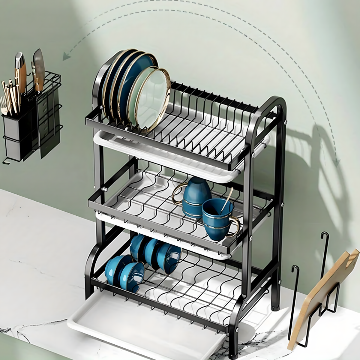 Trijų lygių indų džiovyklė su stovo laikikliu