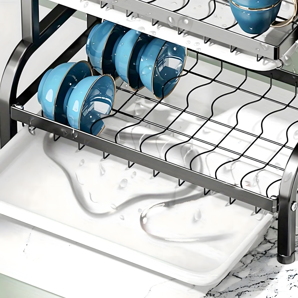 Funkcionalumas ir elegancija: ši džiovyklė pasižymi tvirta, trijų lygių konstrukcija, pagaminta iš nerūdijančio plieno, atsparaus rūdims ir lengvai valoma. Ji turi stovo laikiklį, stalo įrankių dėklą ir lašų padėklus. Kompaktiški matmenys ir modernus dizainas leidžia puikiai derėti bet kurioje virtuvėje.