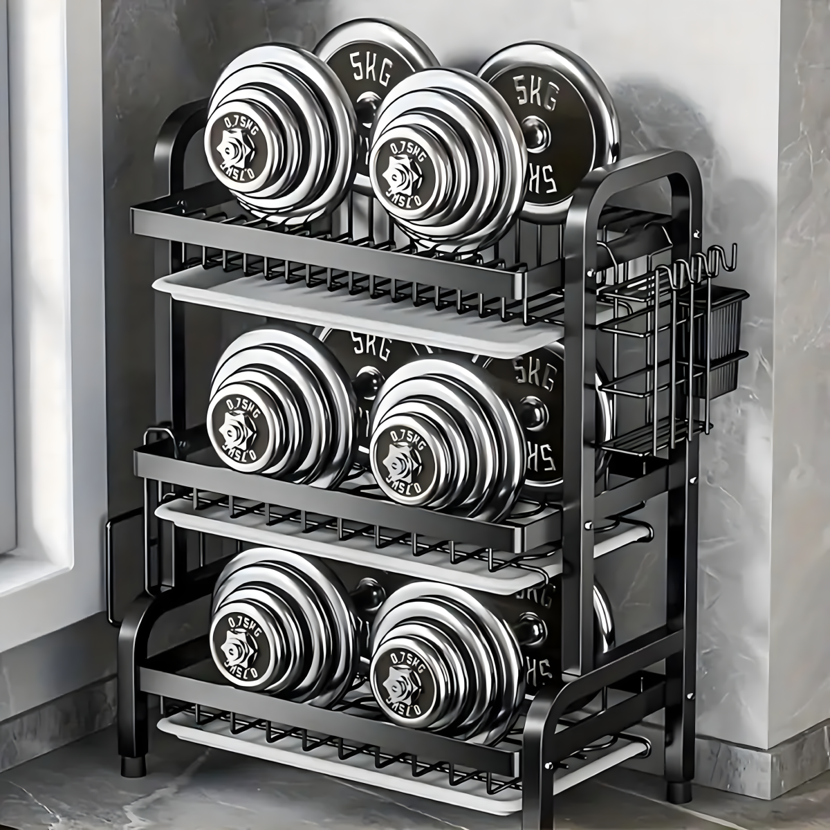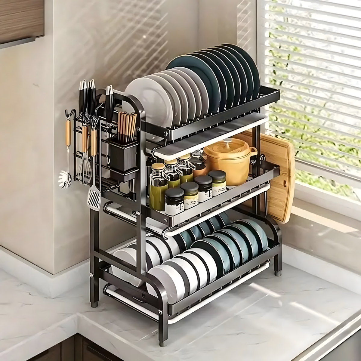 Trijų lygių indų džiovyklė XXL – juoda, nerūdijantis plienas.