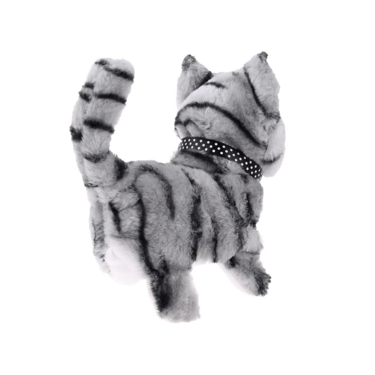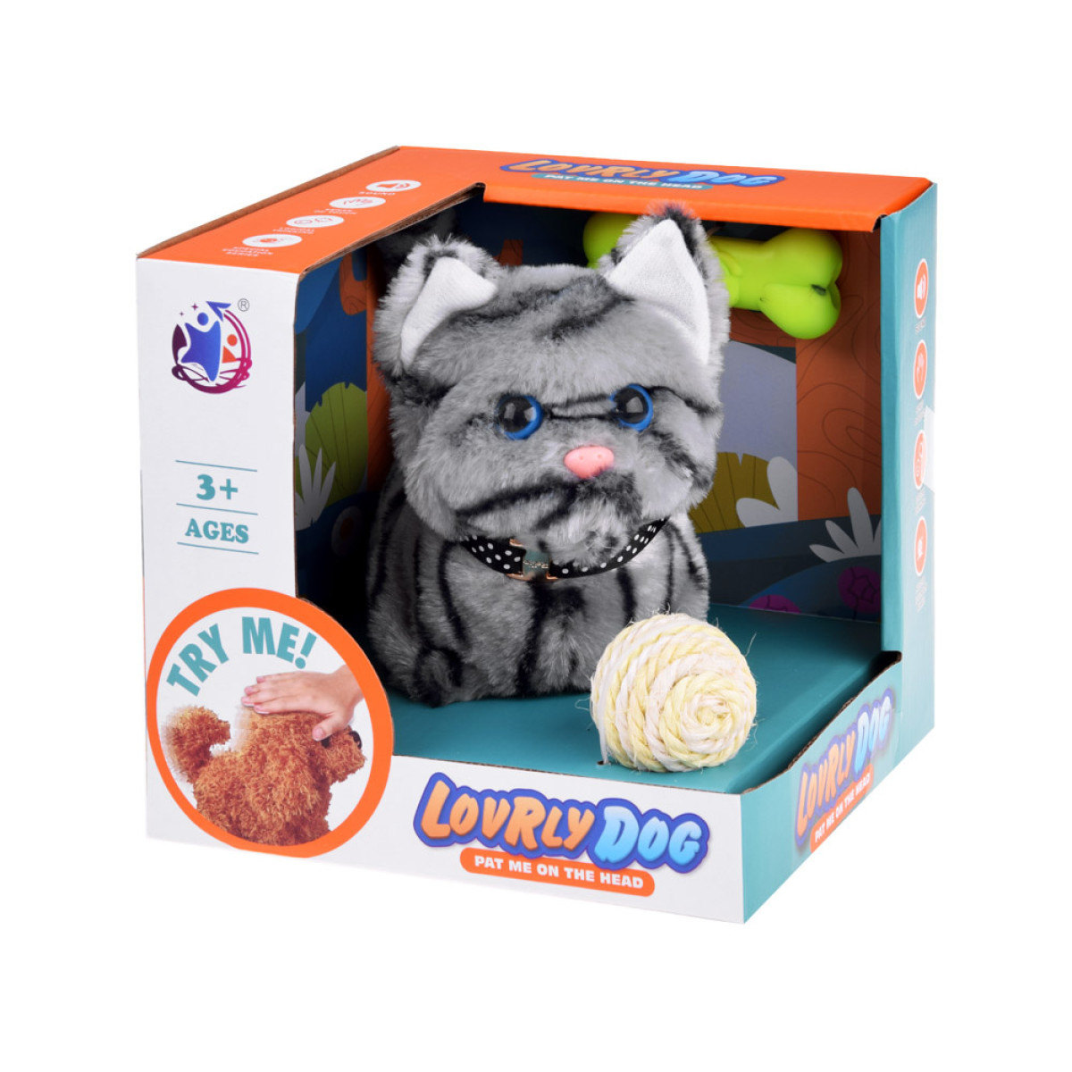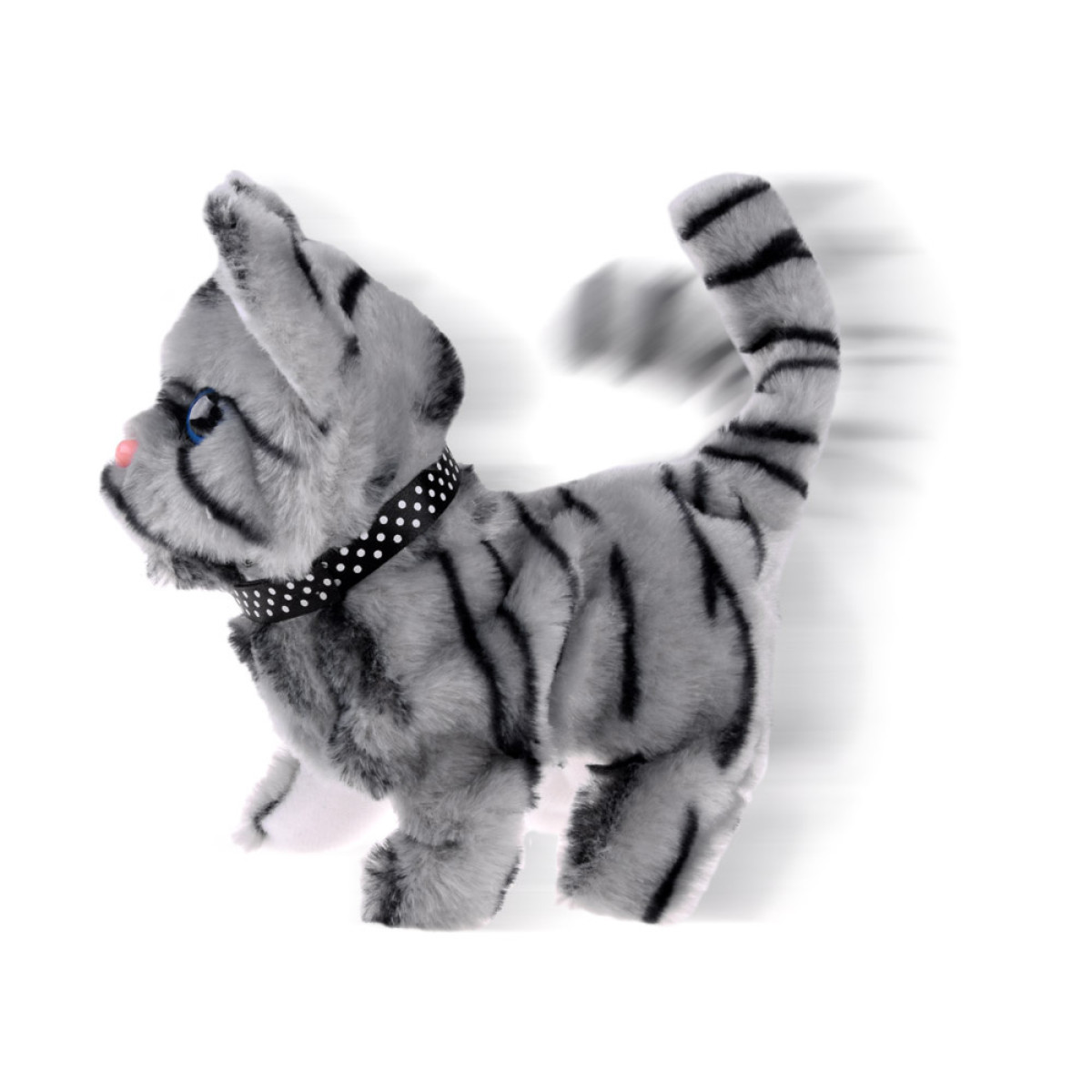 Šis mielas interaktyvus katinėlis taps nuostabiu draugu kiekvienam vaikui. Katinėlis turi minkštą pilką kailiuką su juodomis juostelėmis, rožinę nosytę, mėlynas akytes ir juodą apykaklę su baltais taškeliais bei auksine puošmena. Žaislas veikia su baterijomis, kurios leidžia katinėliui miaukti, eiti į priekį, grįžti atgal, judinti galvą, snukutį ir uodegą. Be to, katinėlis pasižymi žaisminga minkšta, guminė žalia kauliuko forma bei spalvotu kamuoliuku, apvyniotu siūlu.
