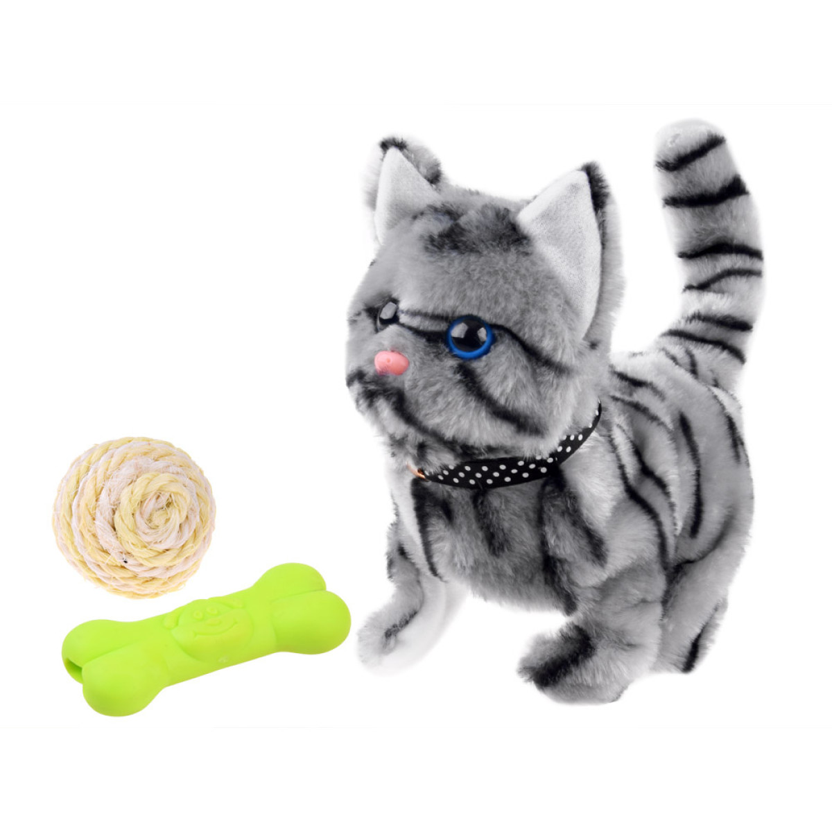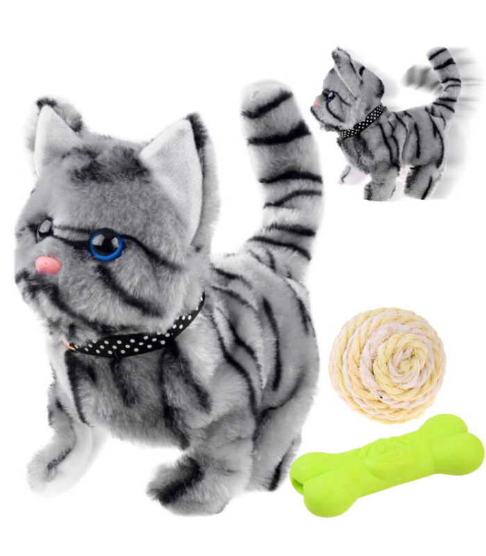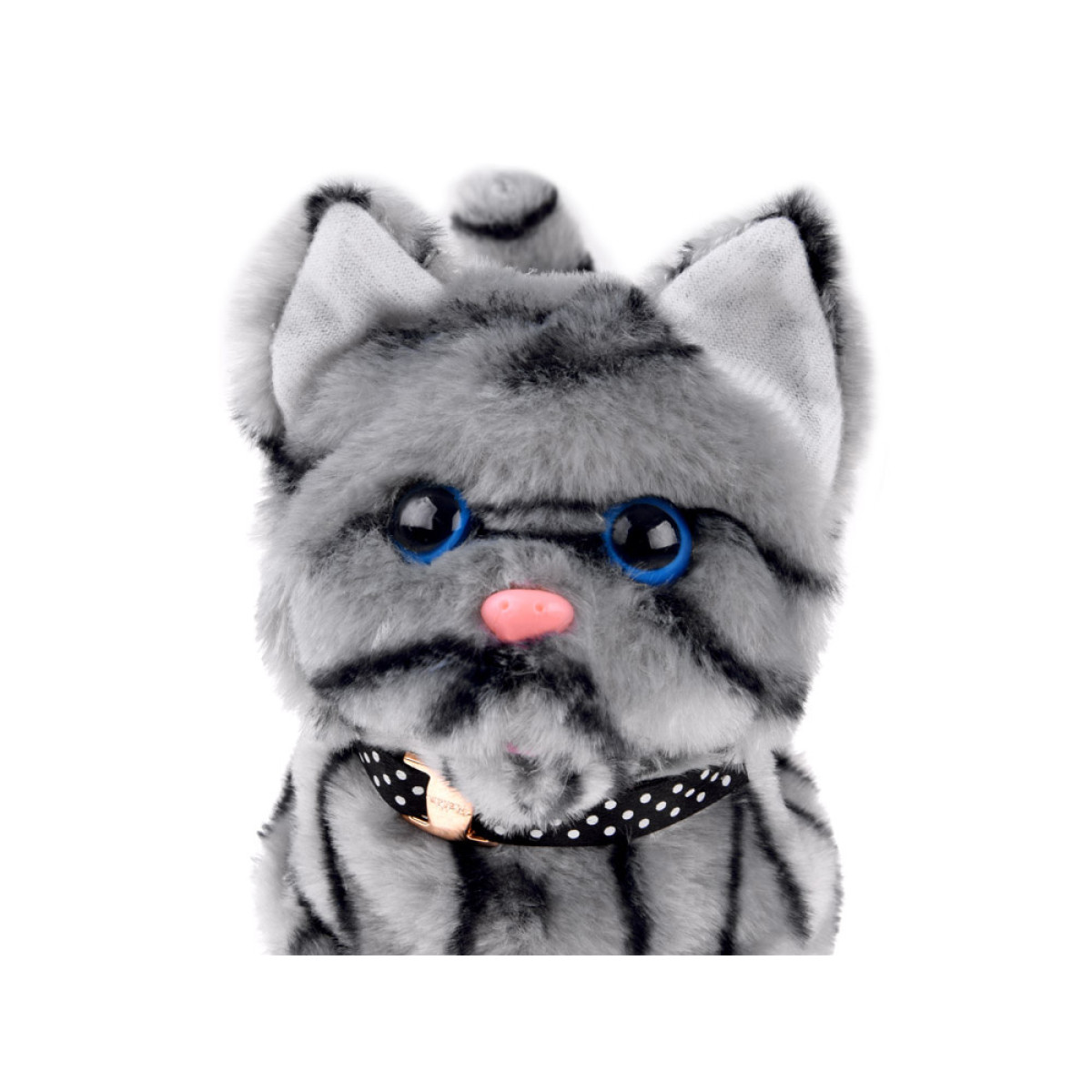 Šis mielas interaktyvus katinėlis taps nuostabiu draugu kiekvienam vaikui. Katinėlis turi minkštą pilką kailiuką su juodomis juostelėmis, rožinę nosytę, mėlynas akytes ir juodą apykaklę su baltais taškeliais bei auksine puošmena. Žaislas veikia su baterijomis, kurios leidžia katinėliui miaukti, eiti į priekį, grįžti atgal, judinti galvą, snukutį ir uodegą. Be to, katinėlis pasižymi žaisminga minkšta, guminė žalia kauliuko forma bei spalvotu kamuoliuku, apvyniotu siūlu.