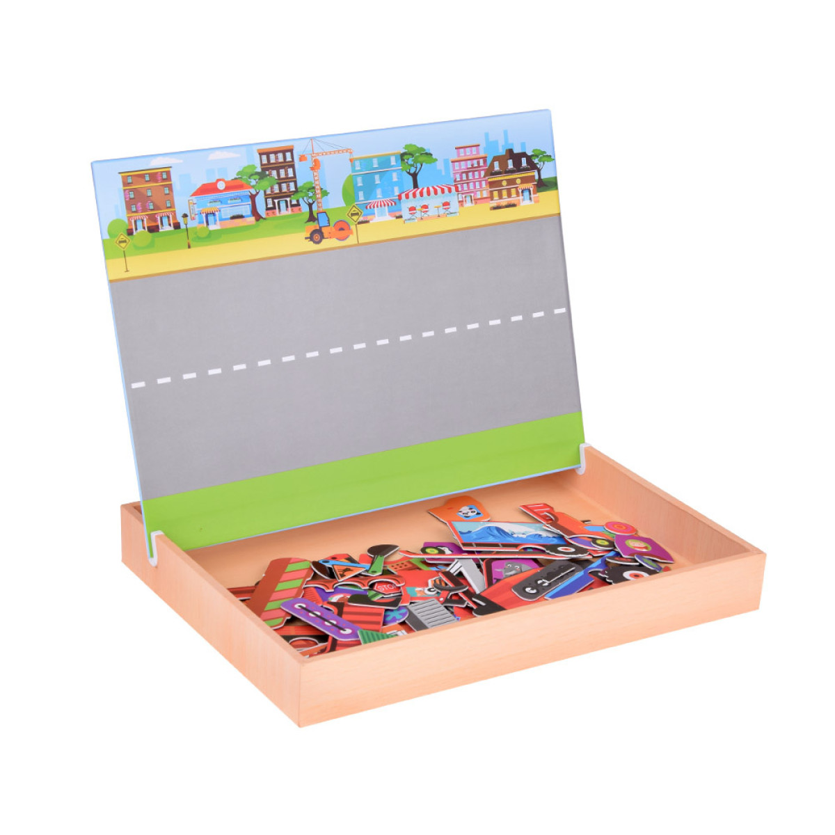 Ją sudaro magnetinės dėlionės, vaizduojančios statybos transporto priemones, tokias kaip: kranas, traktorius su priekaba, buldozeris, savivartis, taip pat paviršius piešimui sausu rašikliu. Vaikai gali atkurti transporto priemonių modelius arba kurti savo kompozicijas, lavindami vaizduotę ir motorinius įgūdžius. Lenta ne tik skatina kūrybiškumą, bet ir padeda lavinti smulkiosios motorikos įgūdžius bei akių-rankų koordinaciją.