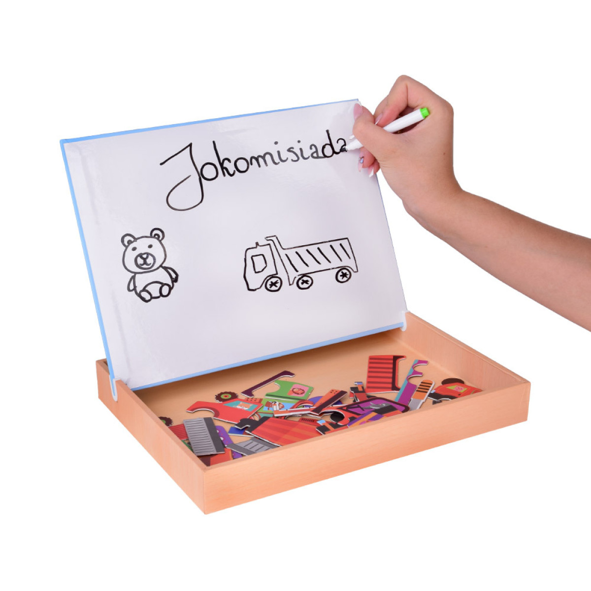 Magnetinė lenta 2in1 yra puikus edukacinis žaislas mažiesiems konstruktoriams! Vaikai gali piešti ant jos sausu rašikliu ir dėlioti magnetines dėliones su statybos transporto priemonių atvaizdais. Ši daugiafunkcinė lenta skatina kūrybiškumą, lavina motorinius įgūdžius ir vaizduotę, užtikrindama daug pramogų.