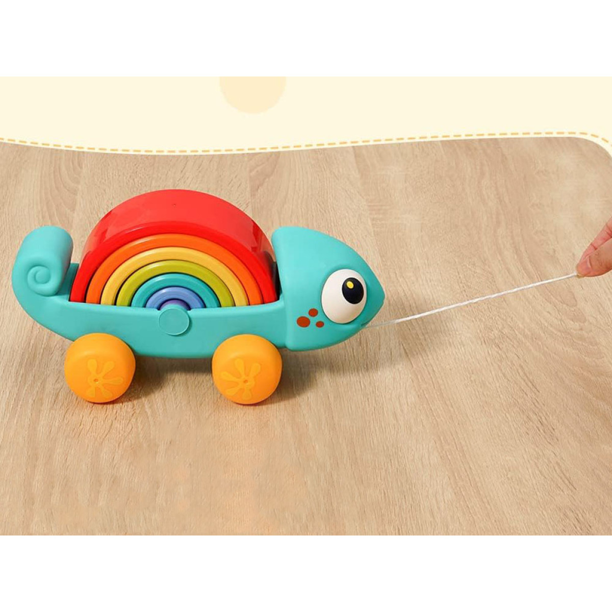 • Žaislą galima judinti traukiant už virvelės arba stumiant, taip skatindami vaiką ropoti ar vaikščioti paskui chameleoną.