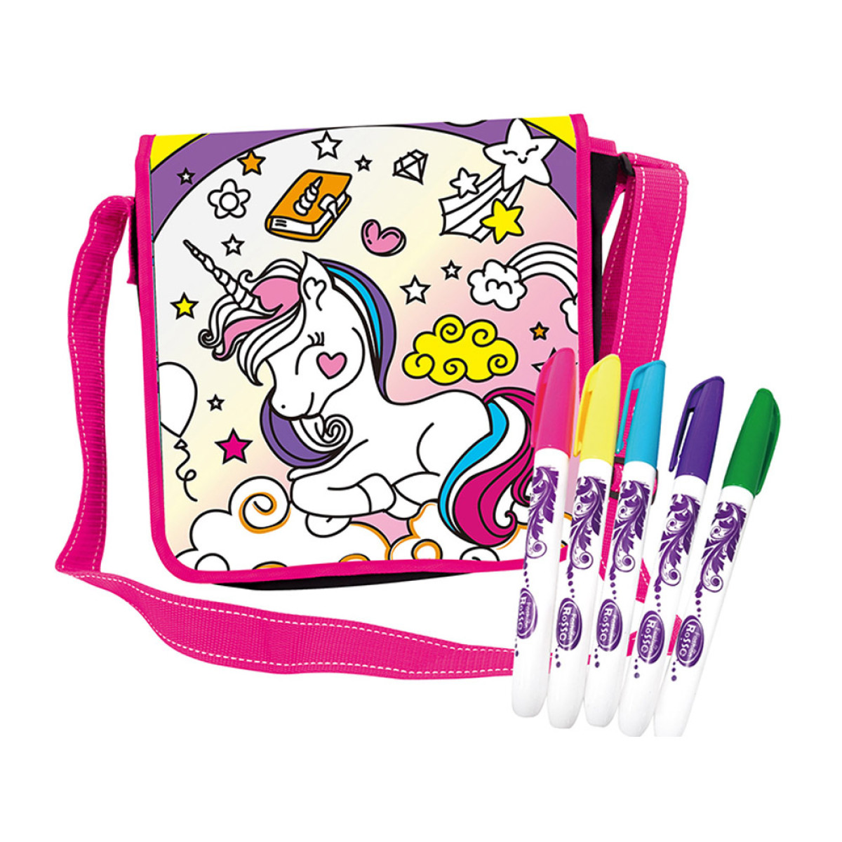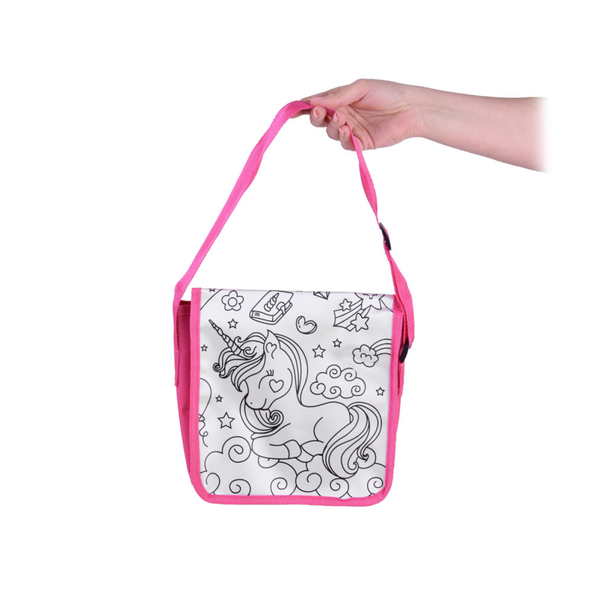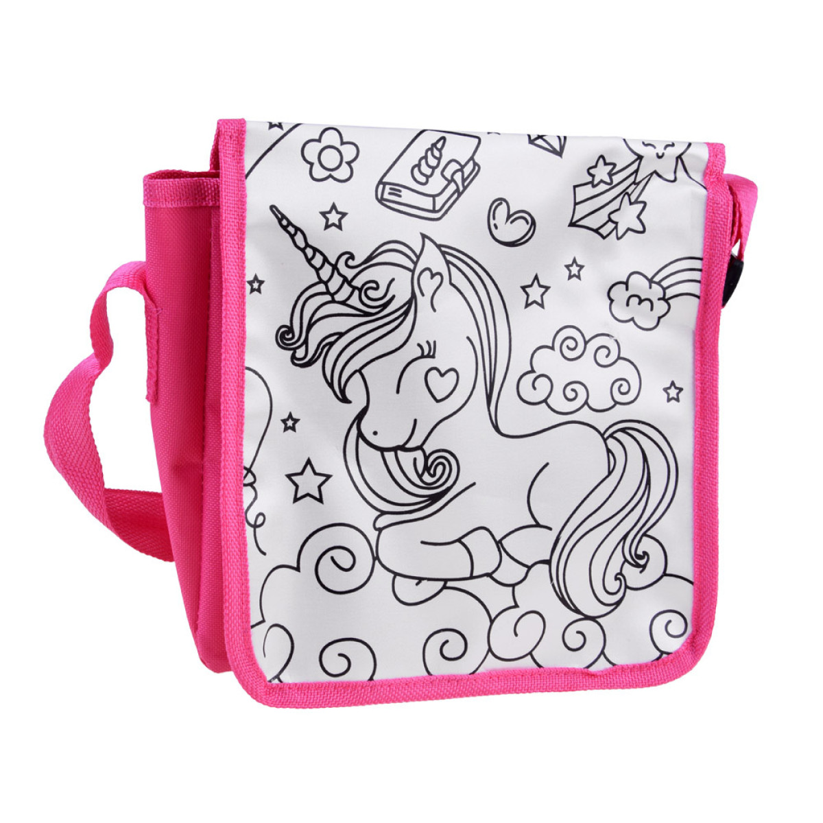 Rankinė su vienaragiu dažymui yra puiki dovana kiekvienai mažajai menininkei, mėgstančiai kūrybinius užsiėmimus. Šią rankinę galima nudažyti pagal savo unikalią idėją. Juoda grafika vaizduoja žavingą vienaragį su žvaigždutėmis, debesėliais, gėlytėmis ir kitais pasakiškais elementais. Mažasis menininkas gali sukurti nepakartojamą rankinę, naudodamas rinkinyje esančius flomasterius.