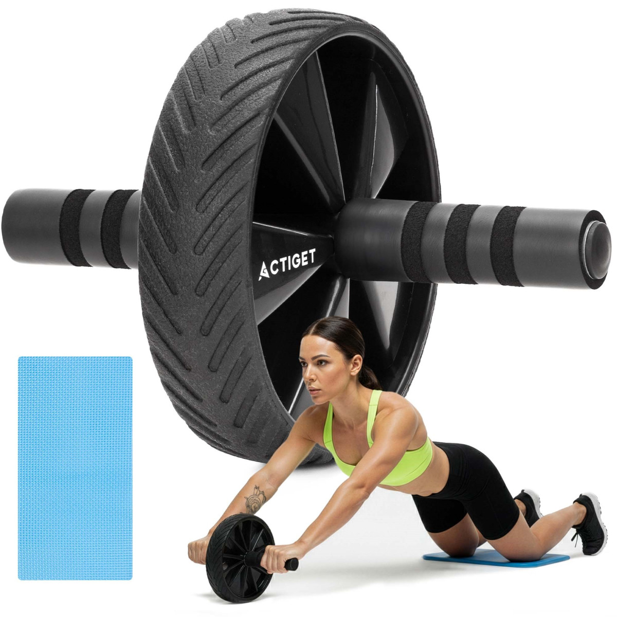 Prekės ženklas: Actiget® Ratuko spalva: juoda Kilimėlio spalva: mėlyna Medžiaga: plienas, ABS, PP, putos Maksimali apkrova: 100 kg Neslystančios rankenos Svoris: apie 475 g Komplekte yra: 1 x treniruočių ratukas su rankena 1 x kelių kilimėlis Matmenys: Ratuko skersmuo: 17,5 cm Ratuko storis: 4,5 cm Bendras rankenos ilgis: 25 cm Rankenos skersmuo: 2 cm Putų rankenos ilgis: 11 cm Putų storis: apie 0,5 cm Rankenos aukštis nuo žemės: 8,5 cm Kilimėlis: 34 x 17 x 0,8 cm (ilgis x plotis x storis) Papildoma informacija: Produktas pažymėtas Actiget® logotipu