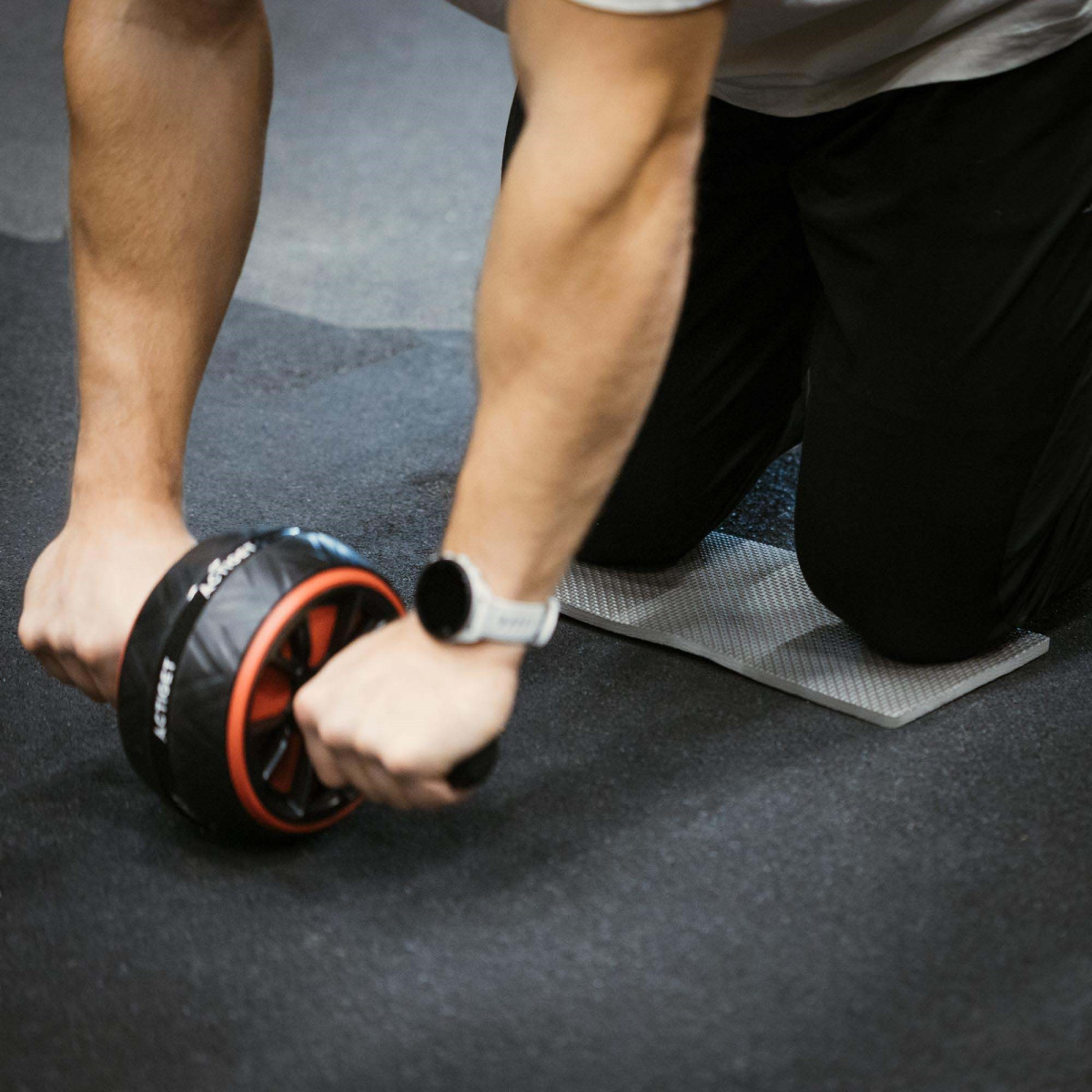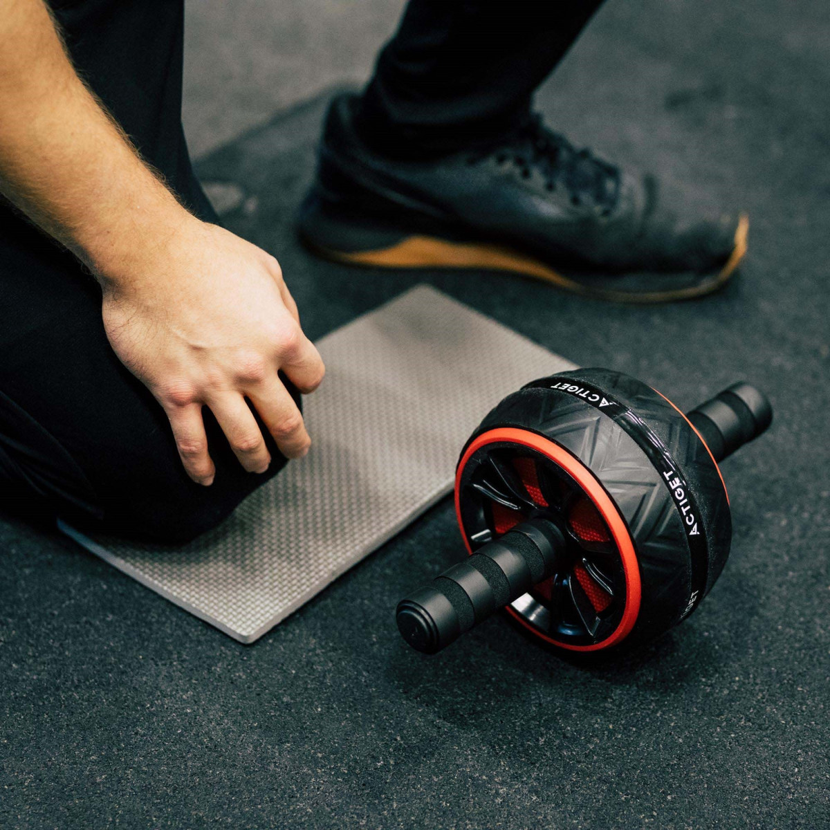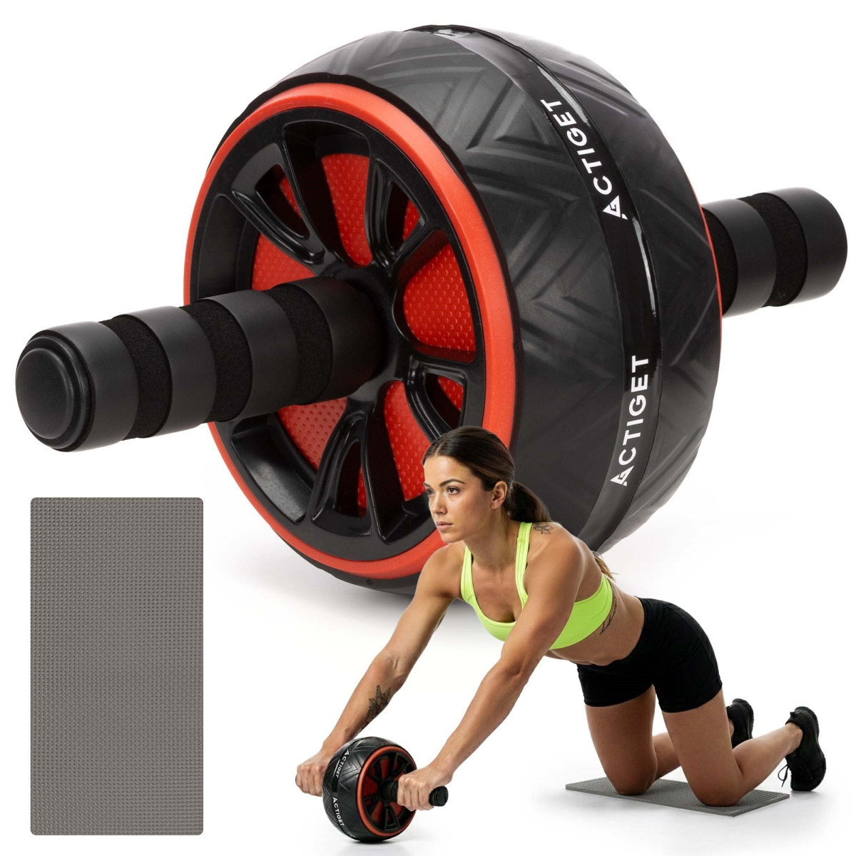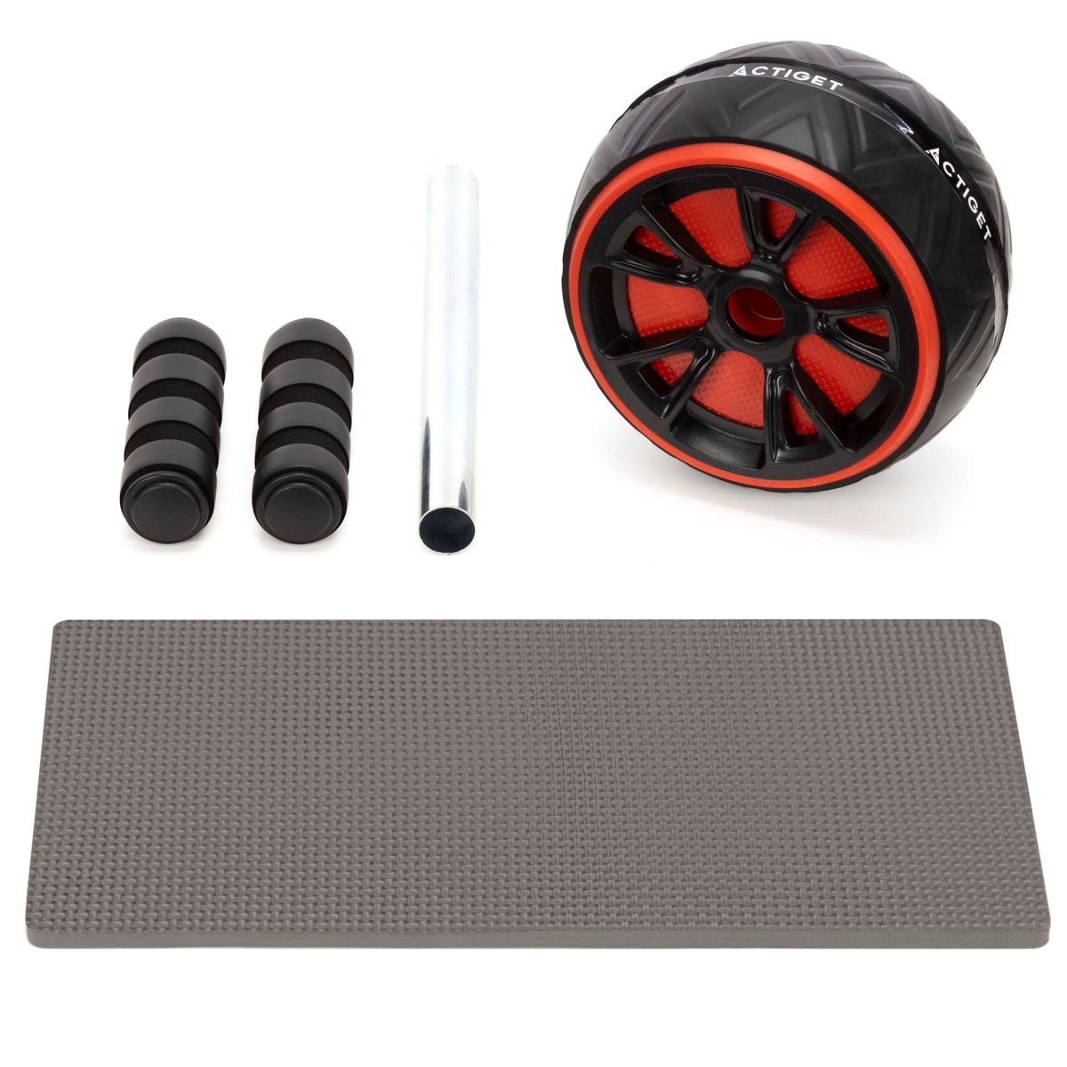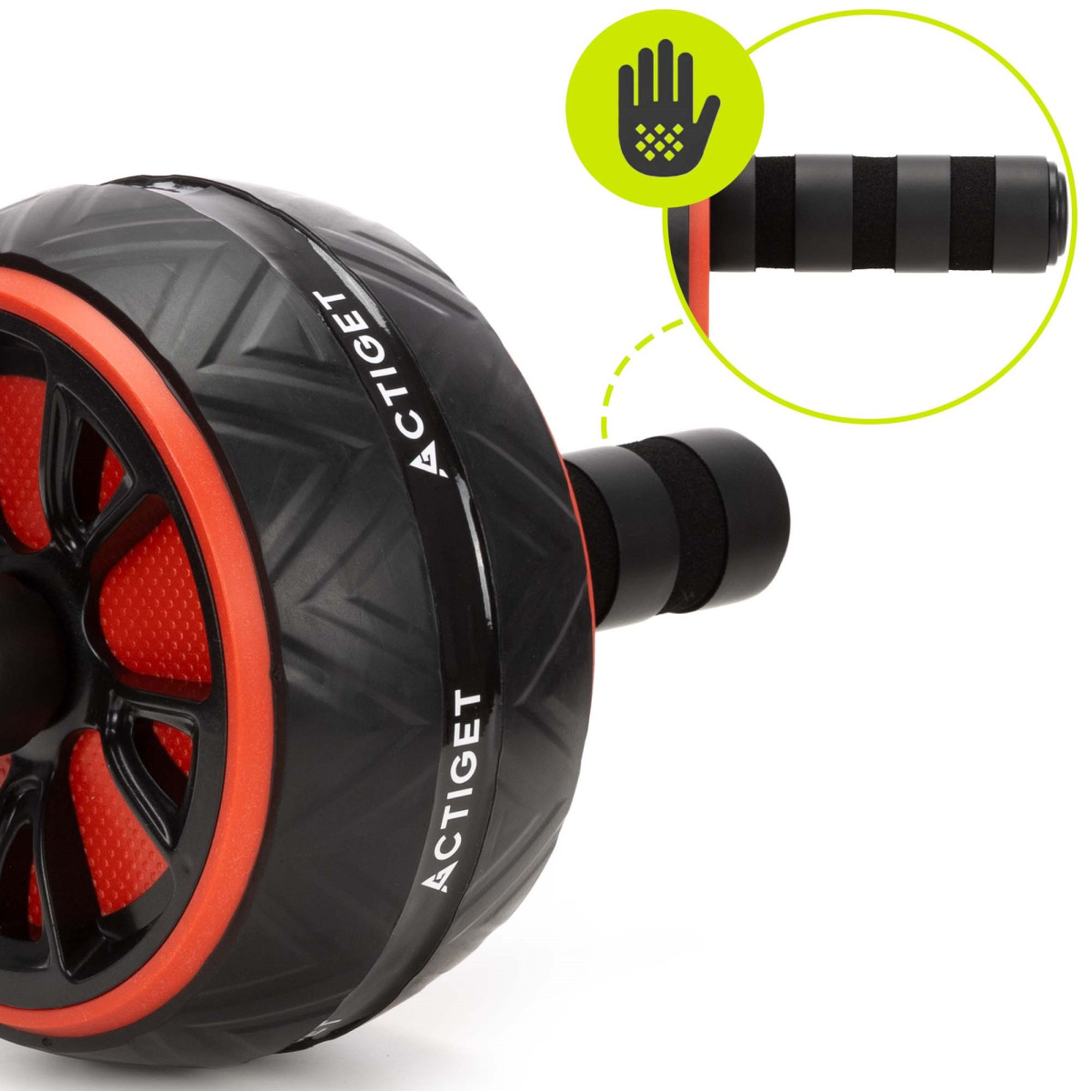 Prekės ženklas: Actiget® Ratuko spalva: juoda, raudona Kilimėlio spalva: pilka Medžiaga: plienas, ABS, PP, putos Maksimali apkrova: 100 kg Neslystančios rankenos Svoris: apie 645 g Komplekte yra: 1 x treniruočių ratukas su rankena 1 x kelių kilimėlis Matmenys: Ratuko skersmuo: 15,5 cm Ratuko storis: 8,5 cm Bendras rankenos ilgis: 24,5 cm Rankenos skersmuo: 2 cm Putų rankenos ilgis: 11 cm Putų storis: apie 0,5 cm Rankenos aukštis nuo žemės: 7 cm Kilimėlis: 34 x 17 x 0,8 cm (ilgis x plotis x storis) Papildoma informacija: Produktas pažymėtas Actiget® logotipu